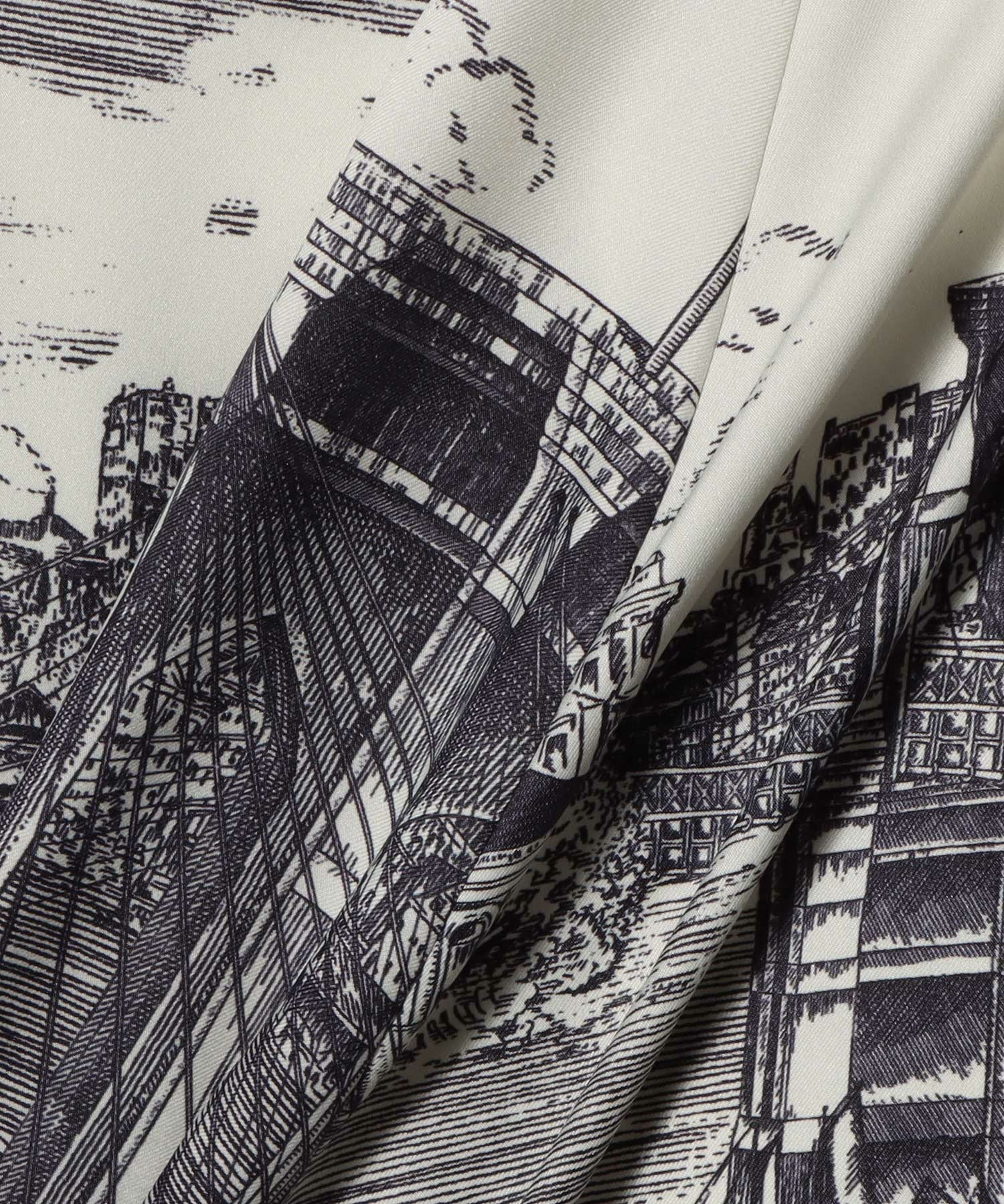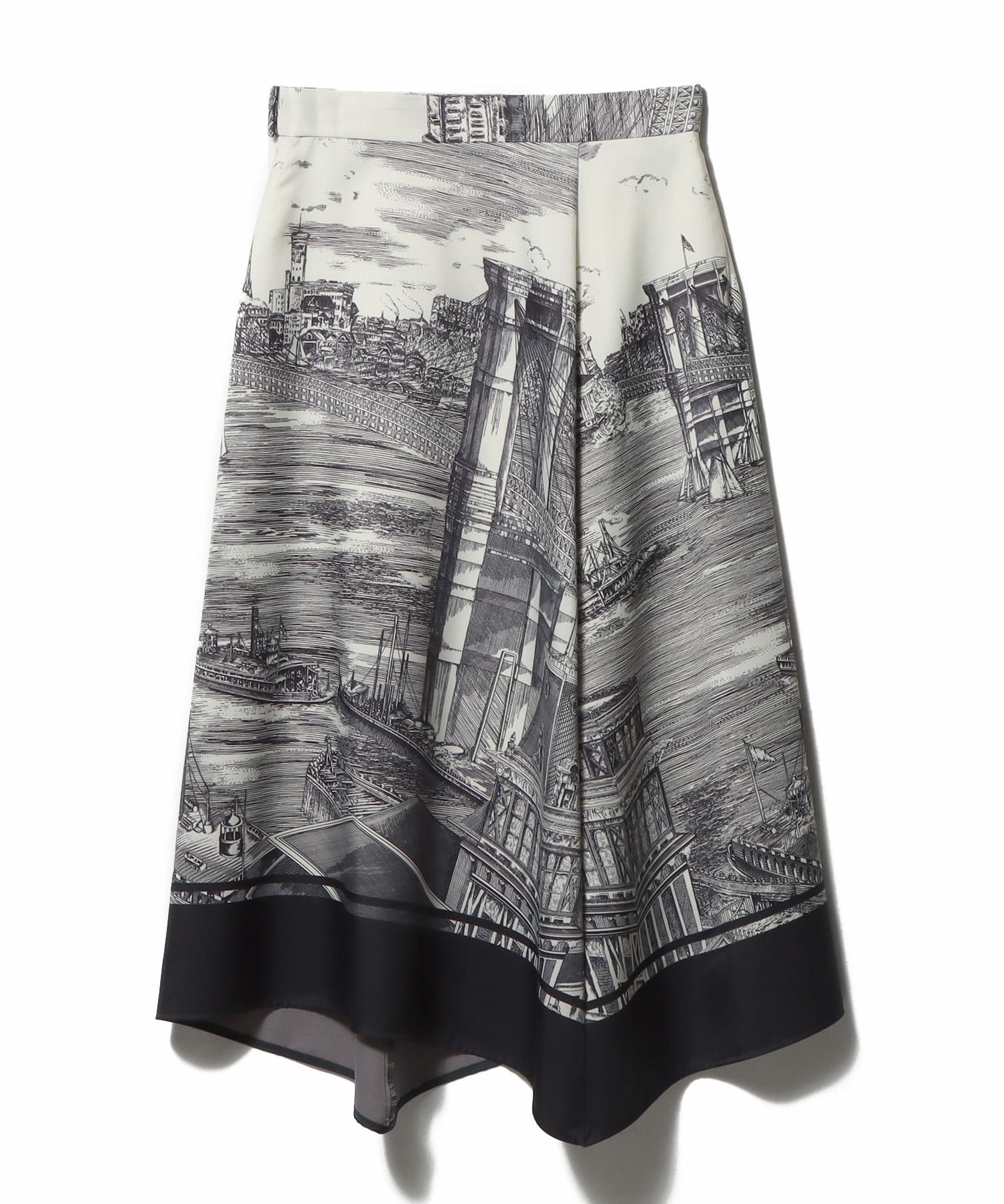 パネル柄を活かしたイレギュラーヘム、バイアスカットのフレアーなので、女性らしいシルエットが印象的。