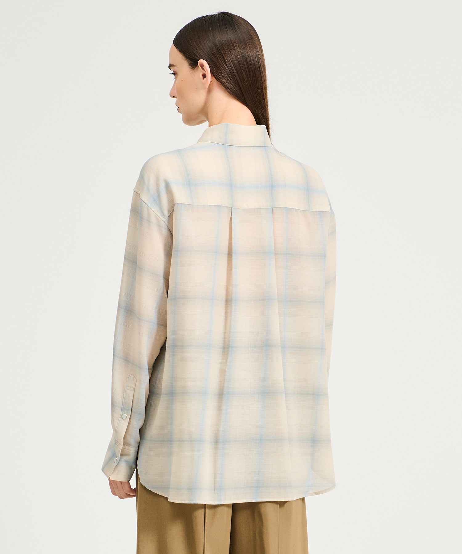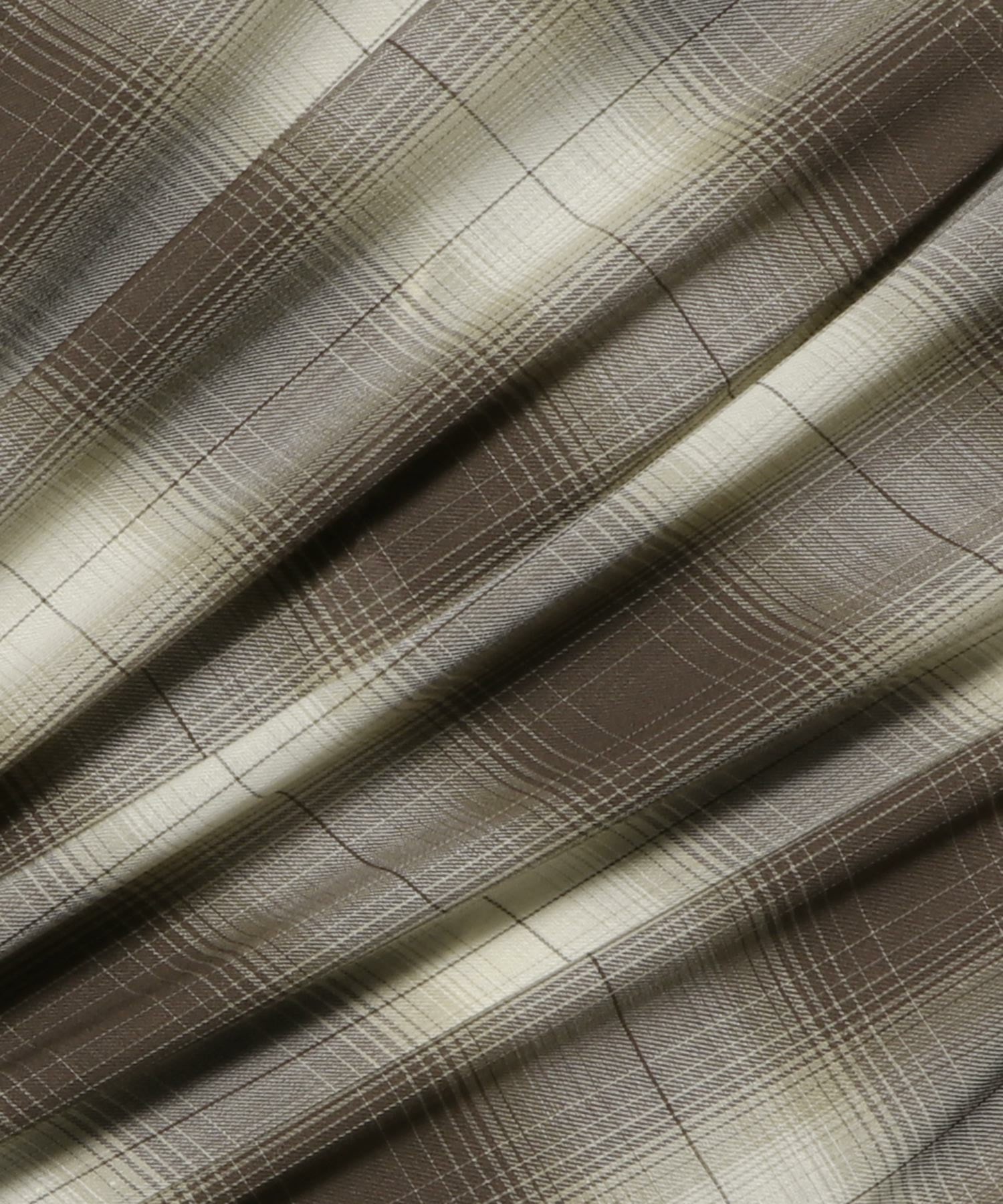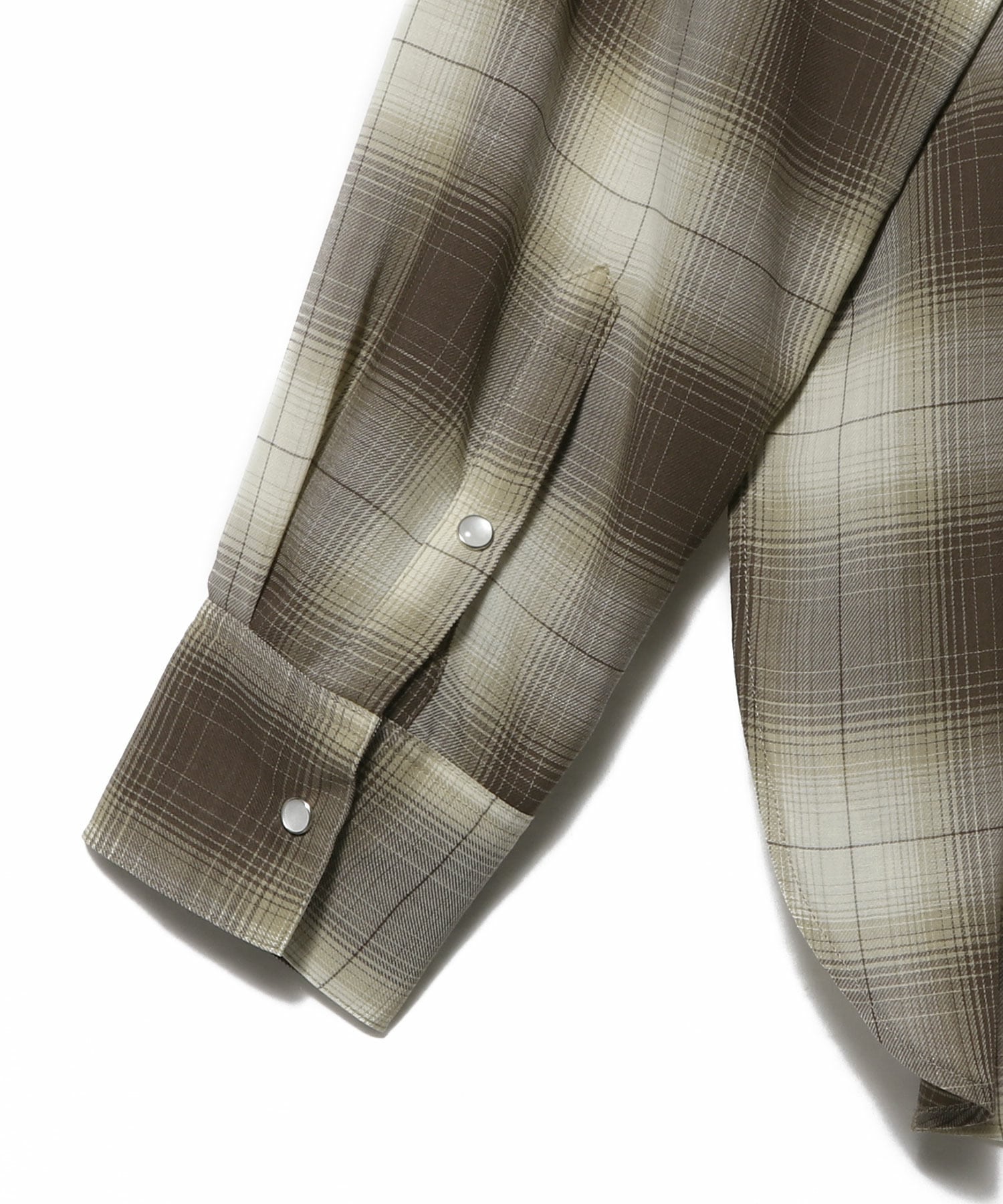 ボタンをスナップにすることでウエスタン要素を取り入れています。グラデーションのようなチェック柄に、落ち感と程よい透け感が大人なデザイン。
