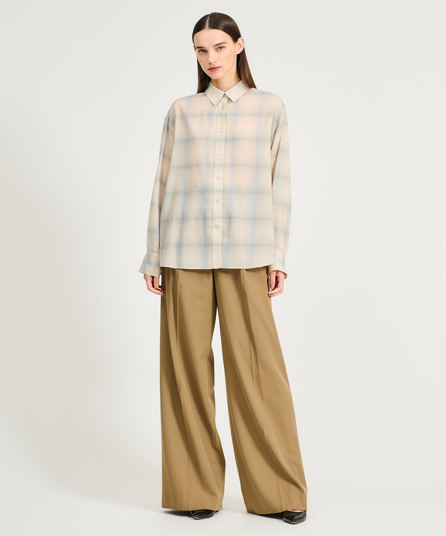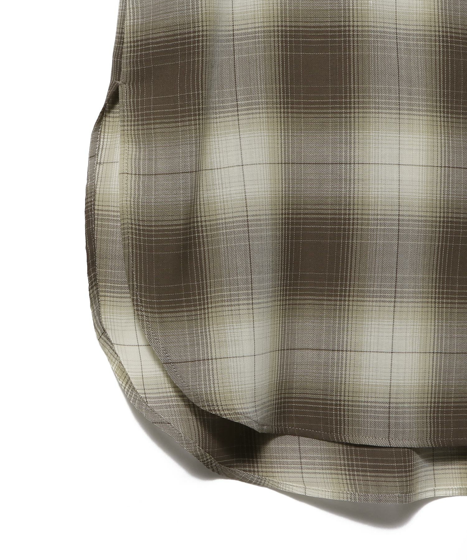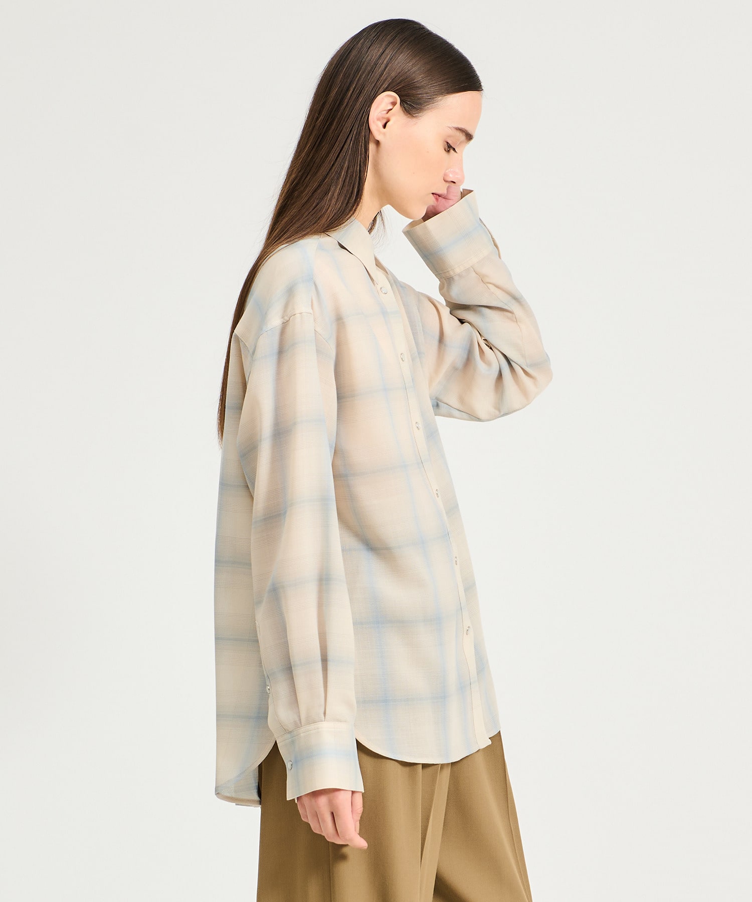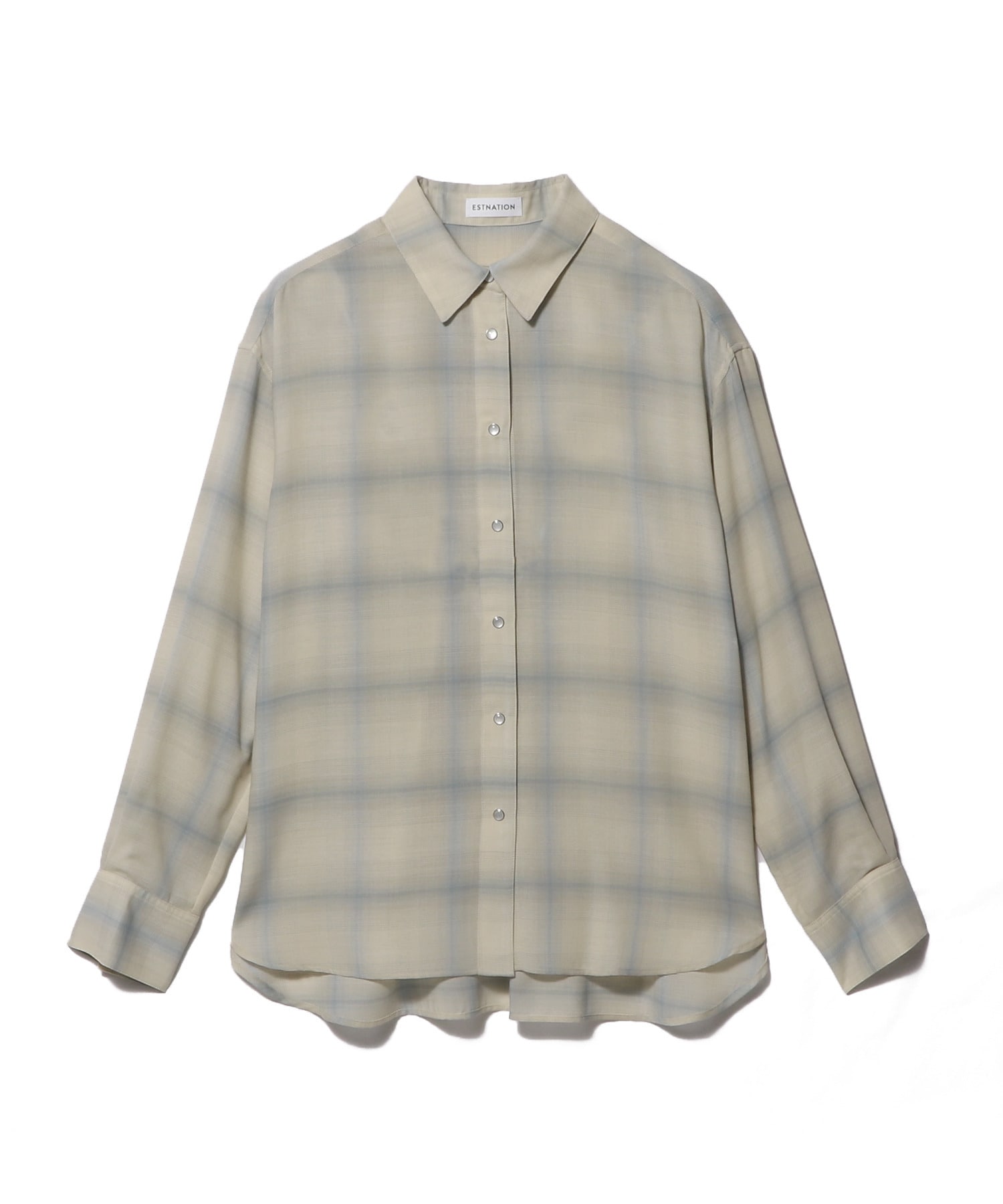 ボタンをスナップにすることでウエスタン要素を取り入れています。グラデーションのようなチェック柄に、落ち感と程よい透け感が大人なデザイン。