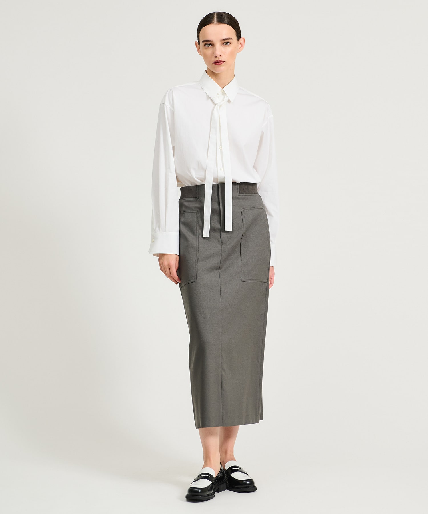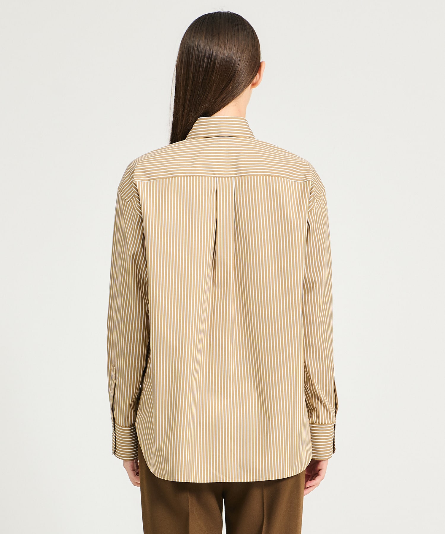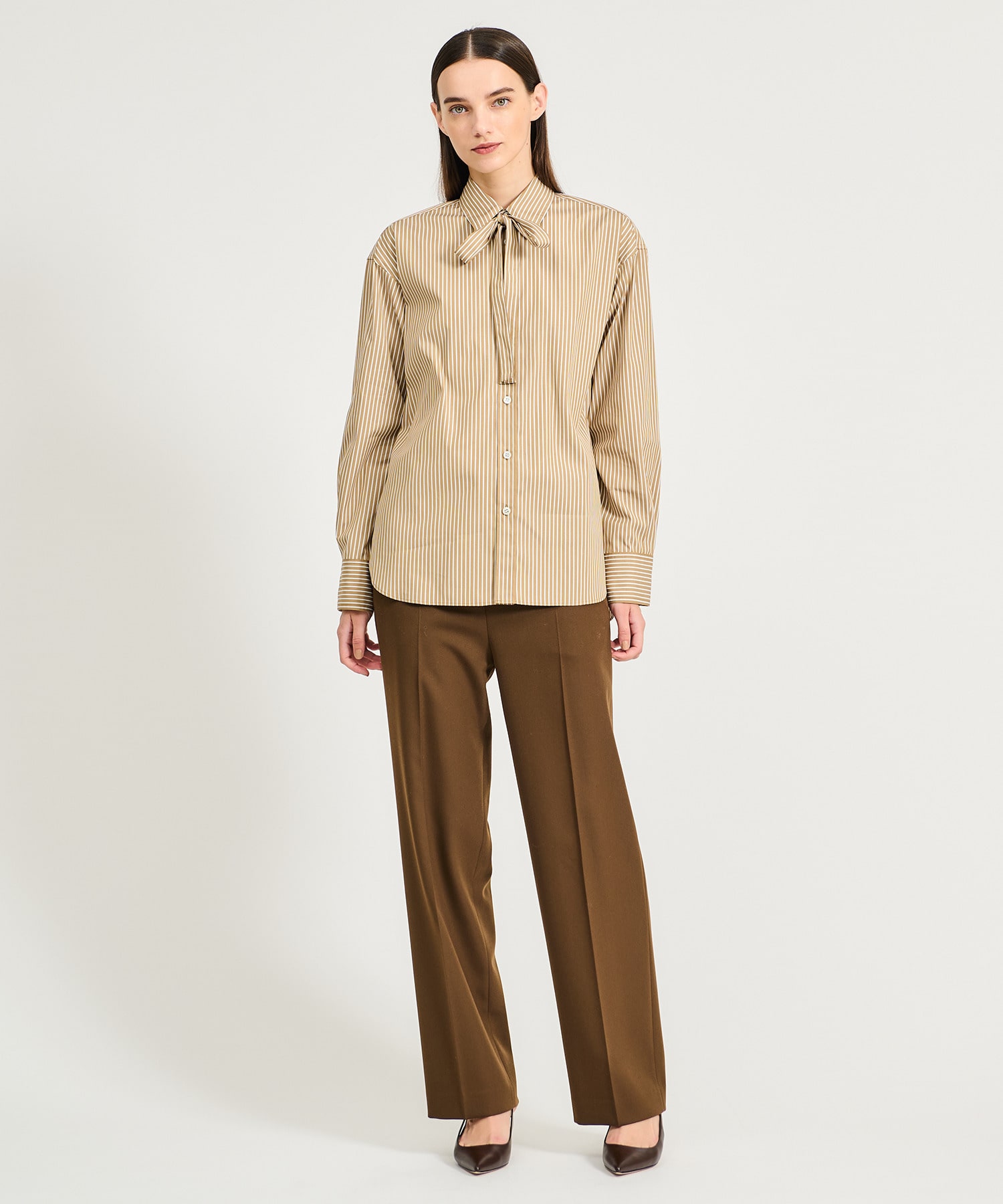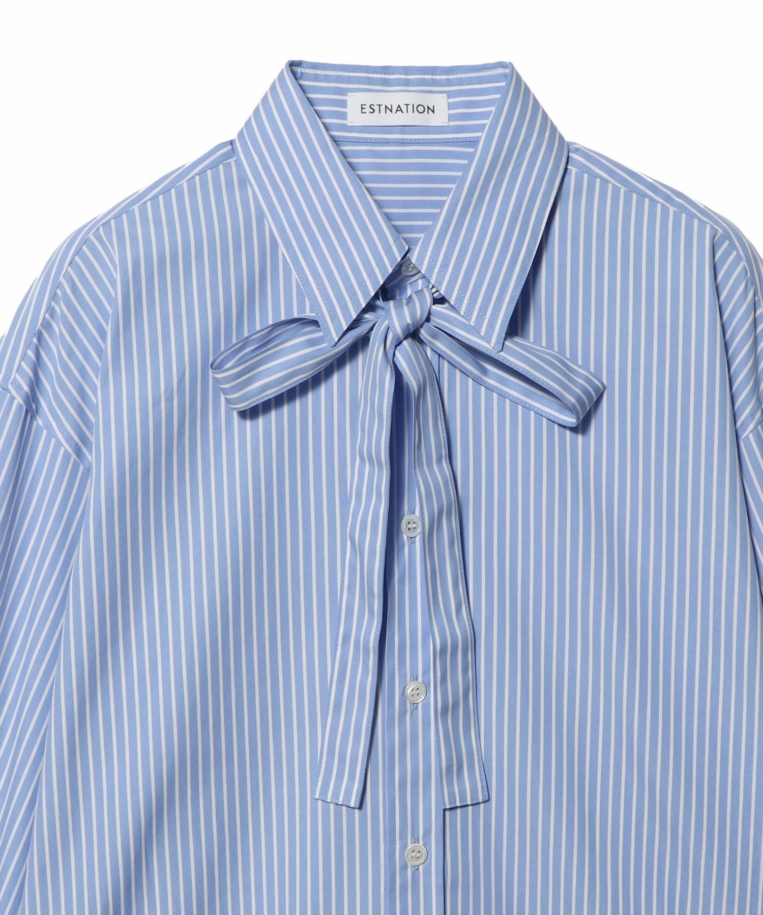 しっかりとした風合いが魅力のブロード素材を使用し、秋を感じさせるカラーを取り入れたリボンタイシャツ。