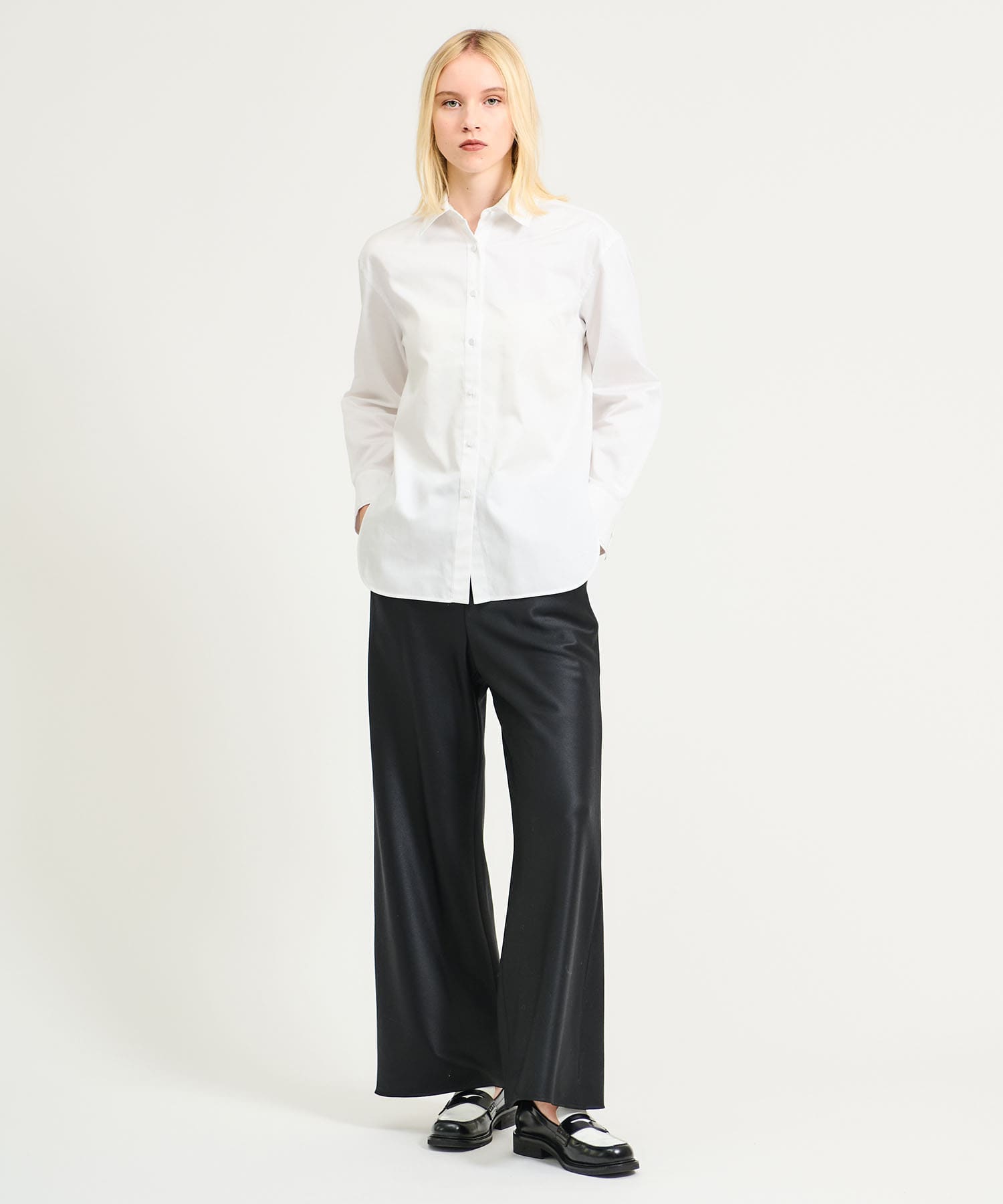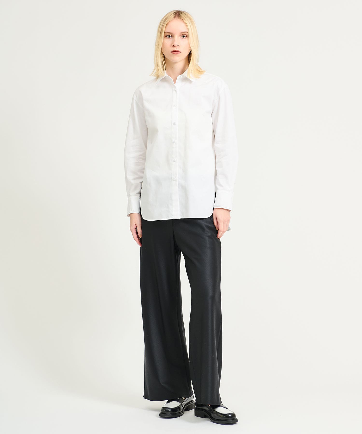 しっかりとした風合いが特徴のブロード素材を使用。ハリ感と切れ目な表面感がマニッシュで知的な印象に。