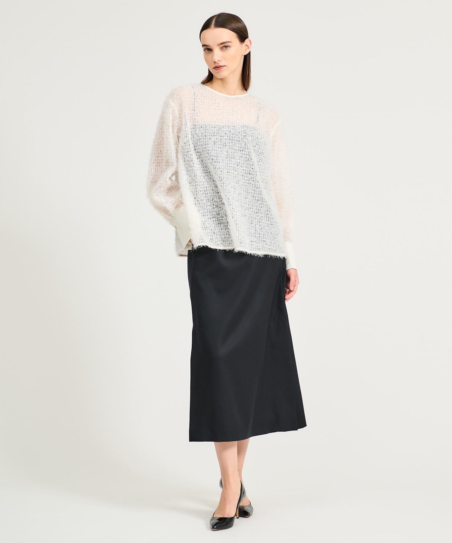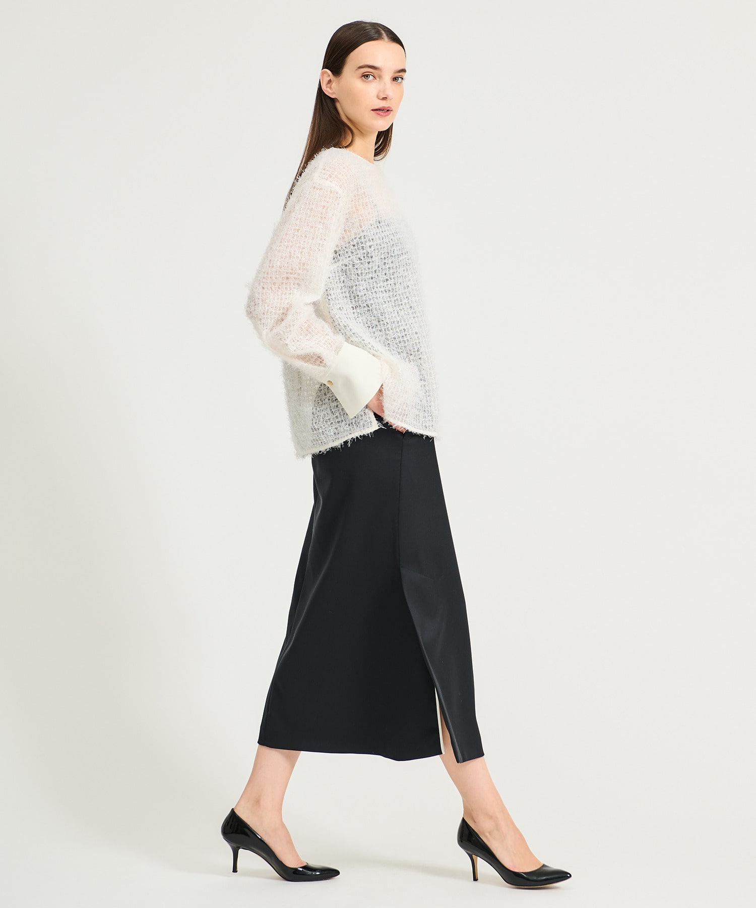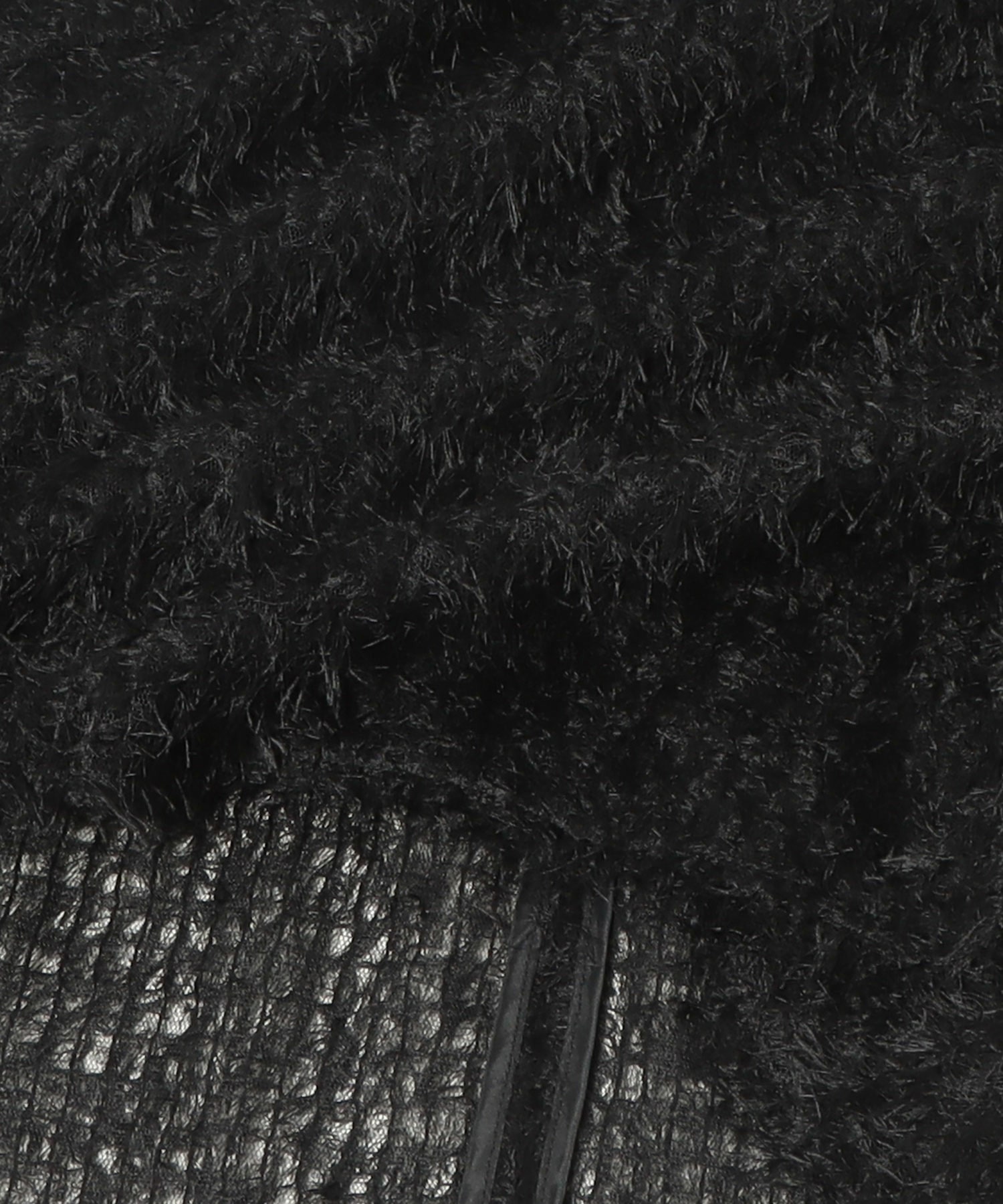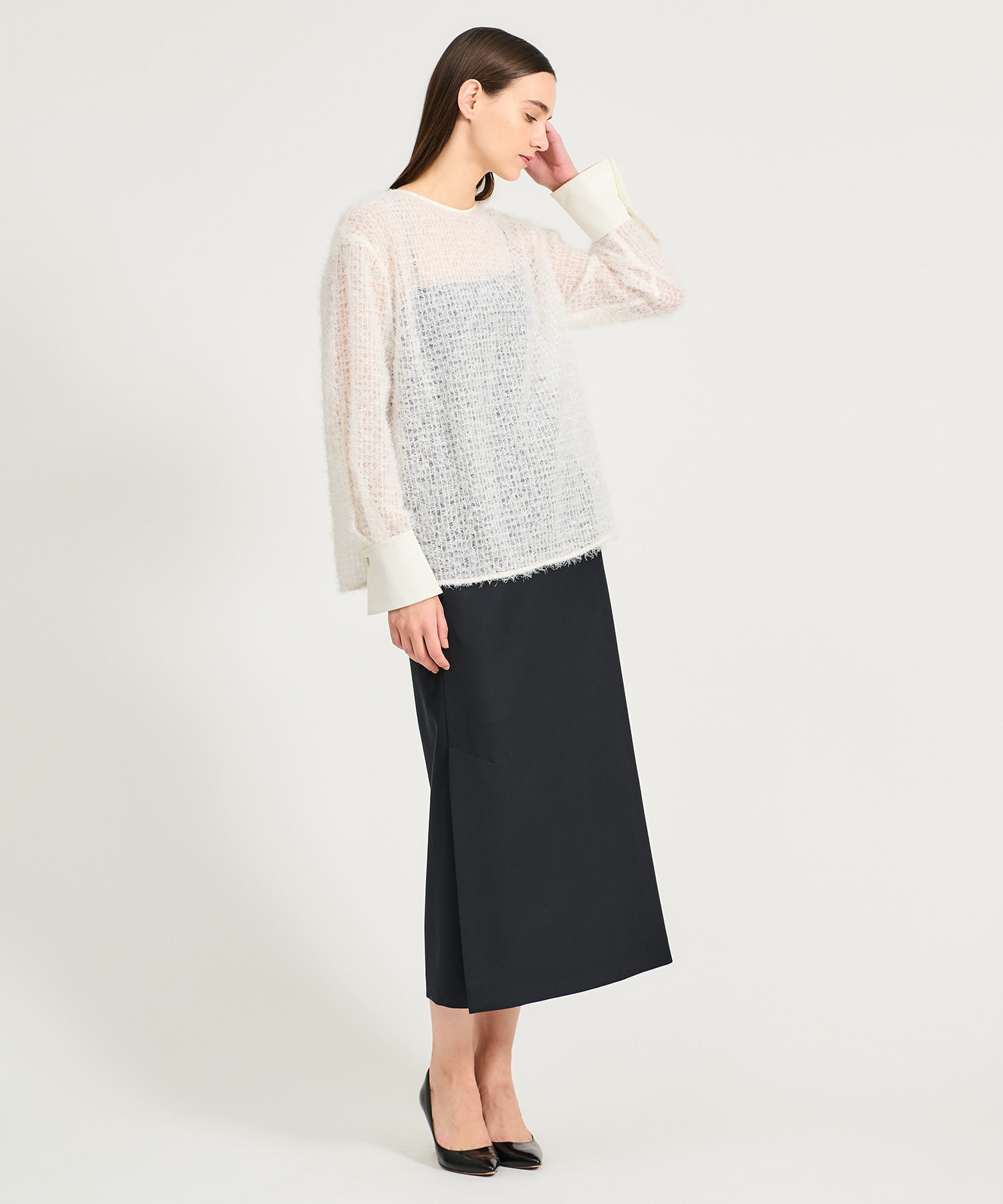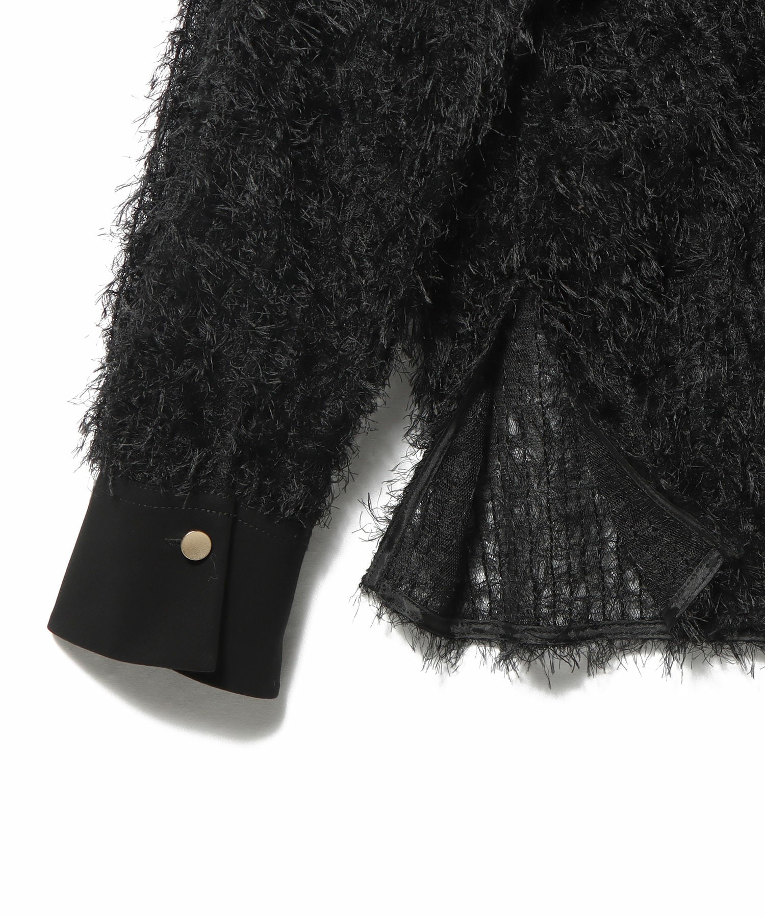 チュール素材に、毛足のあるモール糸を刺繍した素材を使用。透け感のあるチュール素材にファンシーな印象の糸を刺繍することで、ややファンシー感のある素材に仕上げました。