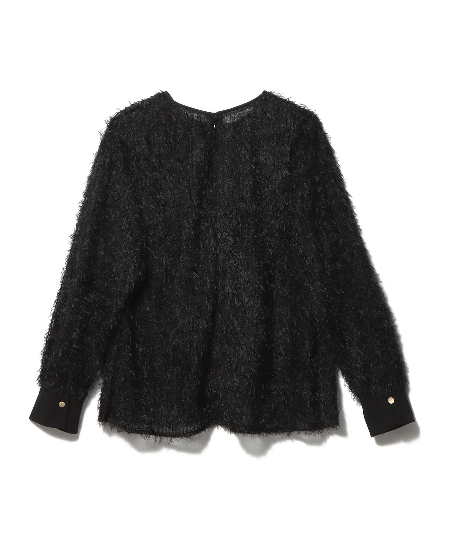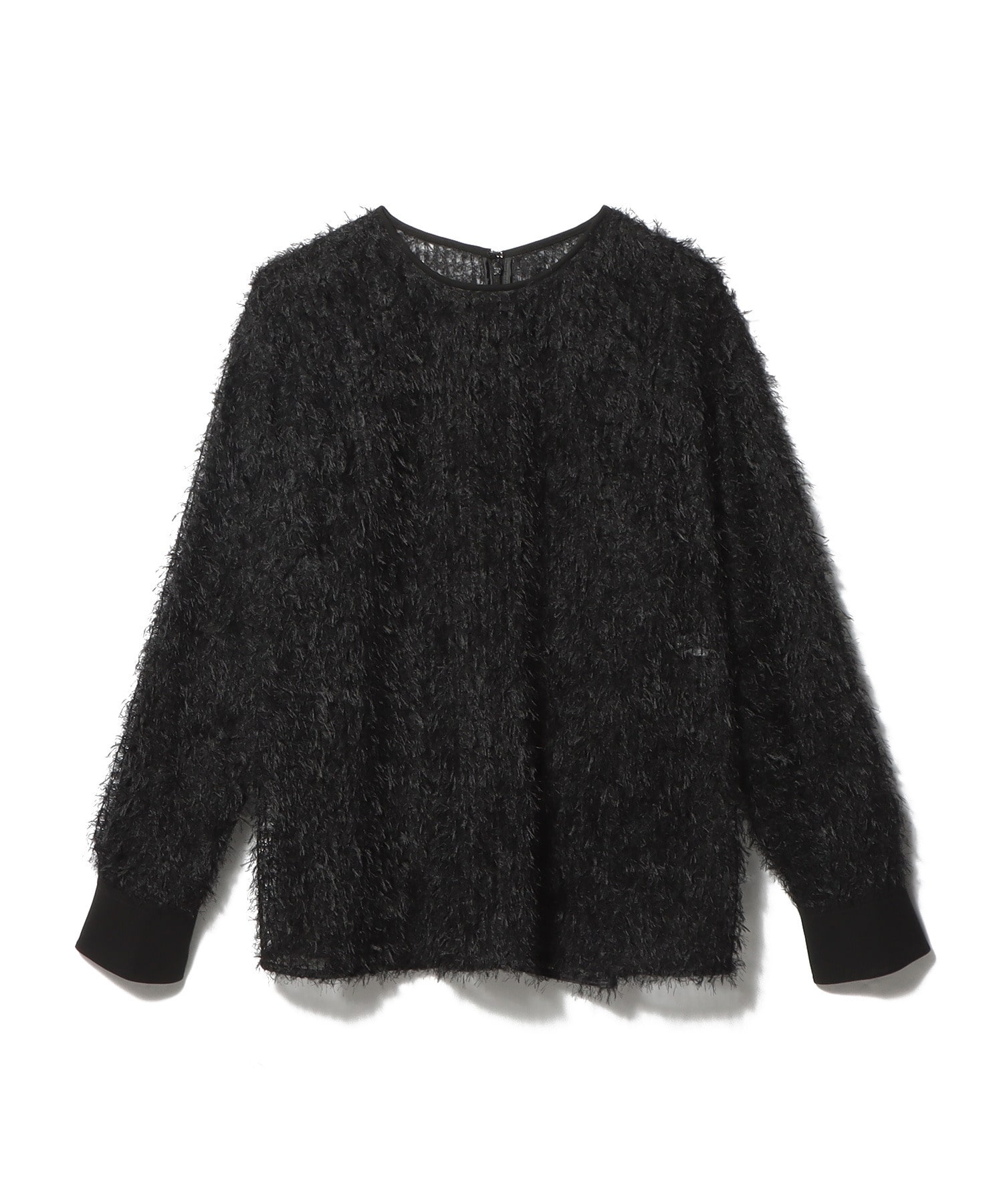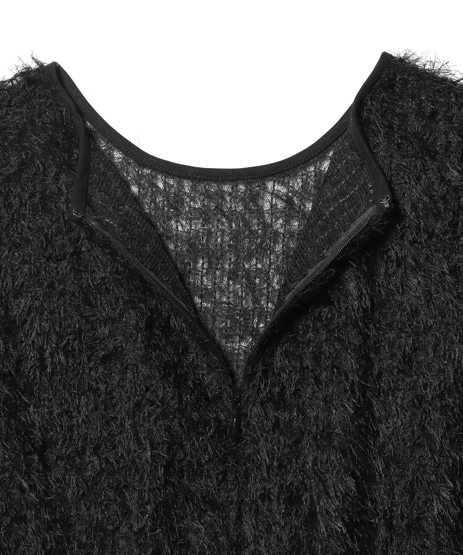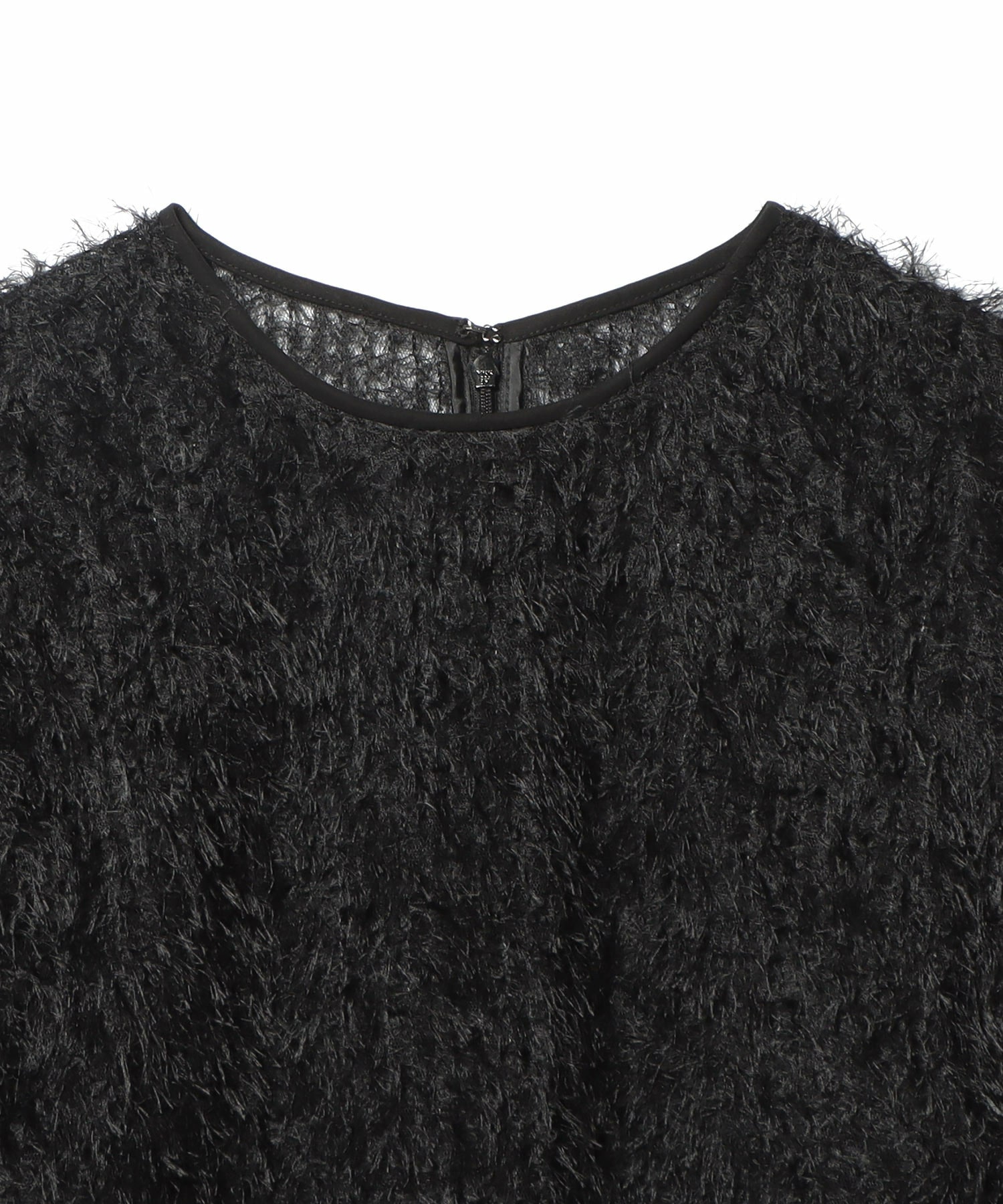 チュール素材に、毛足のあるモール糸を刺繍した素材を使用。透け感のあるチュール素材にファンシーな印象の糸を刺繍することで、ややファンシー感のある素材に仕上げました。
