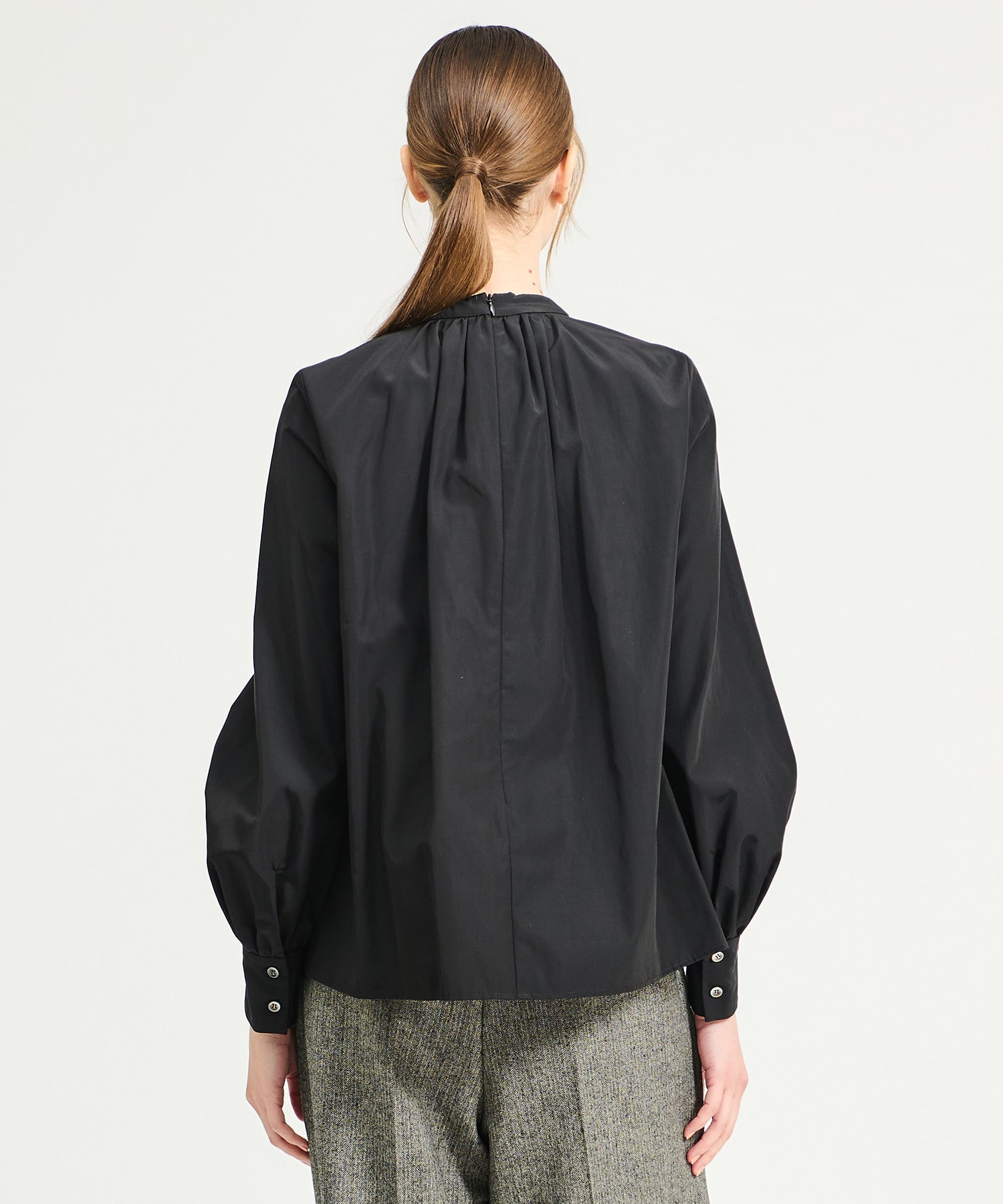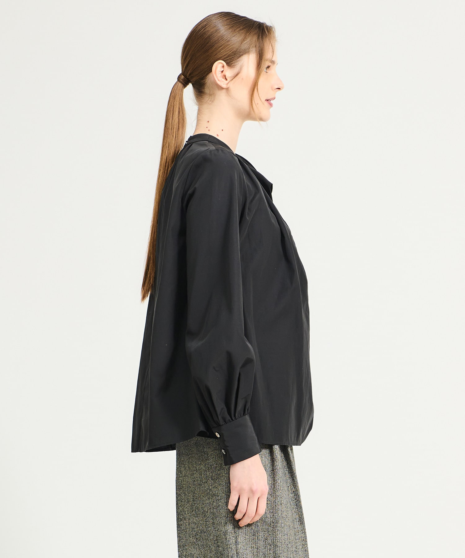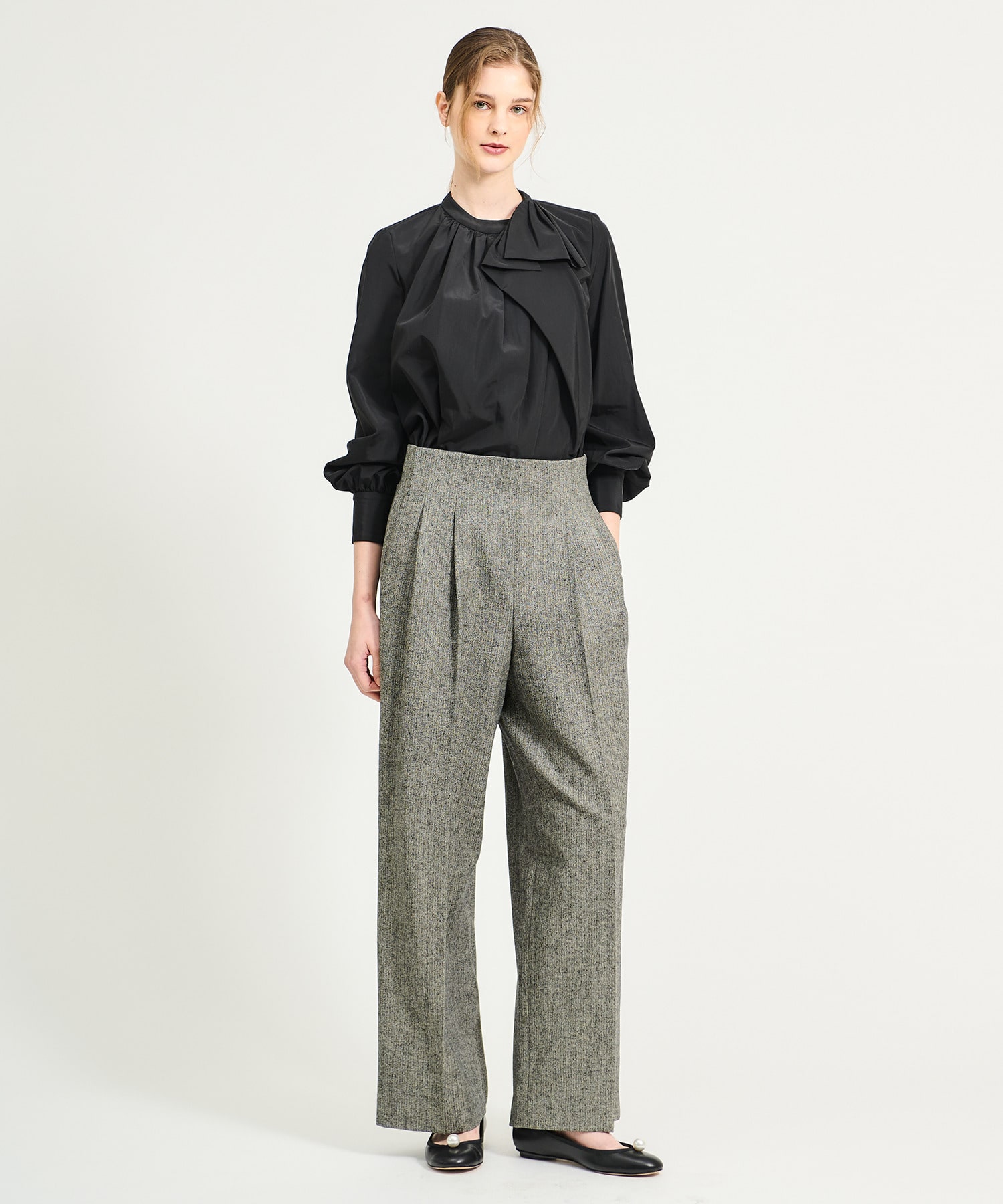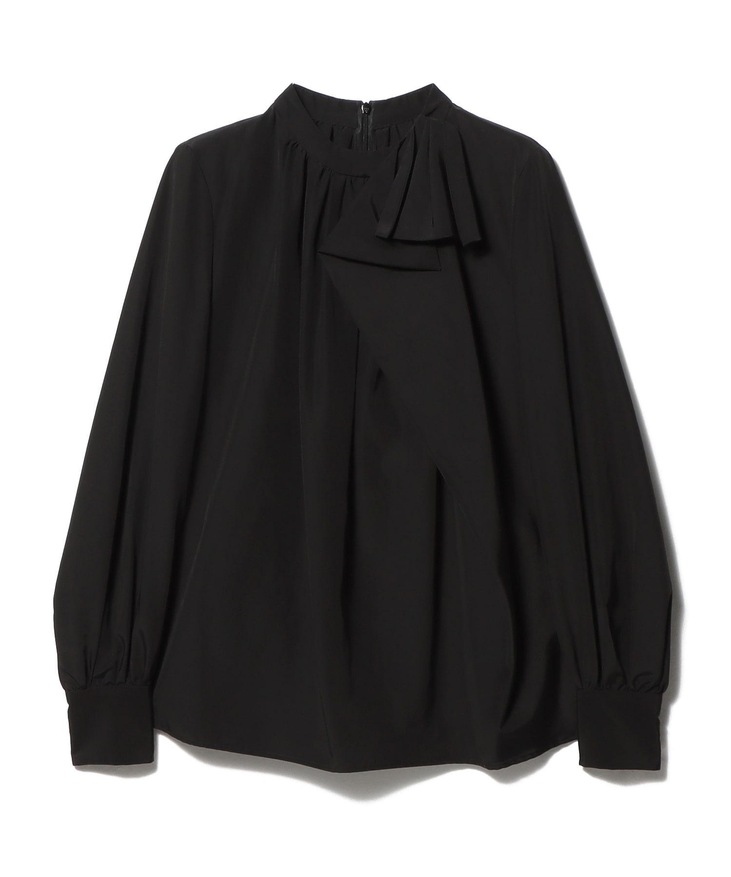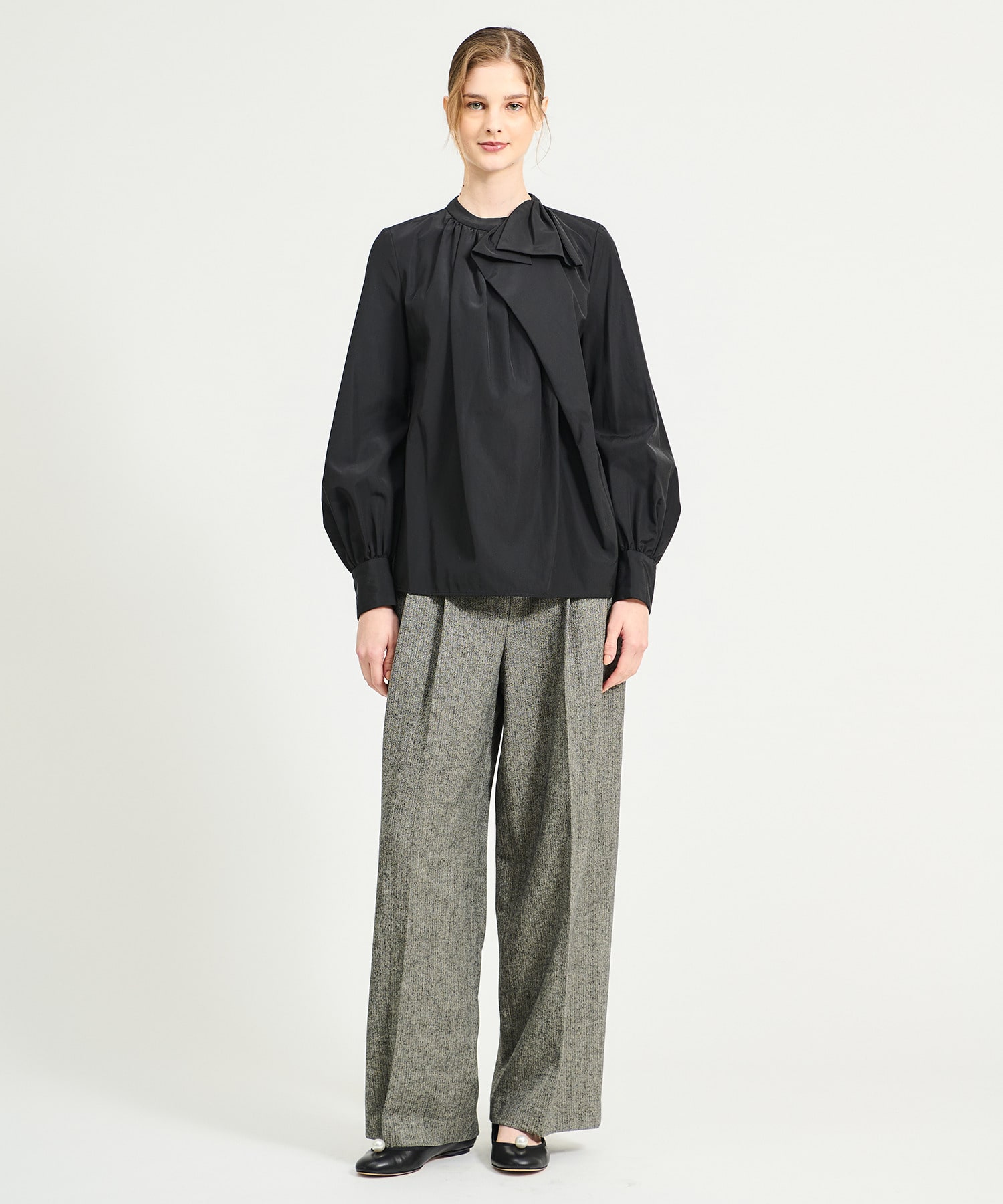 襟元の大きめリボンの様なディテールがポイントのブラウス。