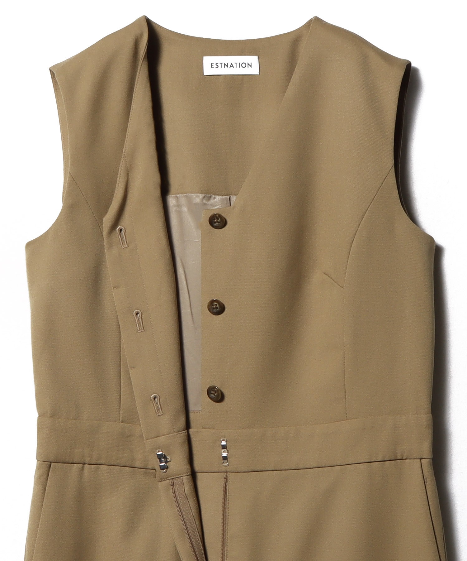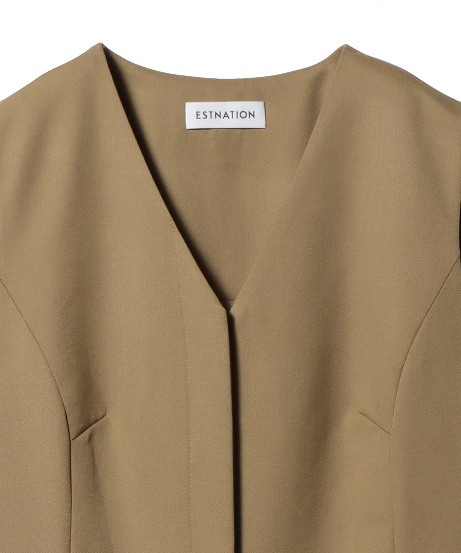 ウエストを切り替えてフロントで開きを作ることでジレを着ているようなデザインに。襟ぐりはVネックにしておりシャープな印象に仕上げました。