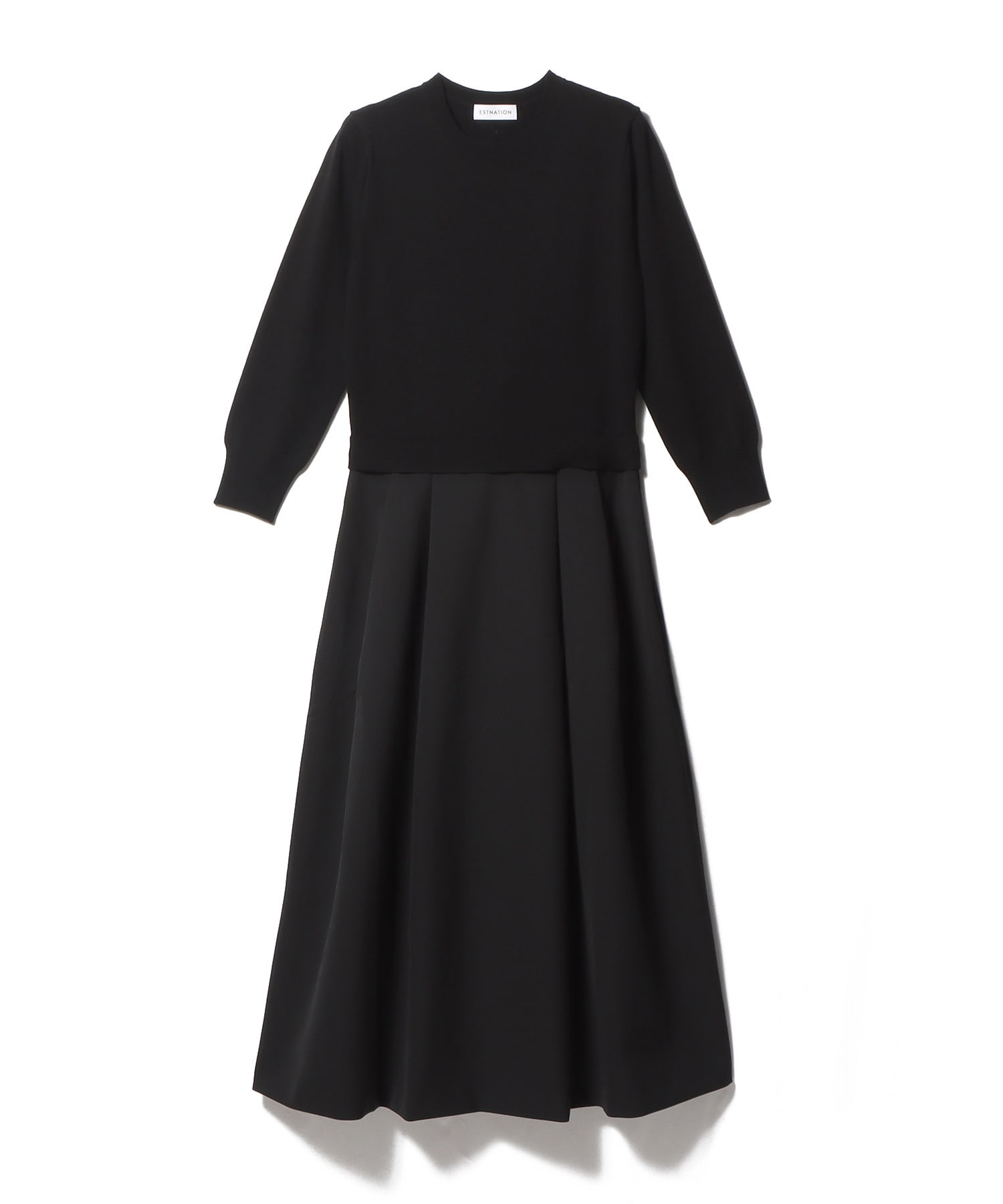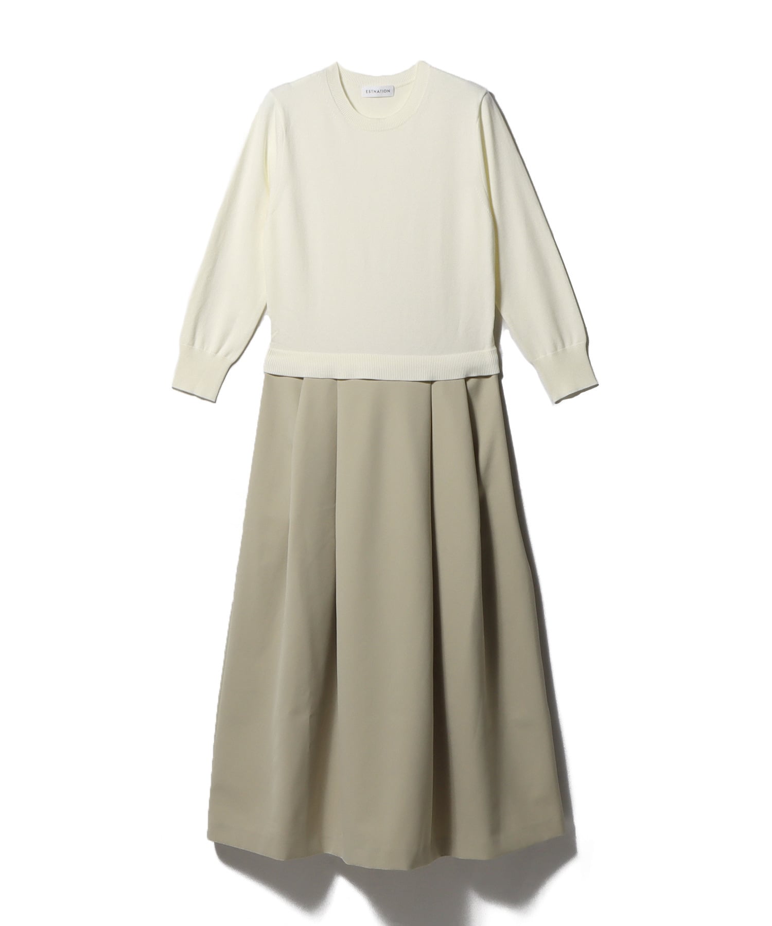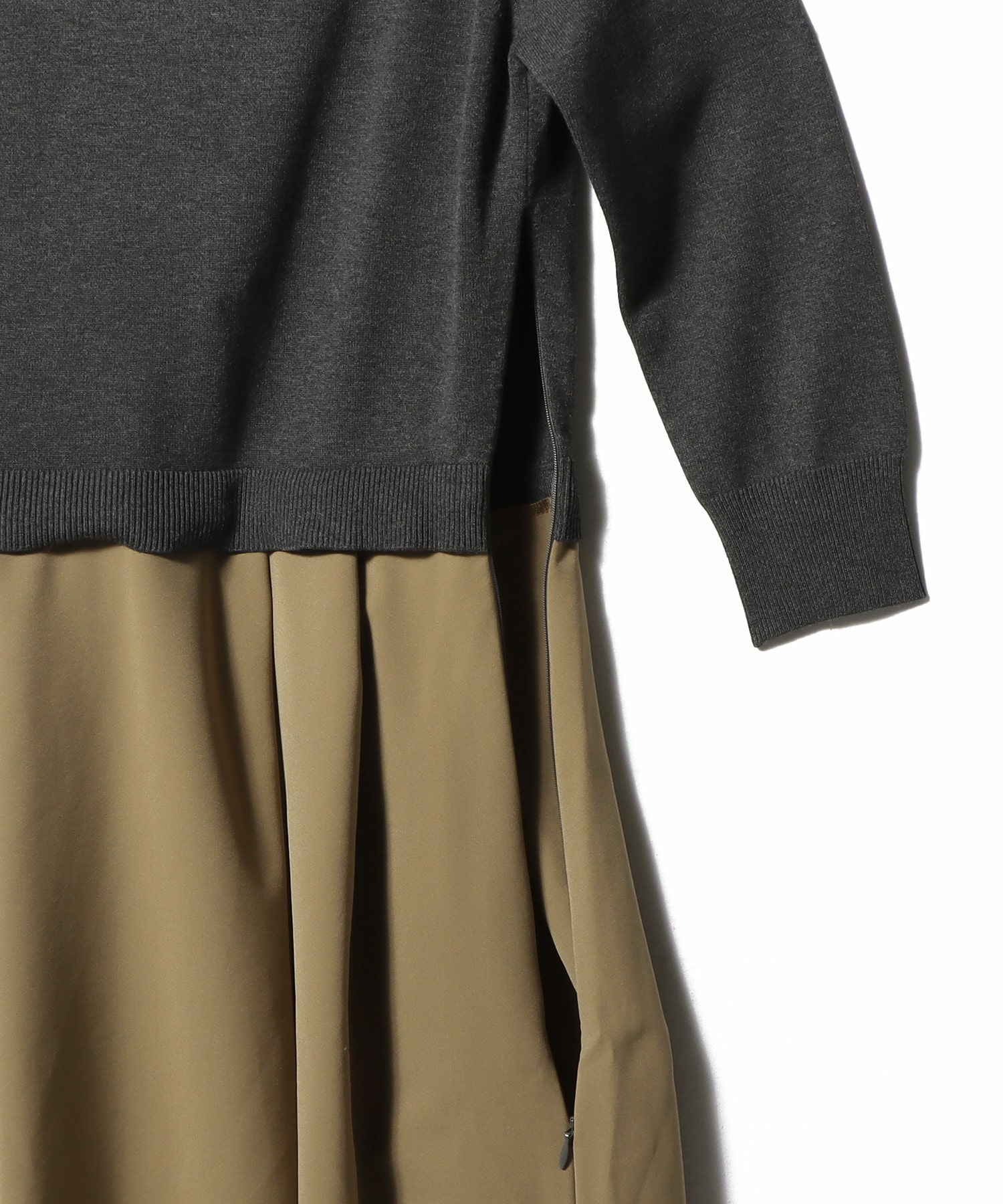 ニットトップスとハリのあるポリエステルスカートをドッキングしたコンビネーションワンピース。