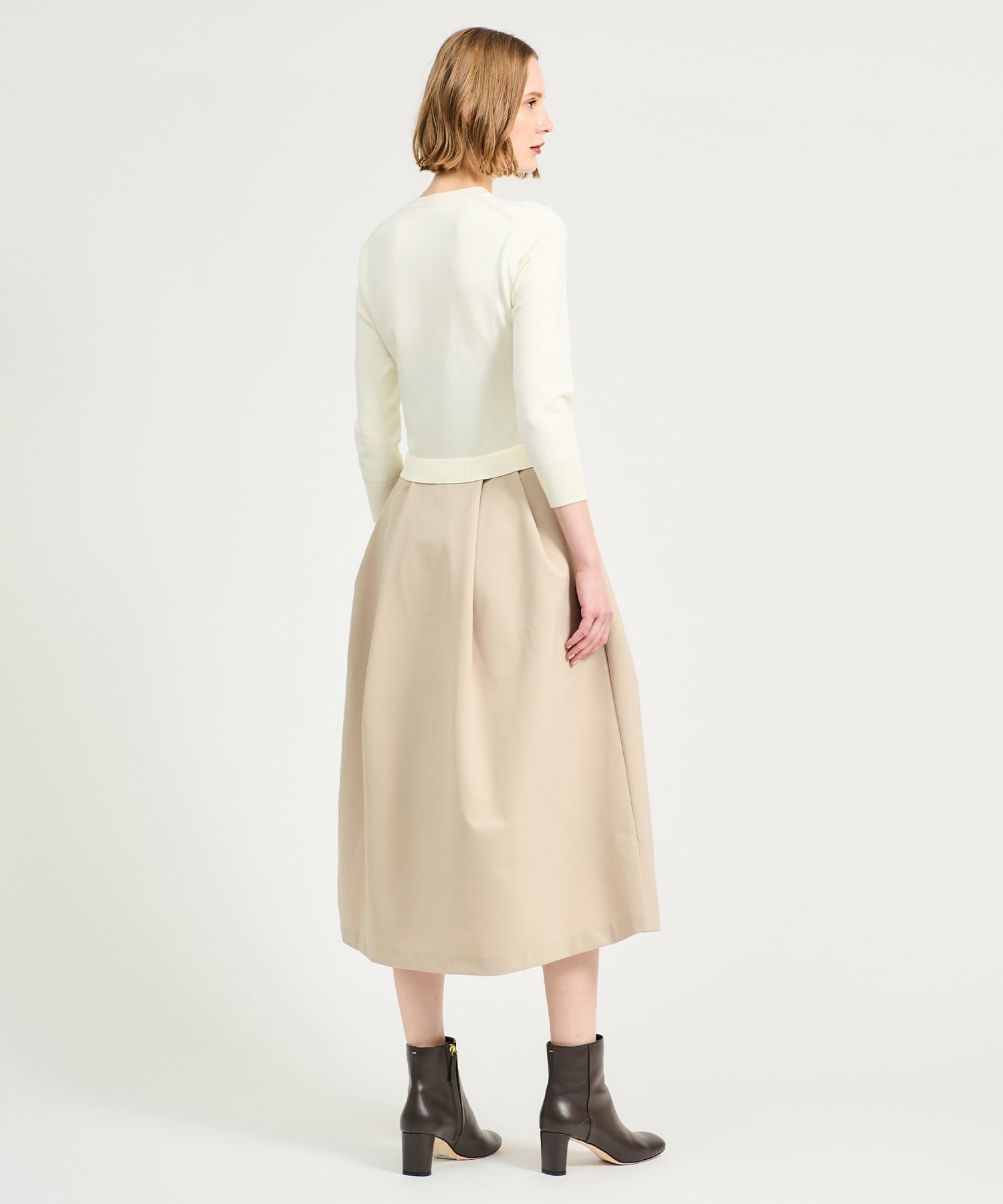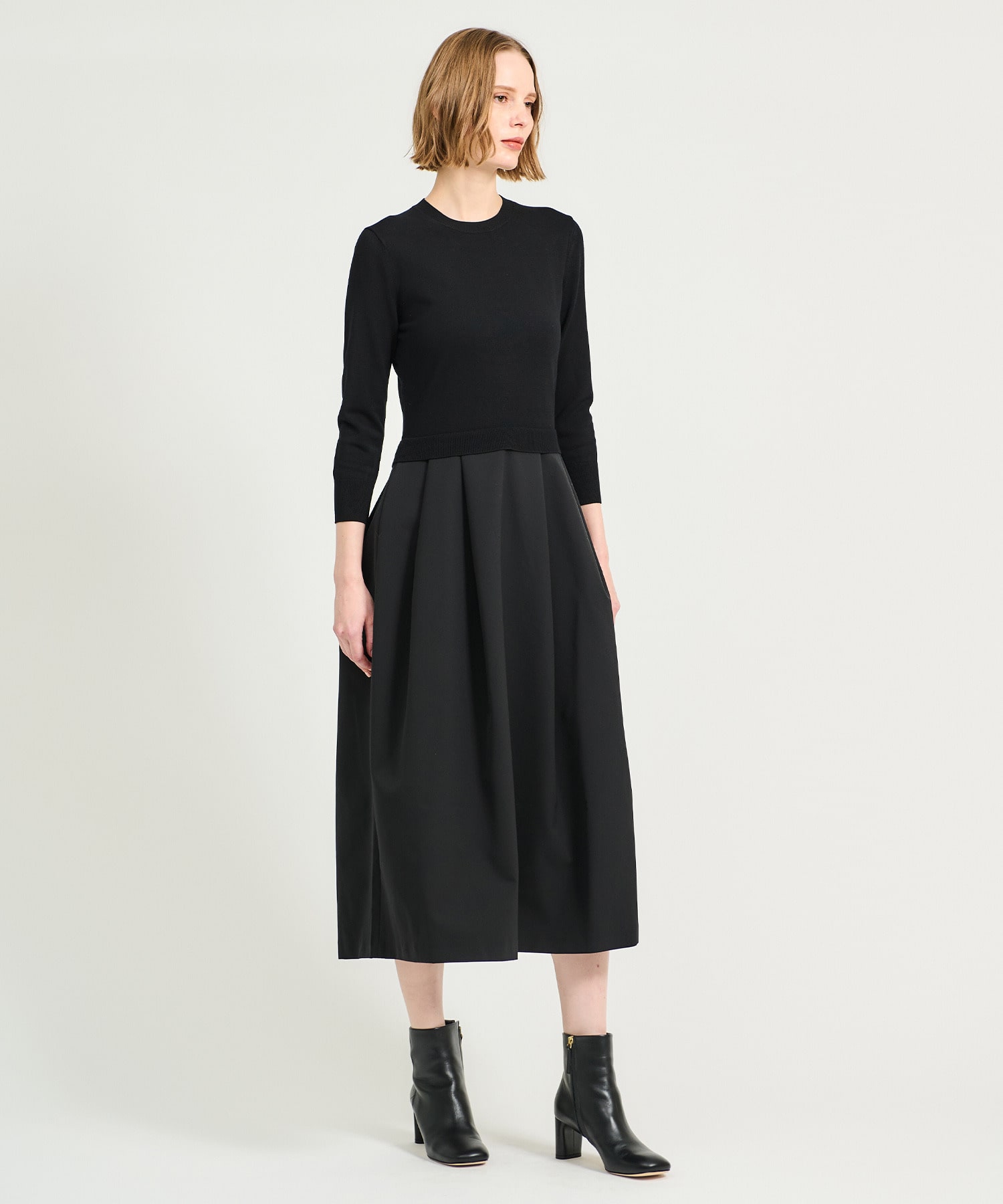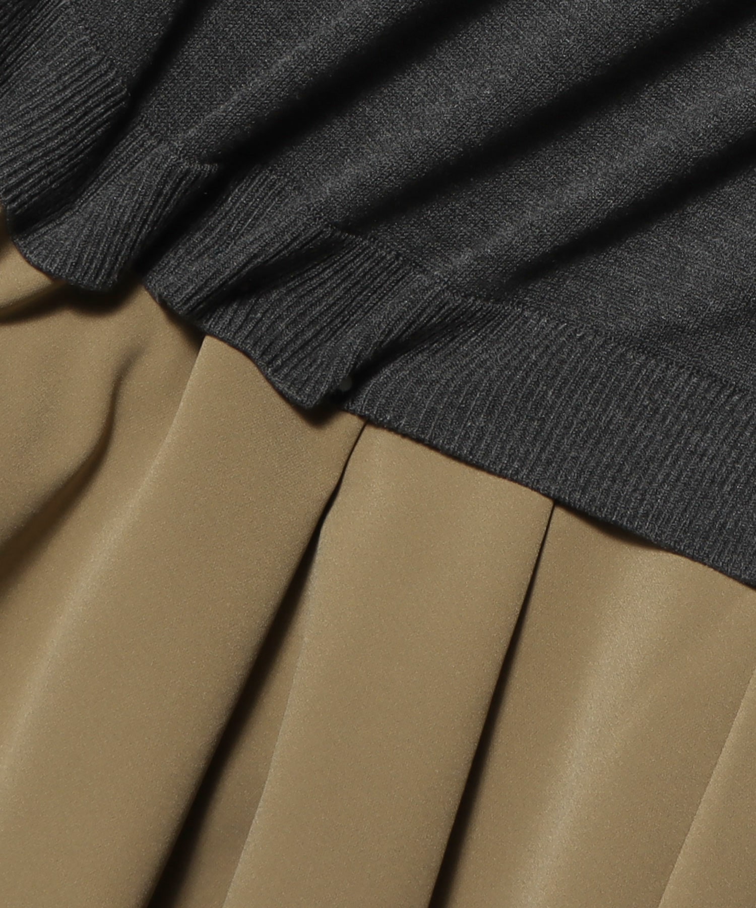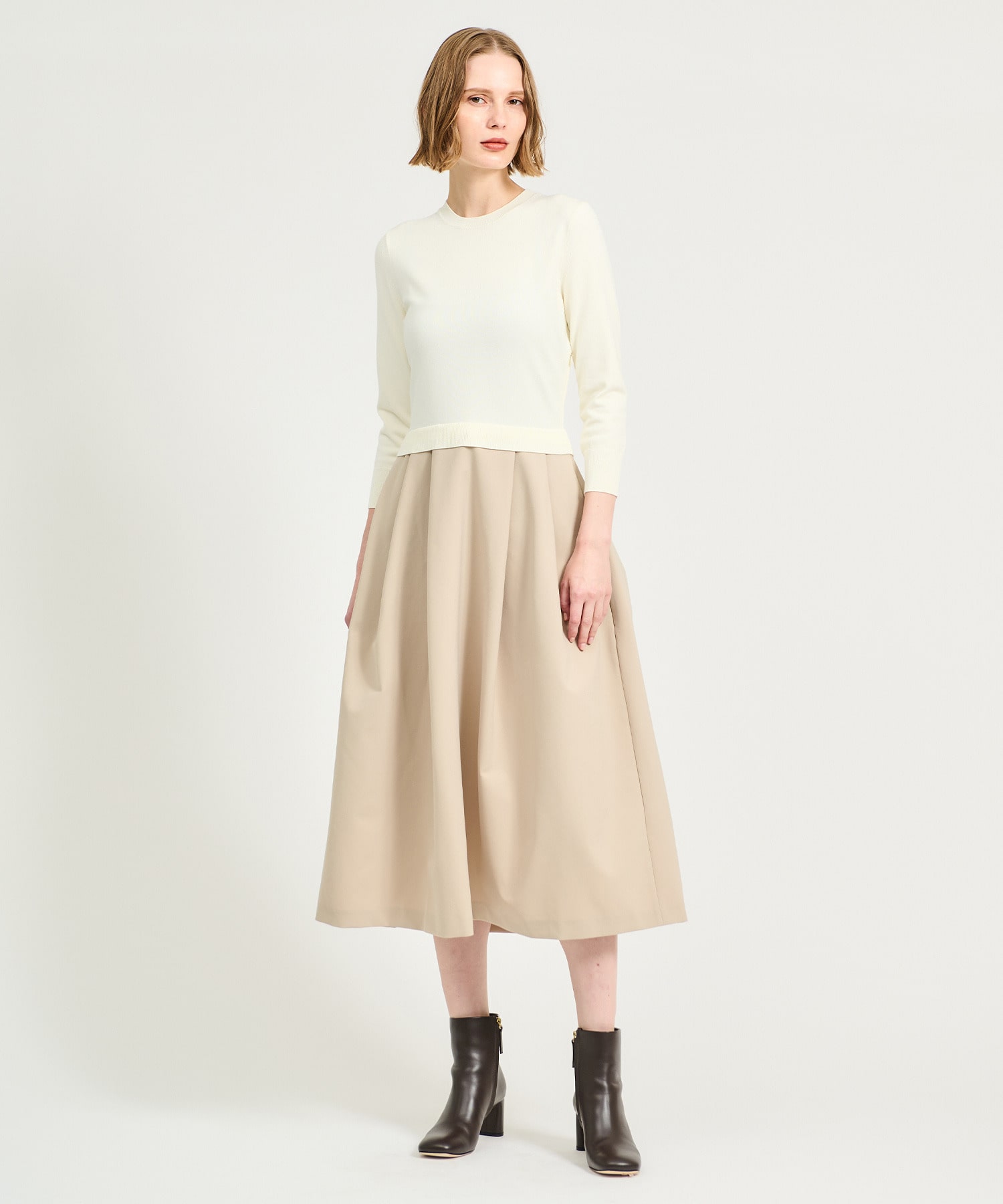 ニットトップスとハリのあるポリエステルスカートをドッキングしたコンビネーションワンピース。