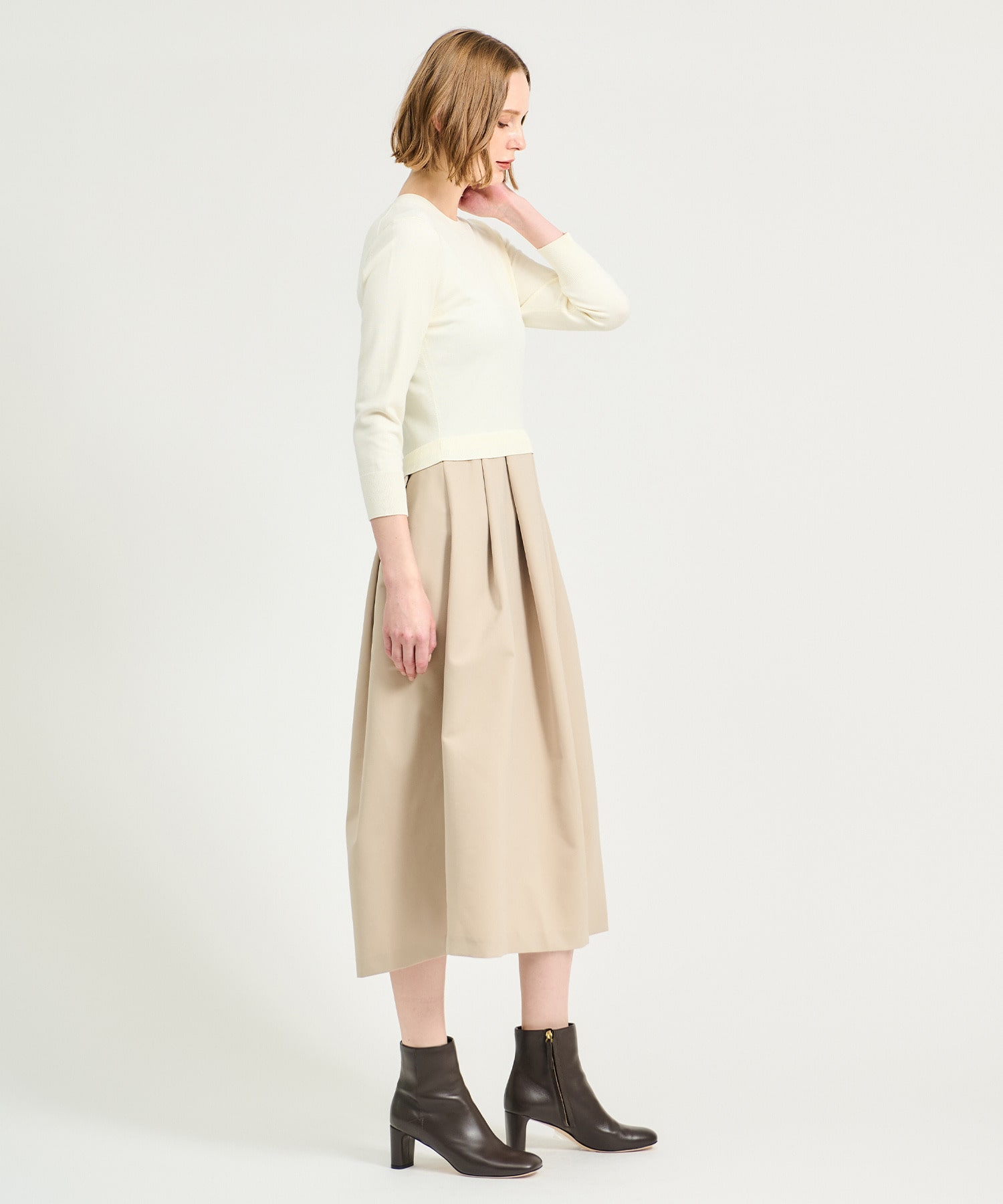 スカート部分には深めのタックを施し、立体的で構築的なシルエットを表現。