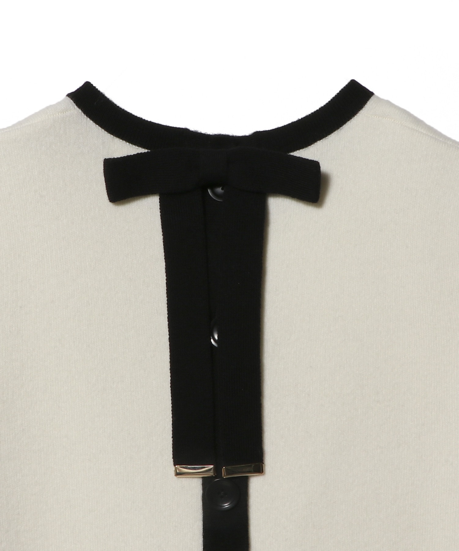 背面には取り外し可能なリボンブローチをあしらい、着こなしに遊び心と華やかさをプラス。上質さとデザイン性を兼ね備えた特別な一枚です。