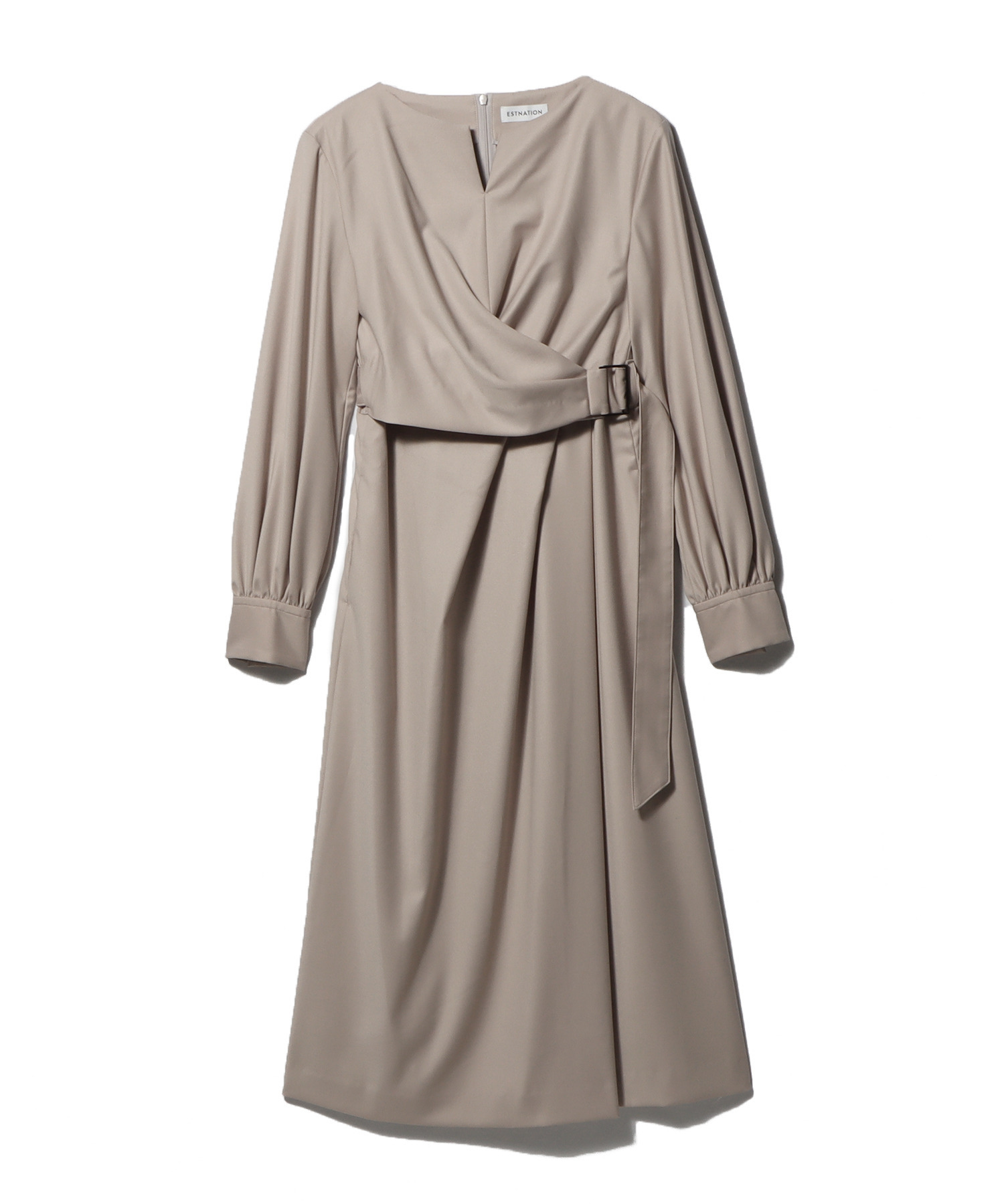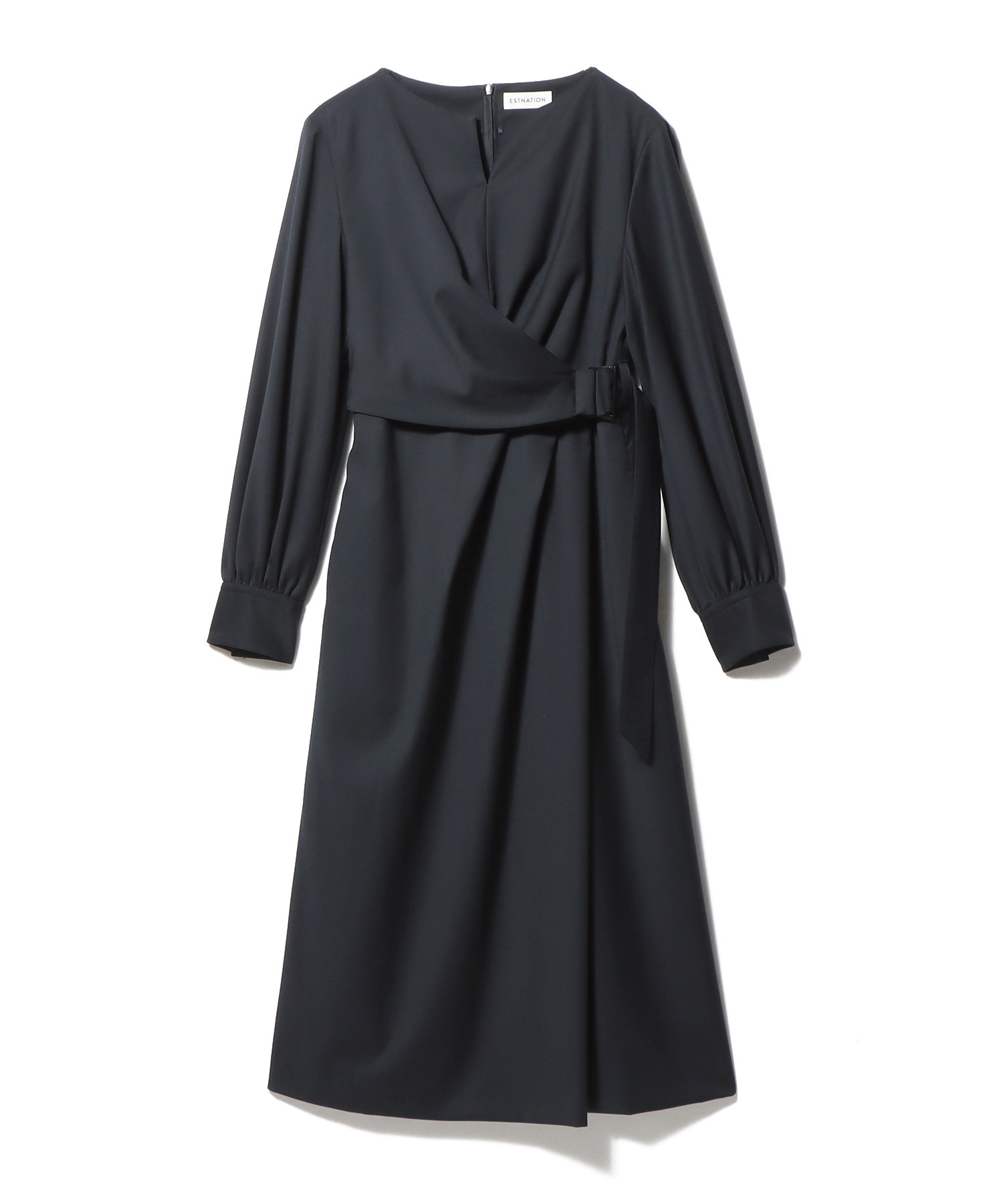 ウエストにサッシュベルトの様なカシュクールディテールを施し、スカート部分はタックを入れラップ見えにした一枚着としても華のあるデザイン。袖口のカフスは、ボタンで幅を調節でき、肘くらいまでアップして七分丈パフスリーブとしてもアレンジ可能です。