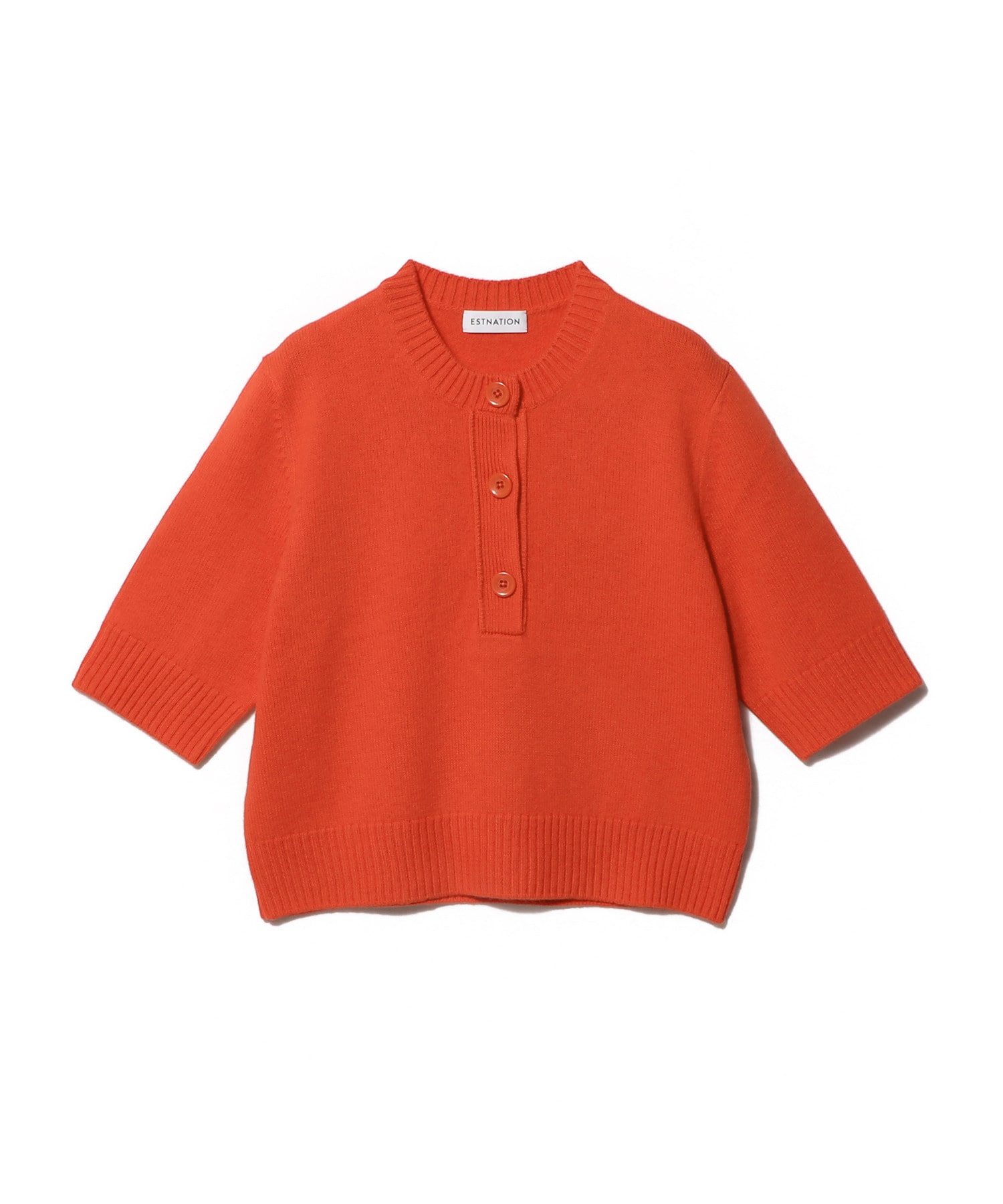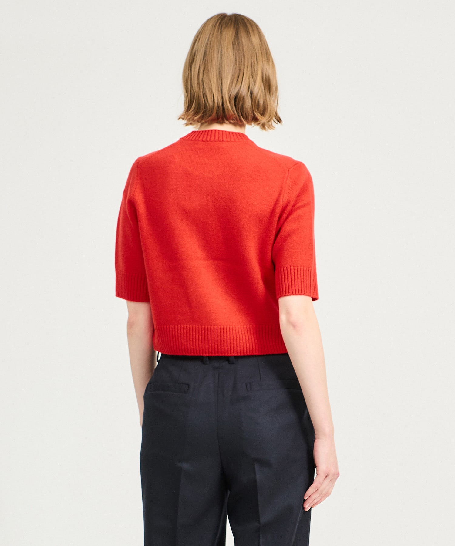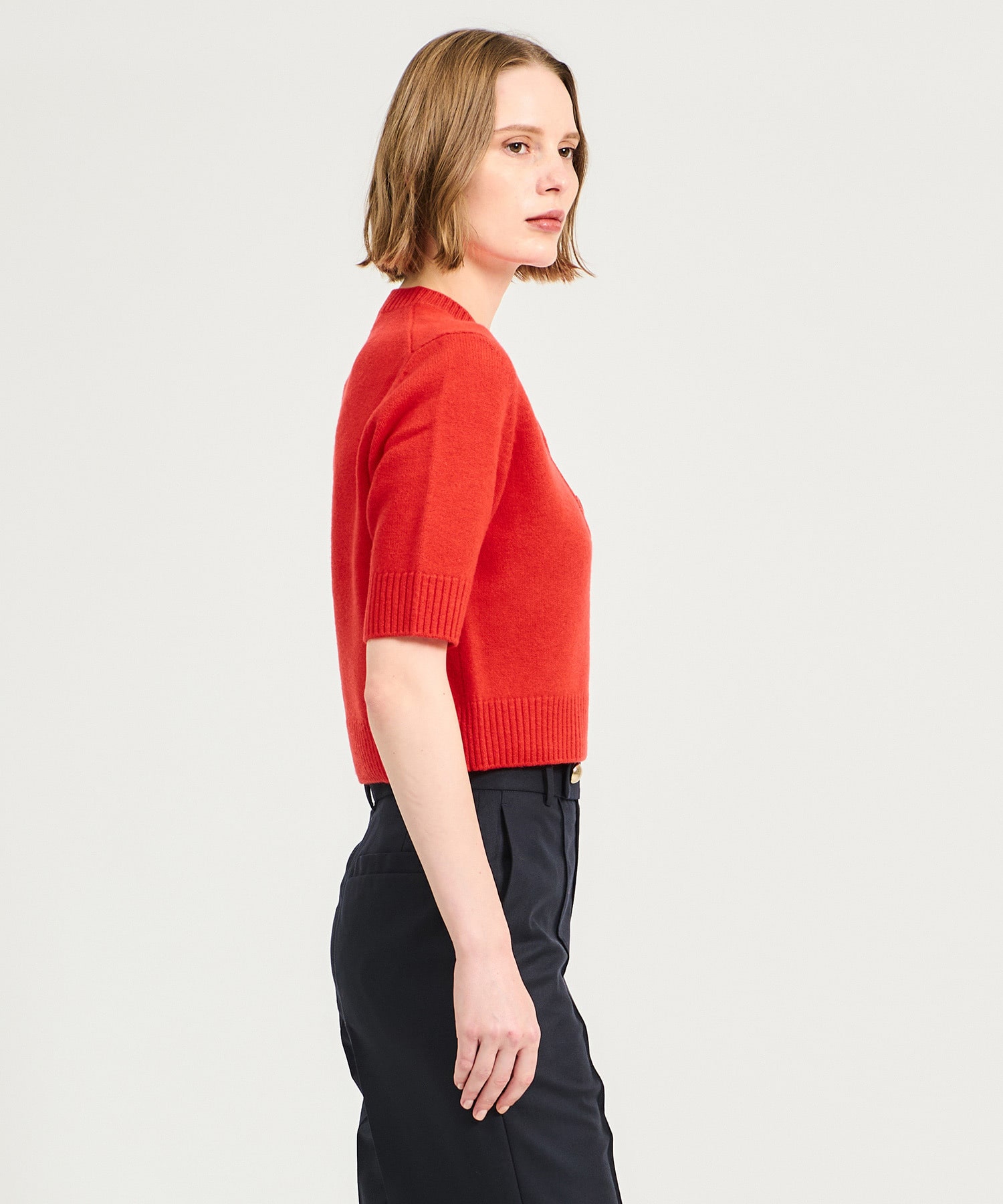 程よい厚みのミドルゲージで、コンパクトなシルエットのベーシックな半袖ニット。