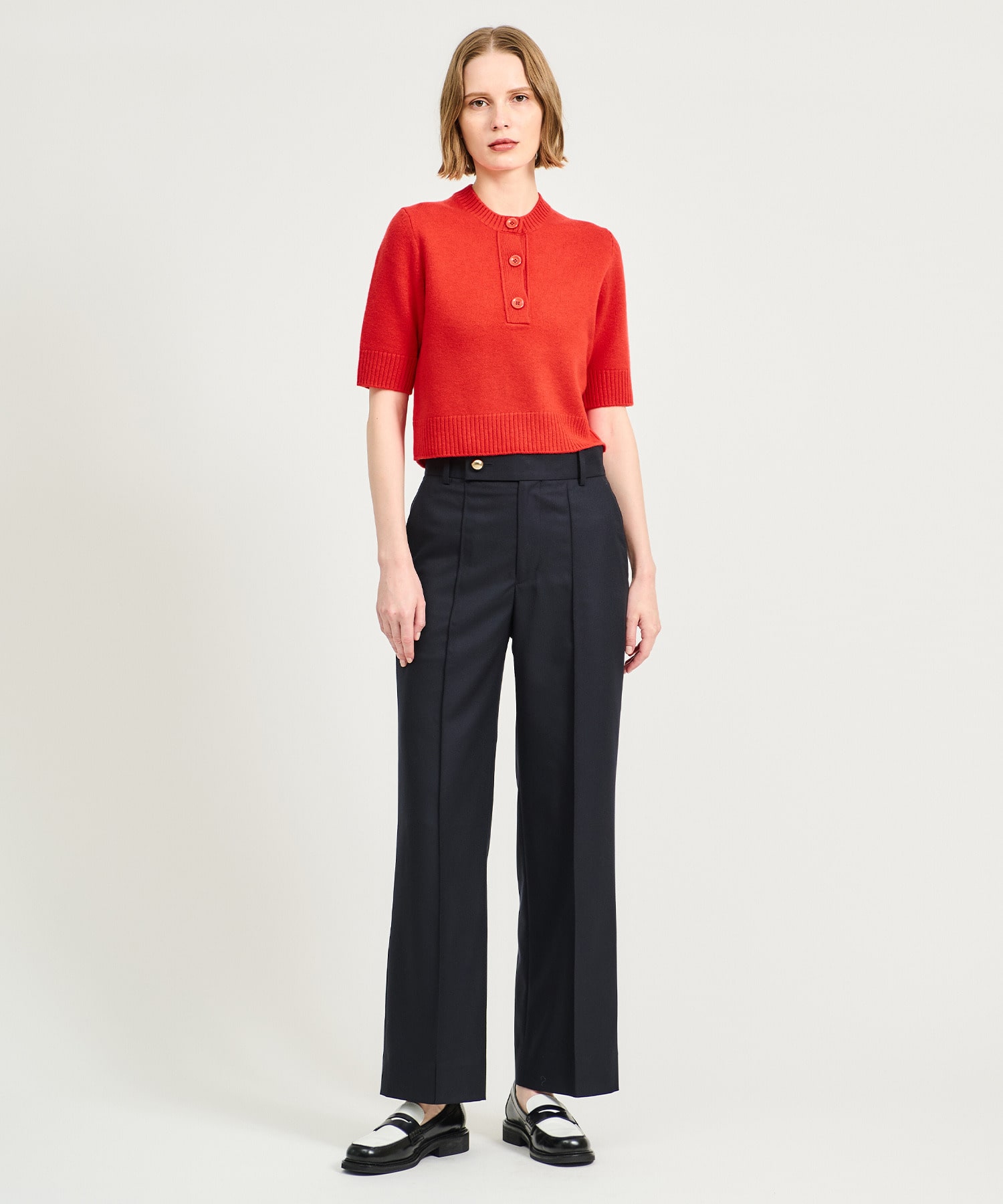 フロントのヘンリーネックがポイントでシャツをインして襟元にレイヤードのアクセントを加えれば、遊びの効いたスタイリングもお楽しみいただけます。