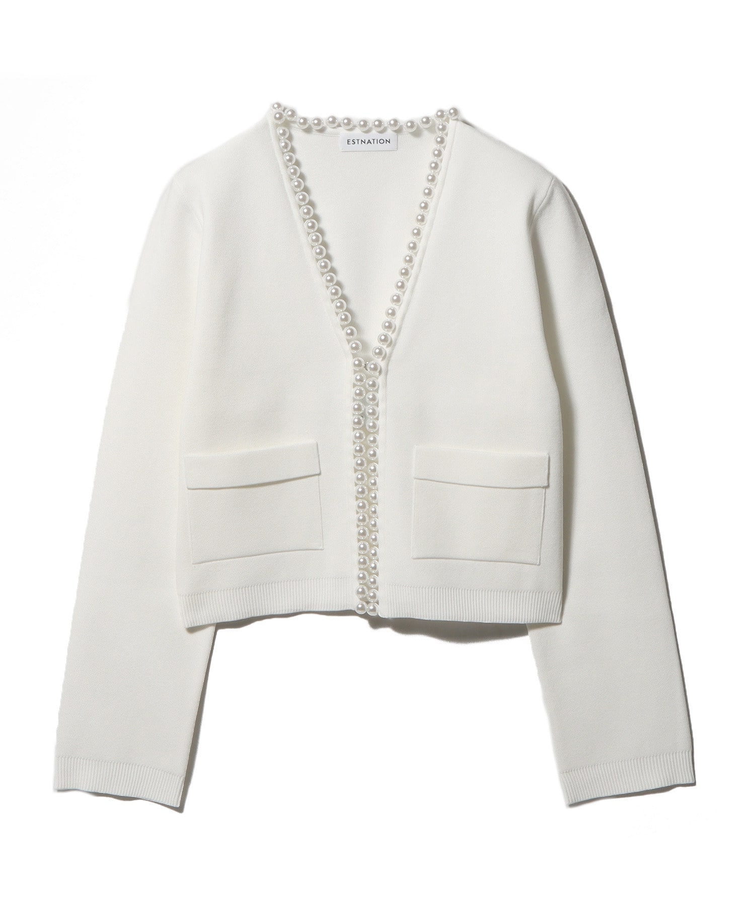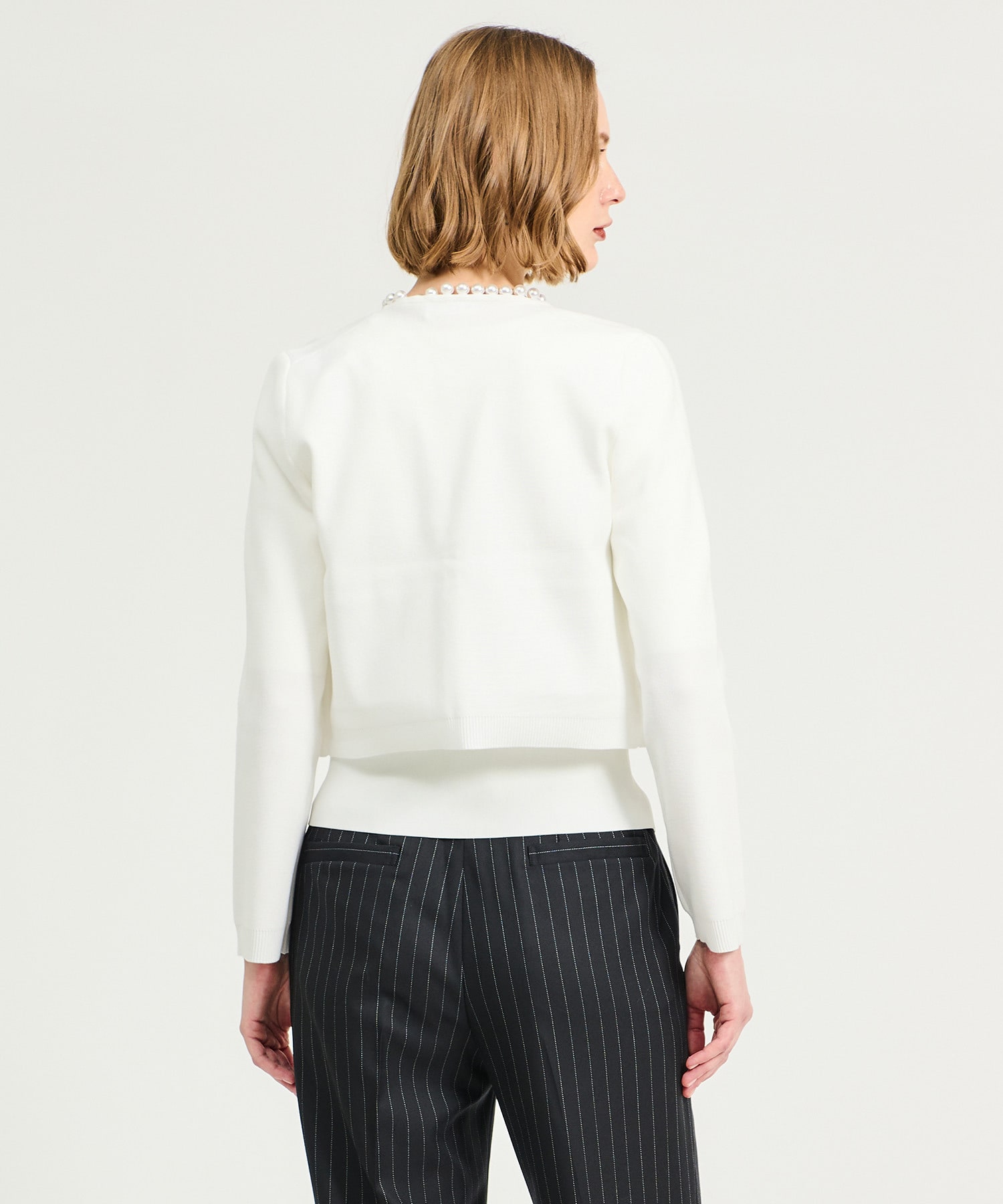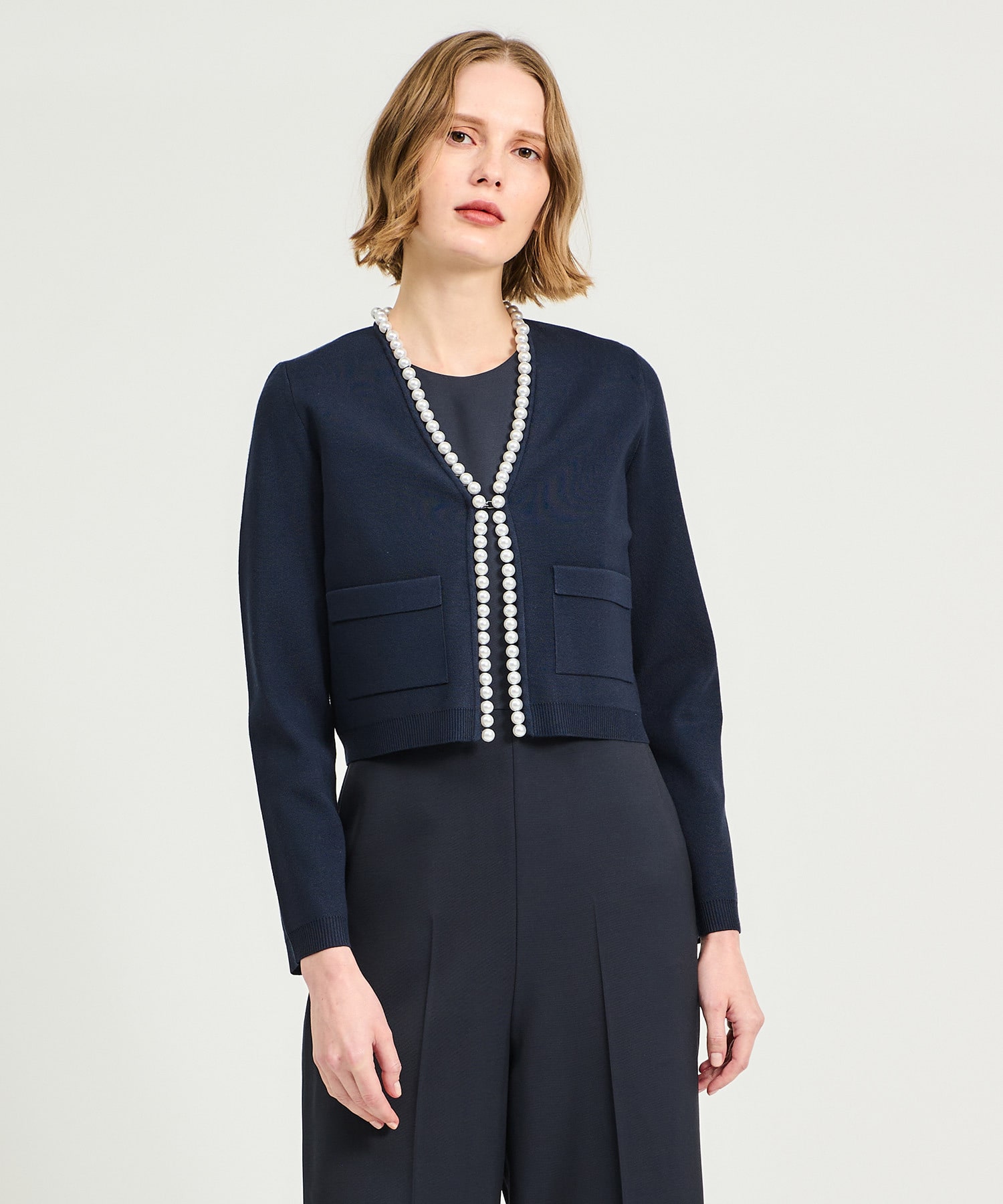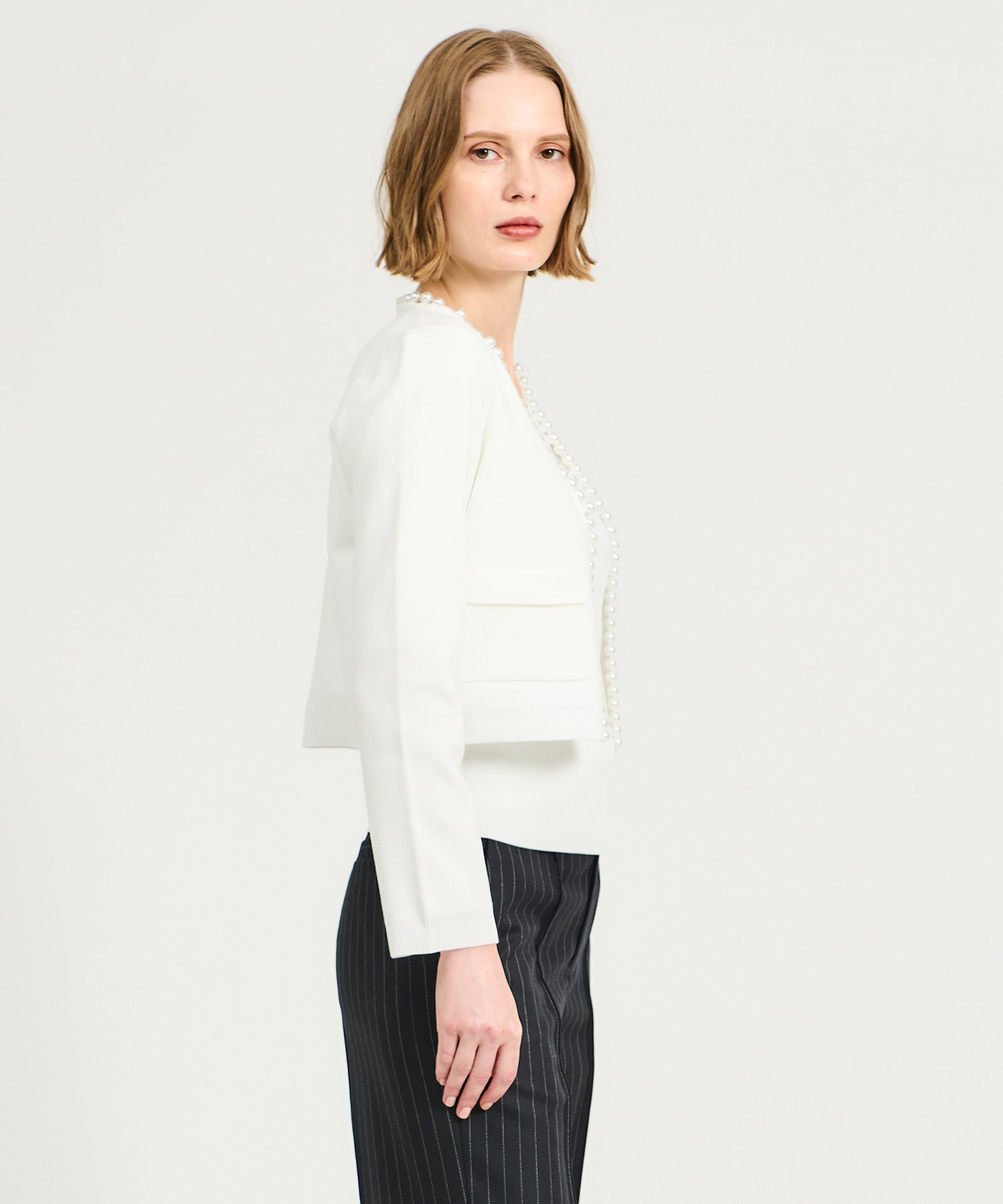 ぐるりとパールをあしらったアクセサリーのようなニットボレロ。