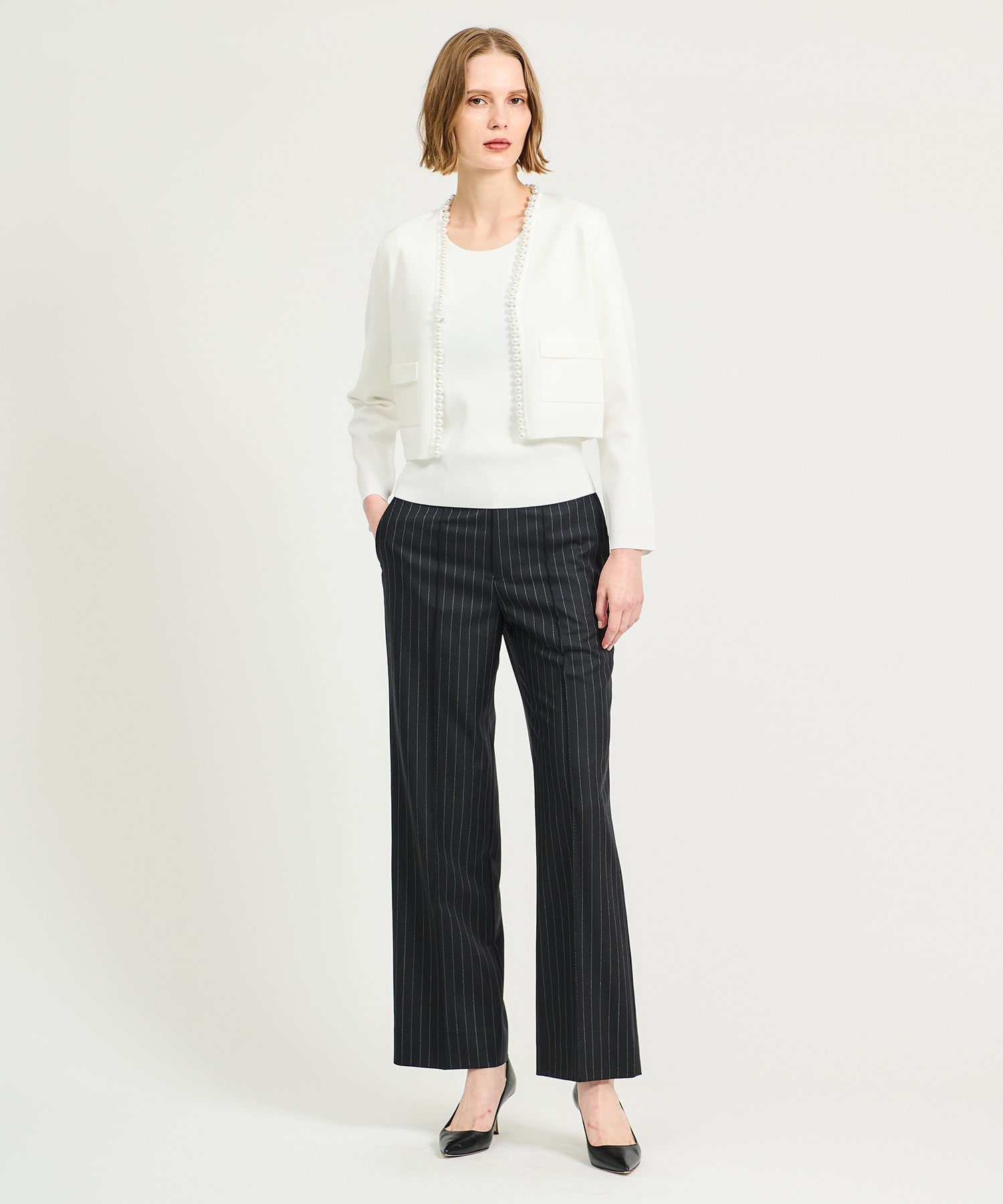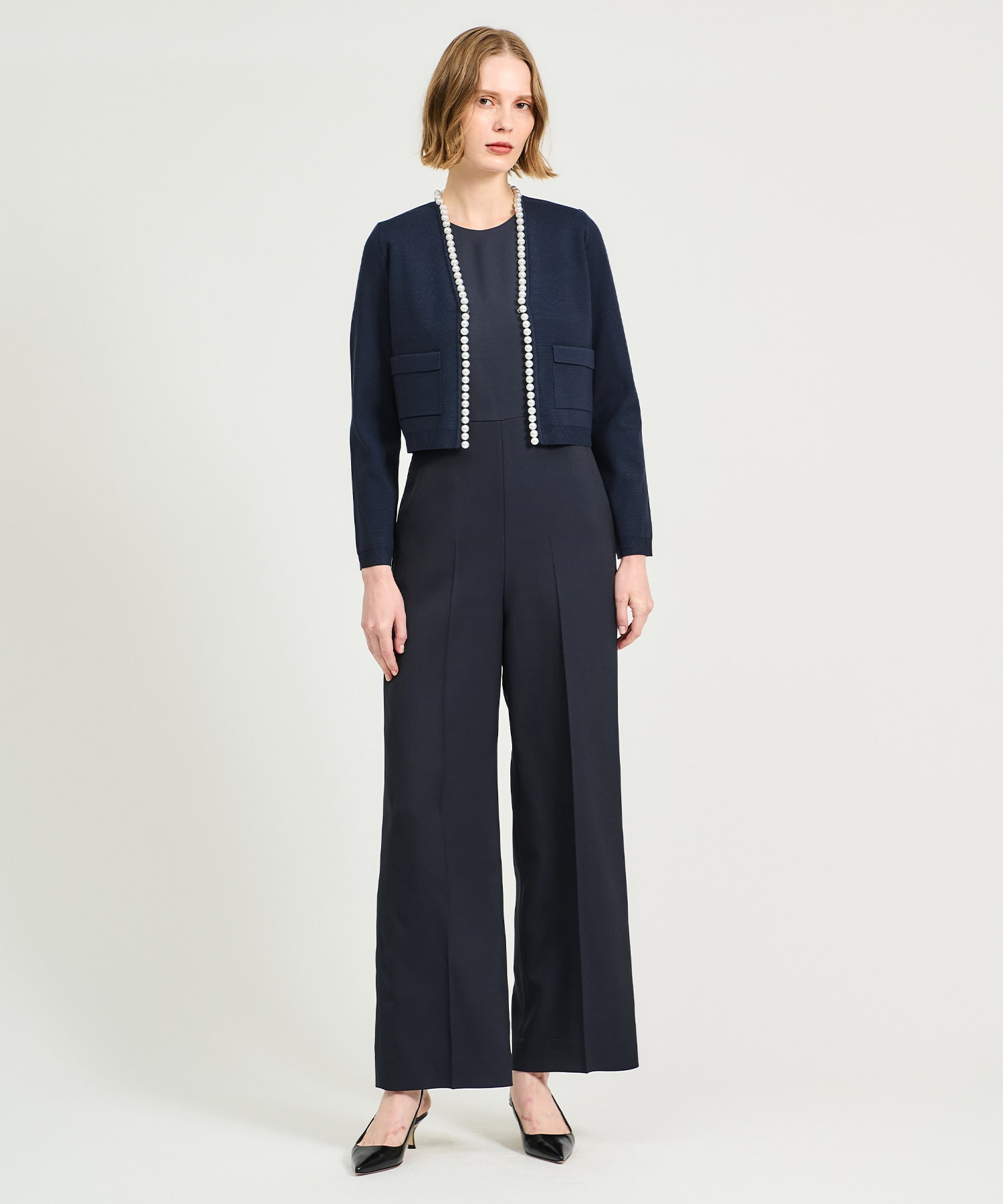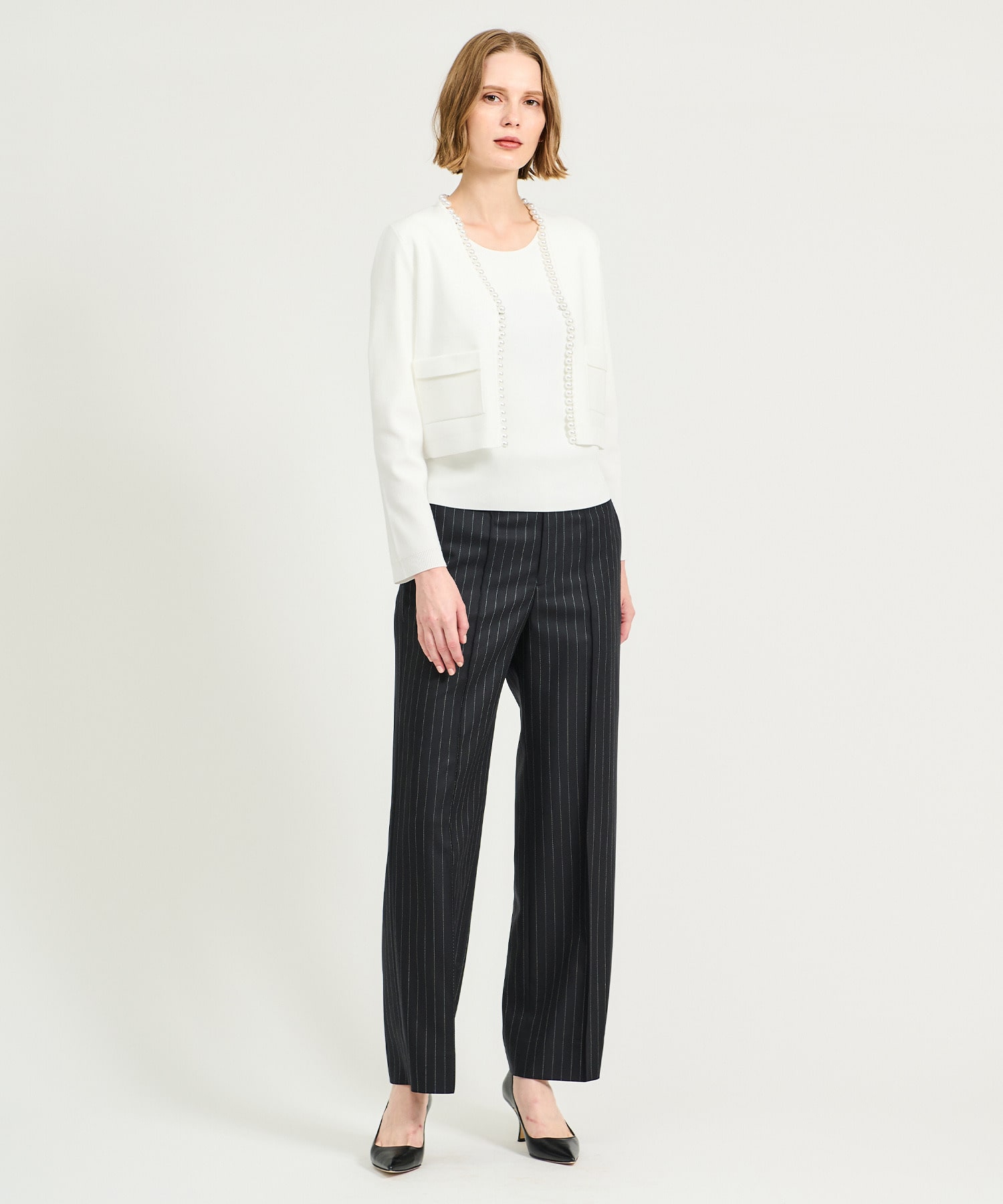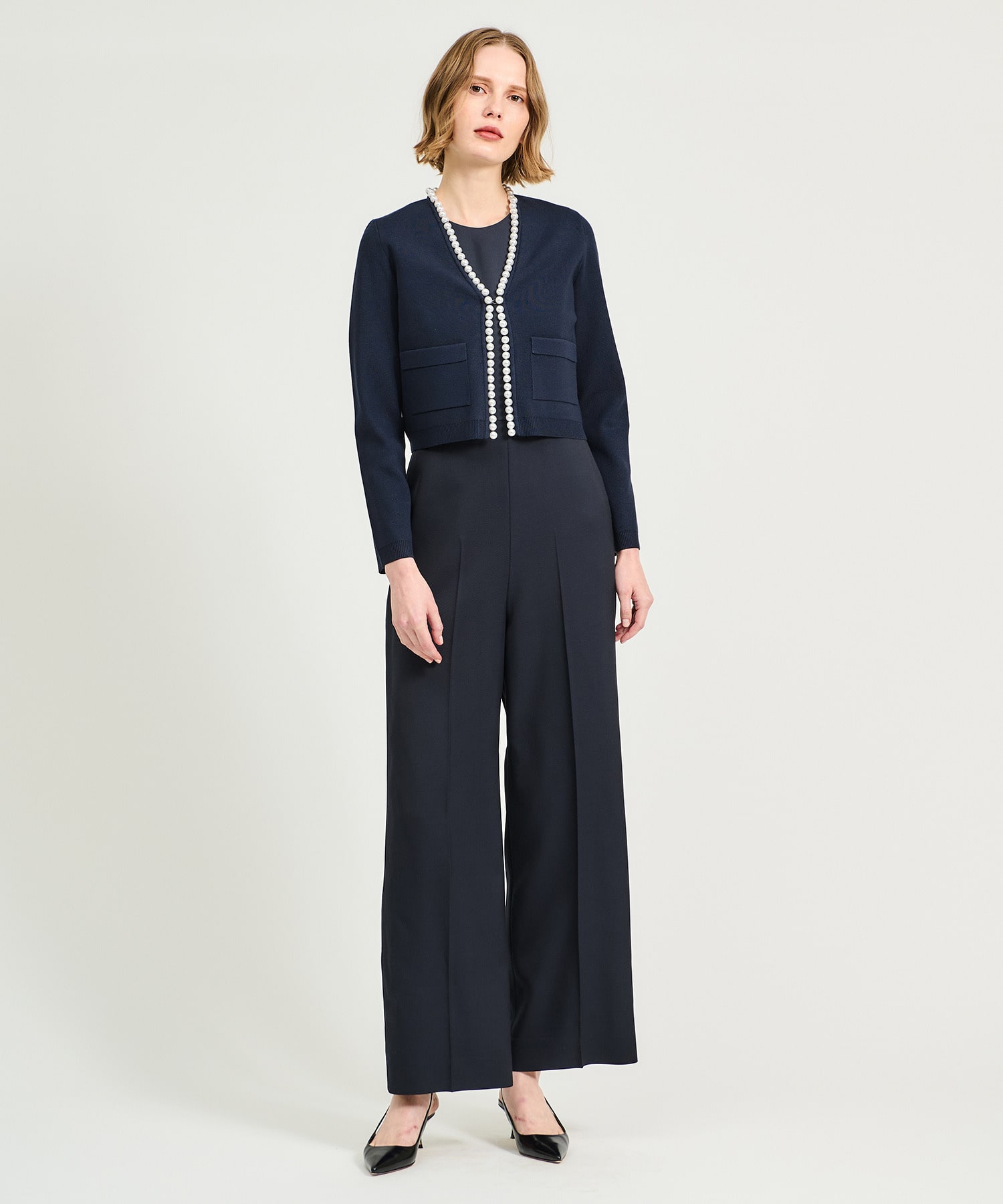 ぐるりとパールをあしらったアクセサリーのようなニットボレロ。