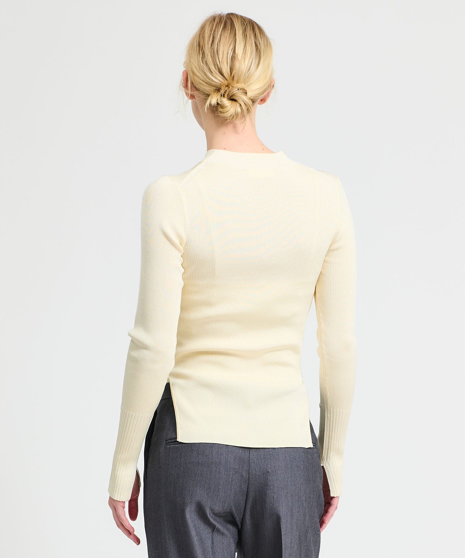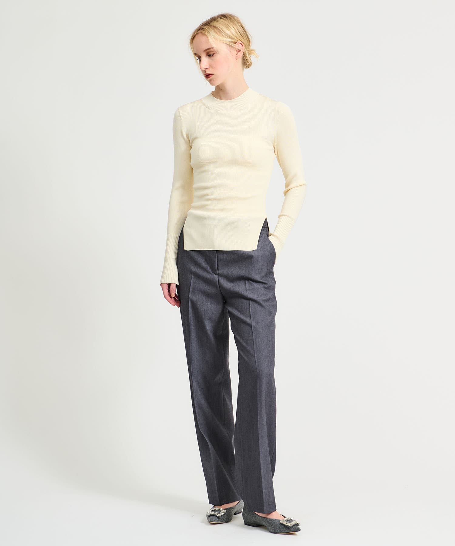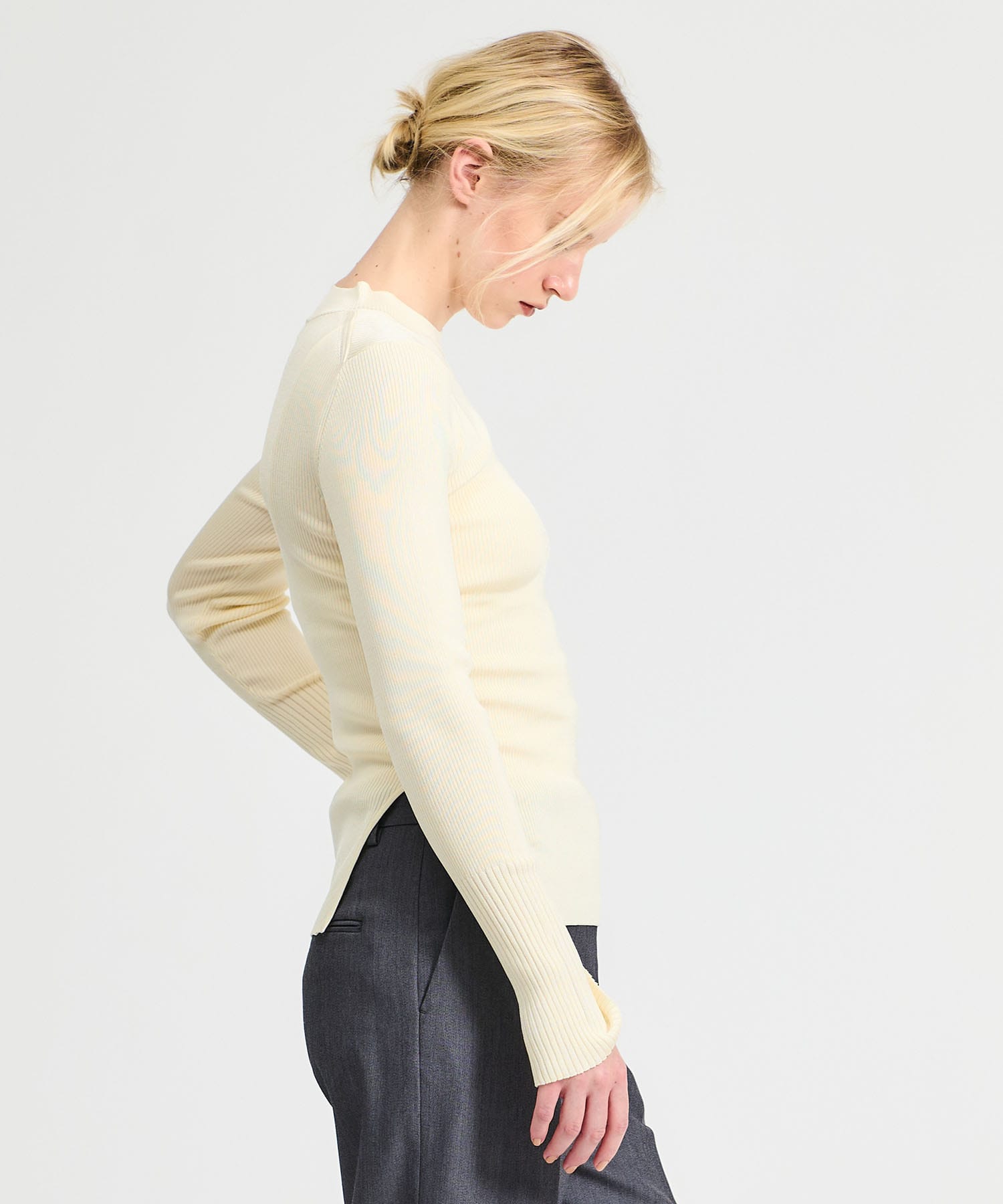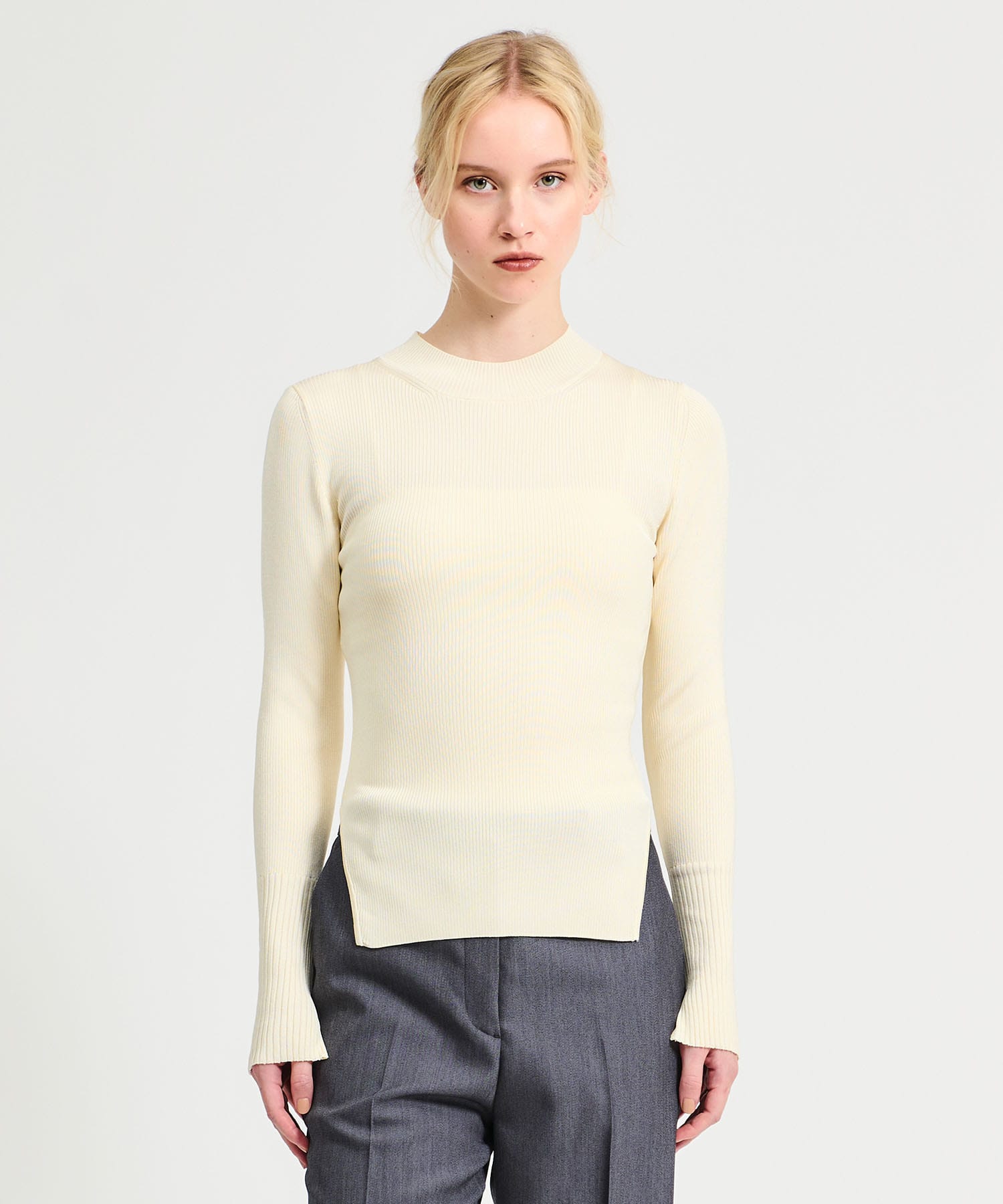 シャープなレーヨンの光沢感が、マットな素材が多くなる季節に映えるインナーニットです。