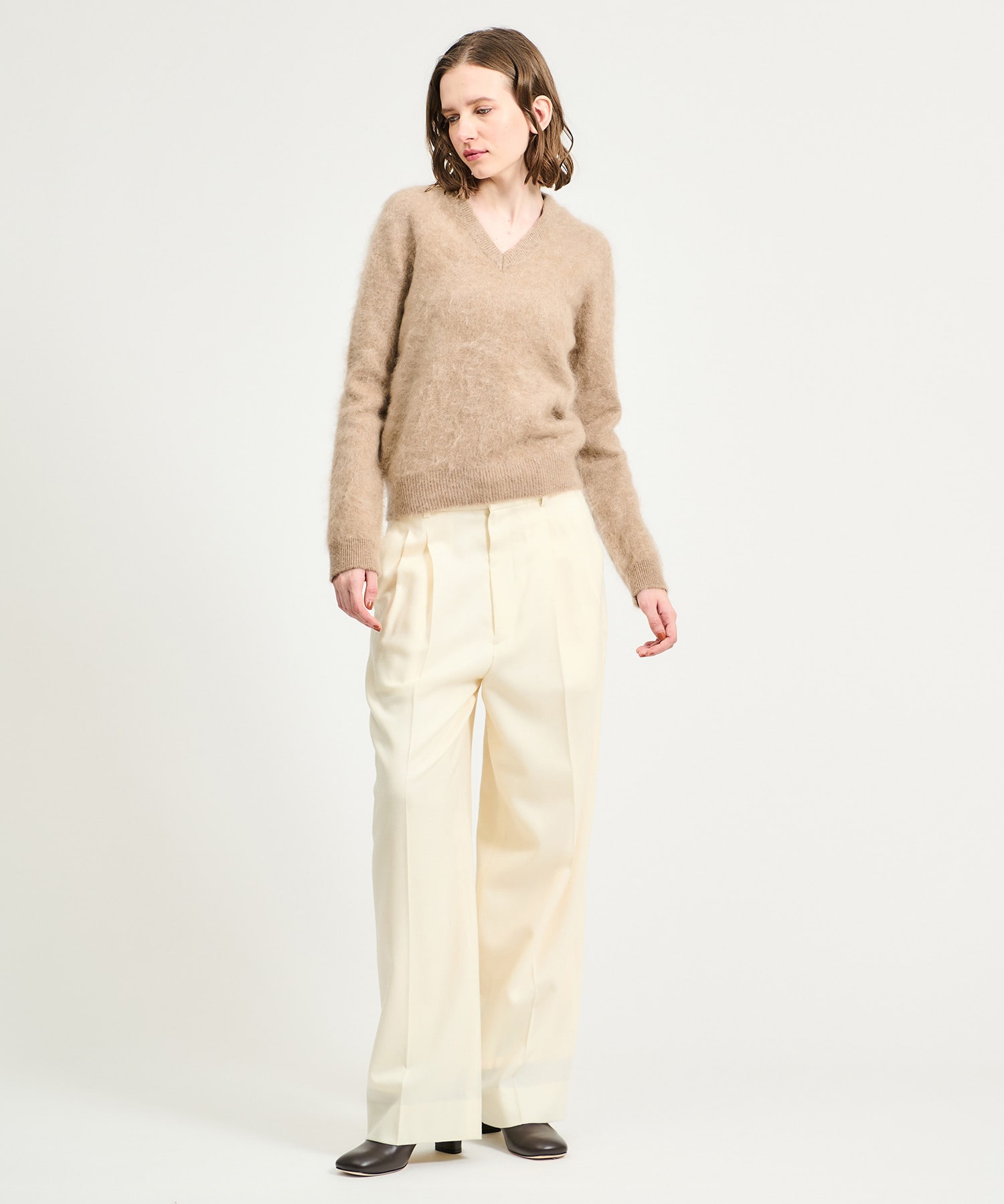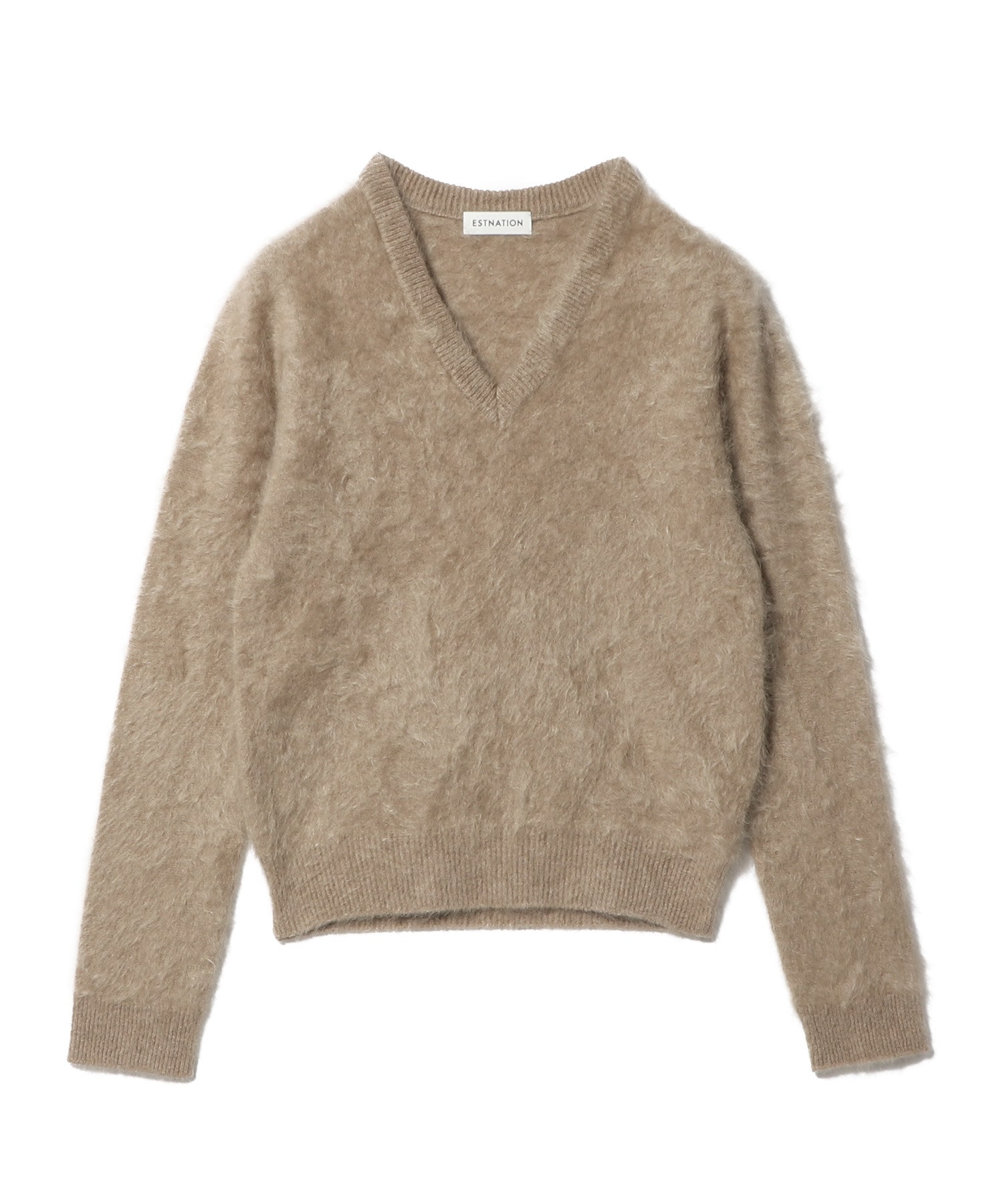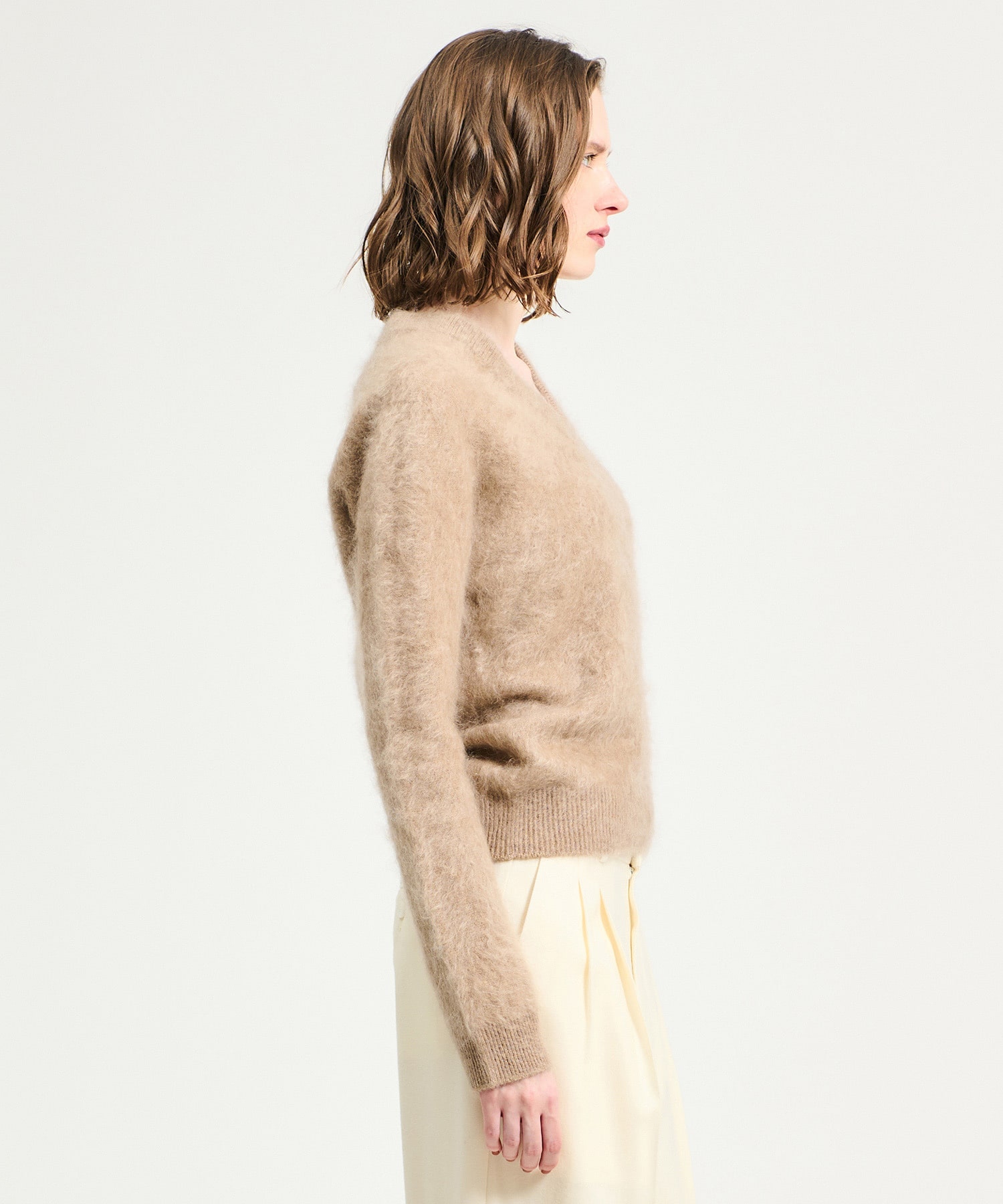 カシミア100%の編地にファー加工を施したVネックプルオーバー。