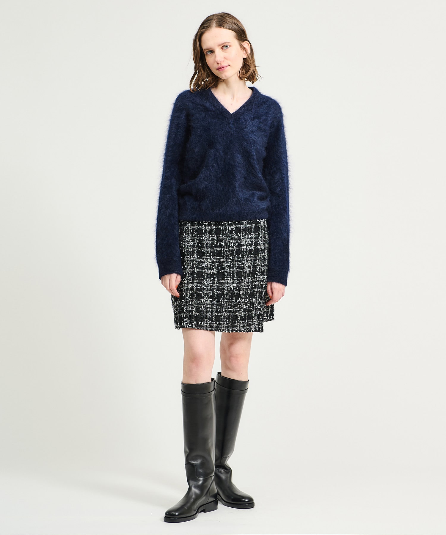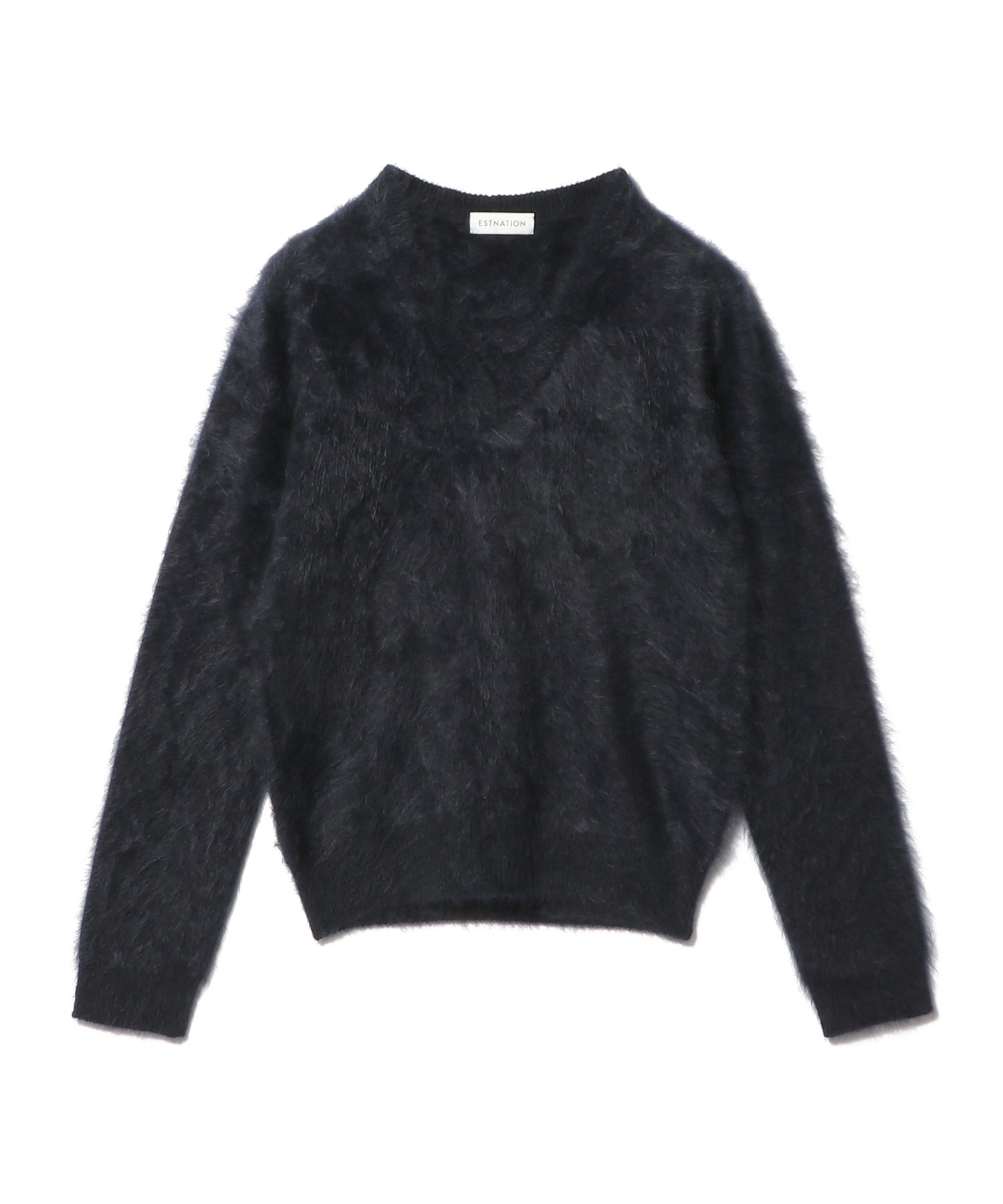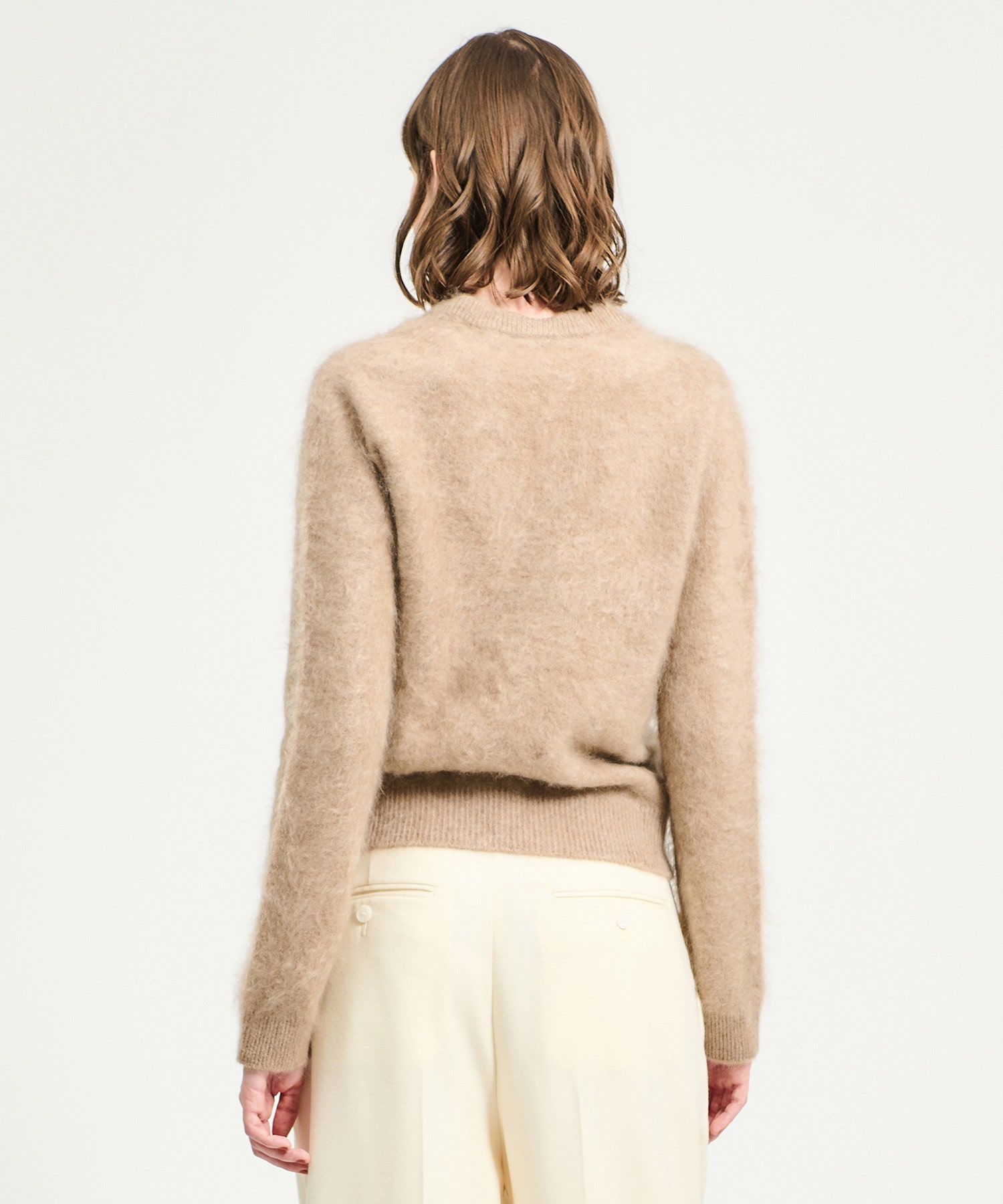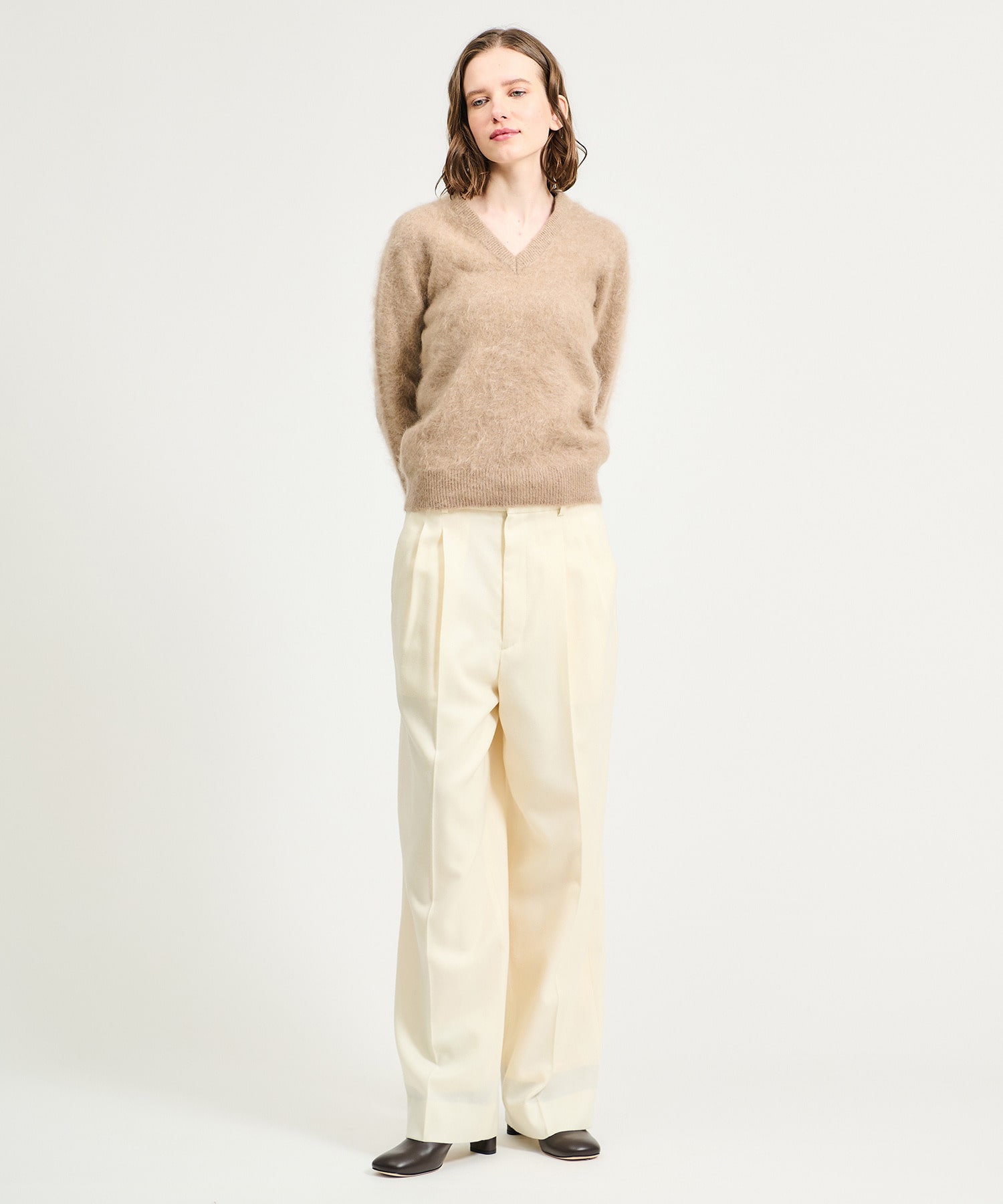 カシミア100%の編地にファー加工を施したVネックプルオーバー。