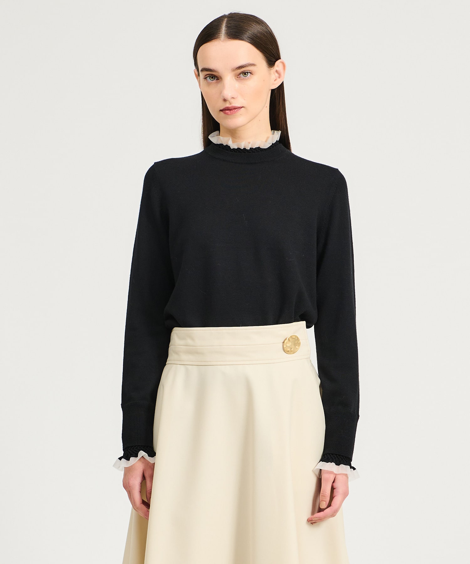 シンプルなボディに、ネックと袖口にスモッキングテクニックを効かせたシアー素材のフリルをレイヤードしたデザイン。レイヤードした部分も美しくみえるよう、こだわりました。ベーシックなアイテムながら、上品な華やかさもプラス。