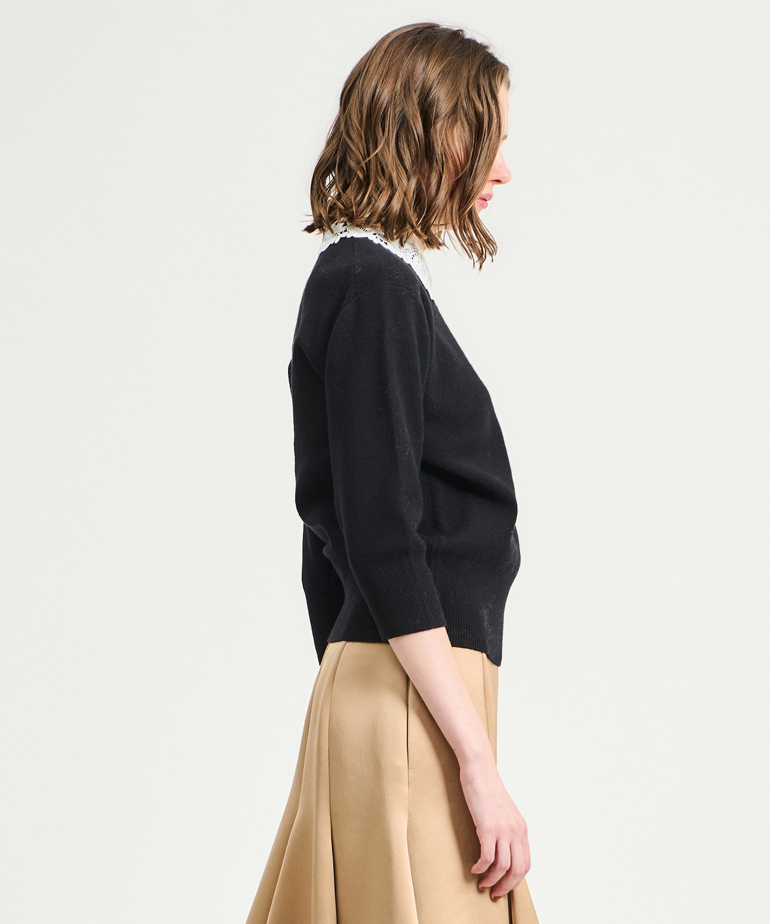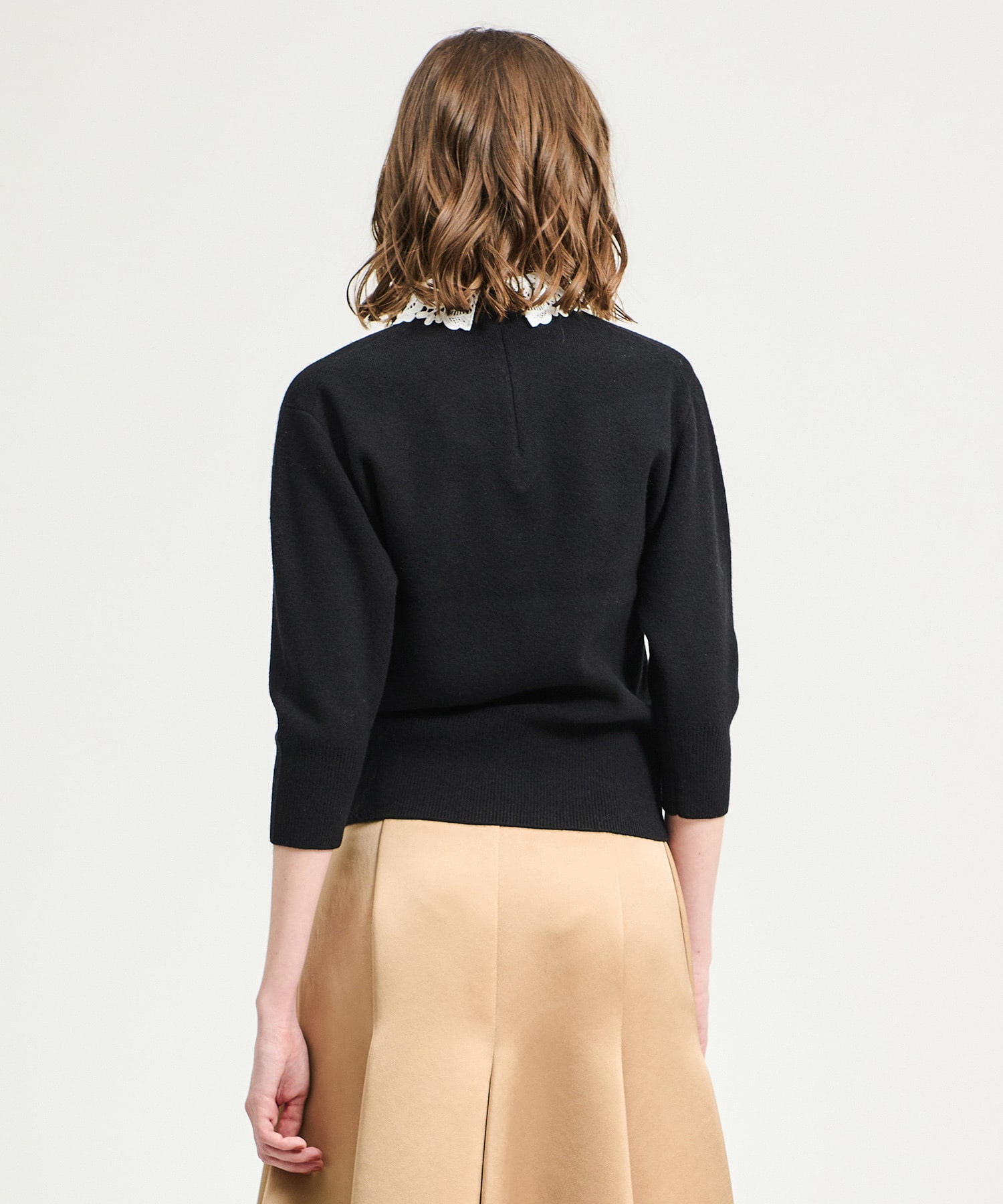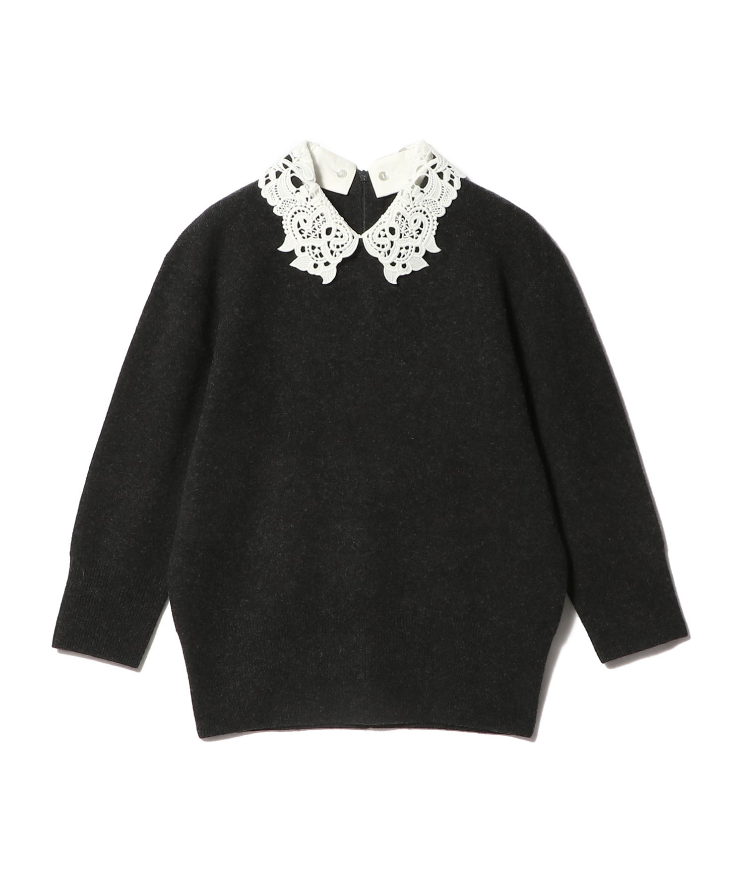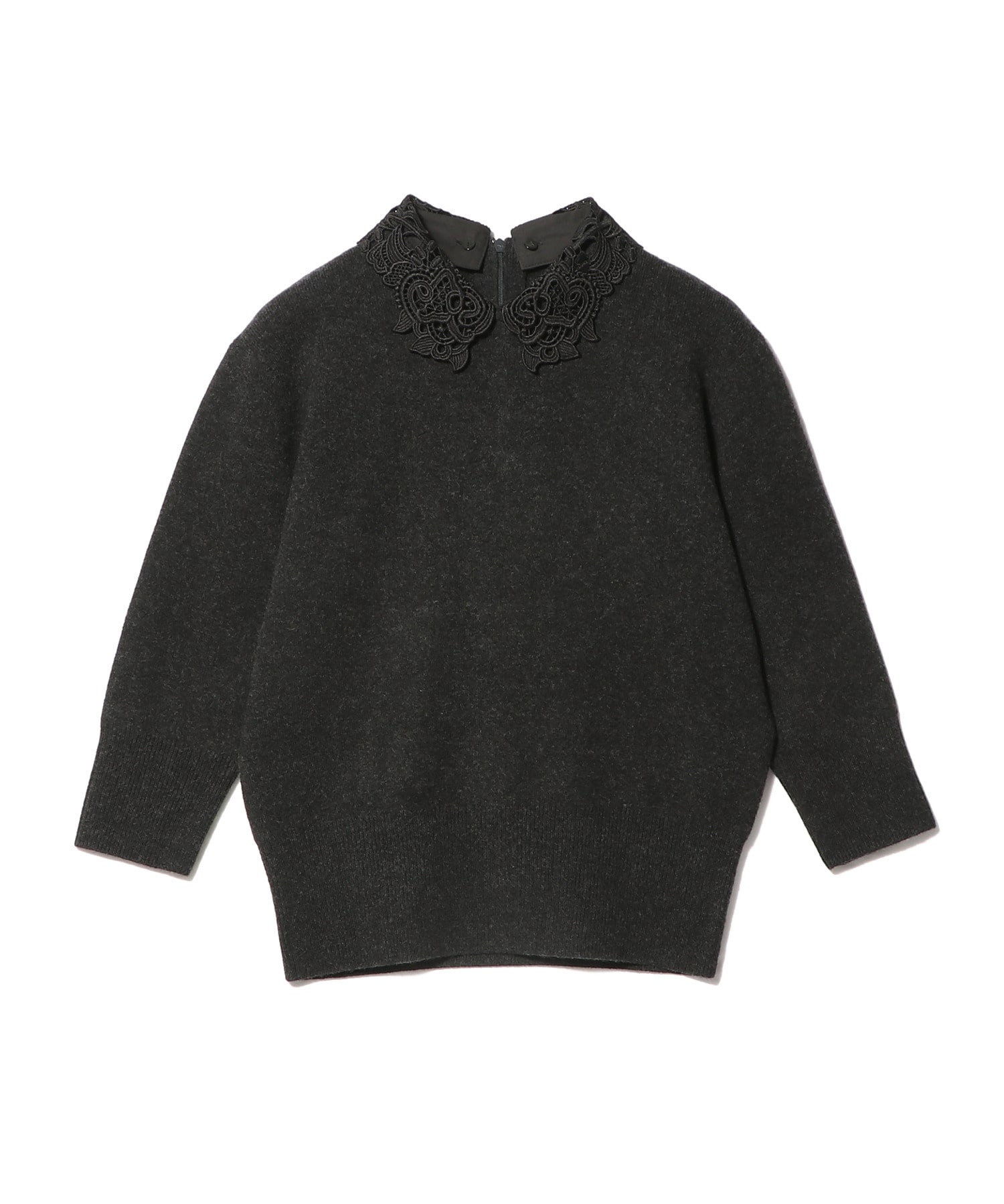 オリジナルで作成したレース襟はビンテージ感のあるデザインが印象的。襟を外せばシンプルなニットとしても着用できます。