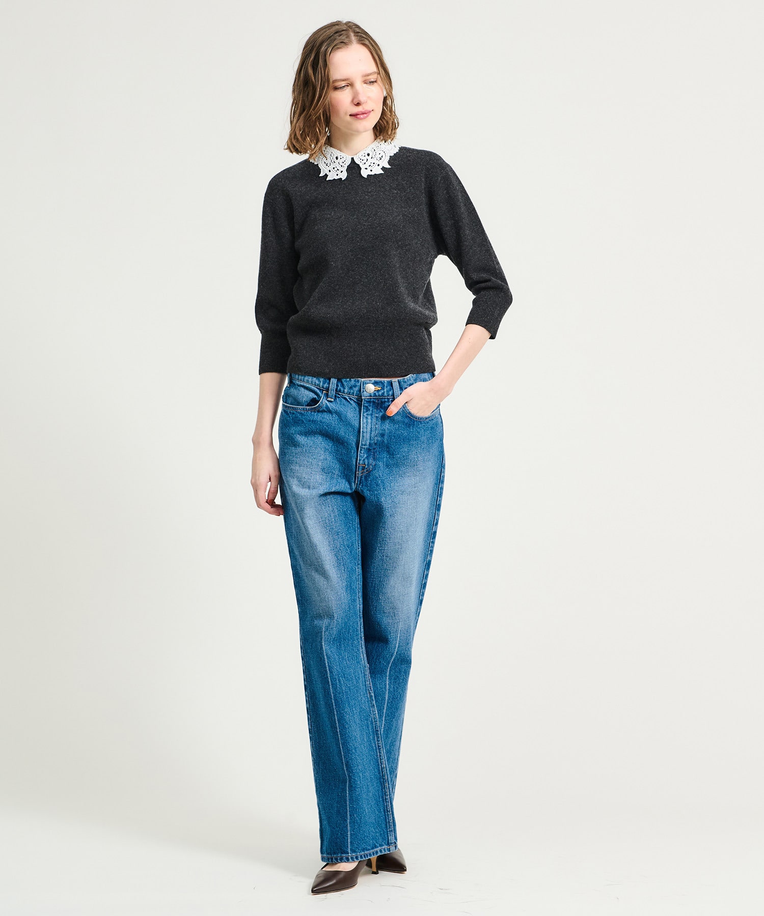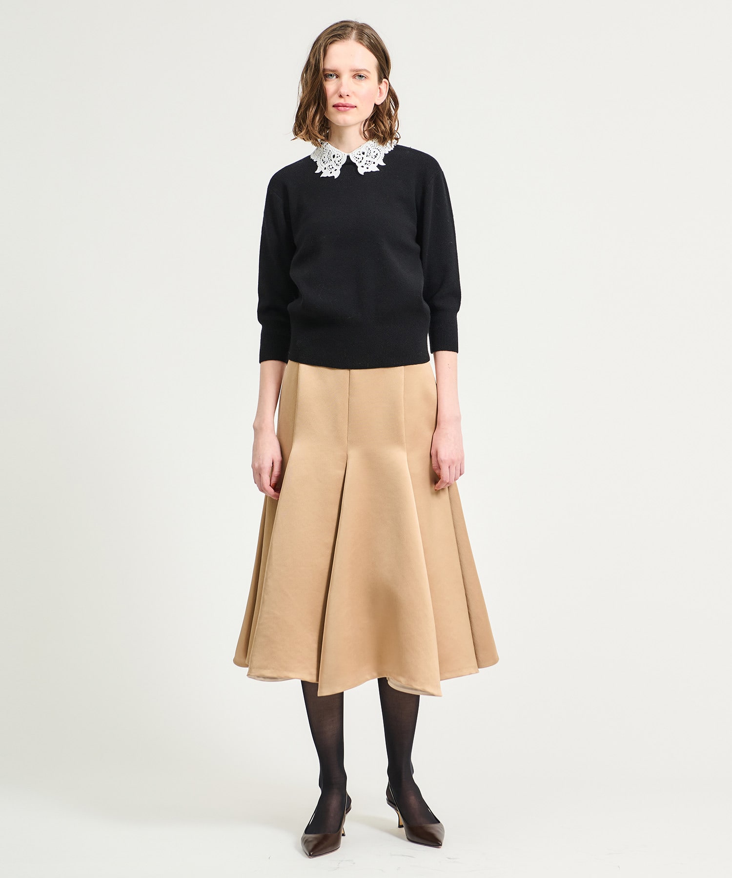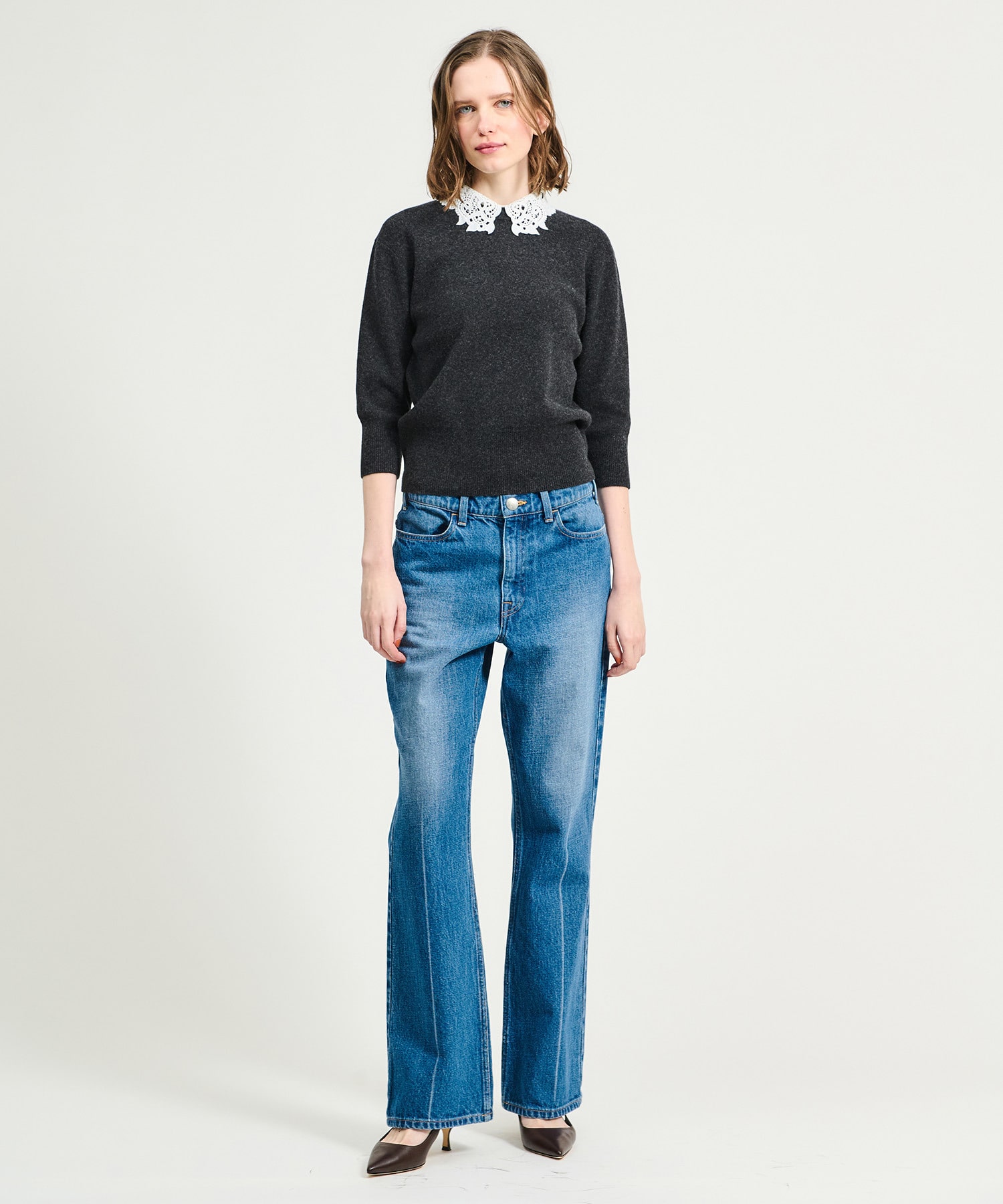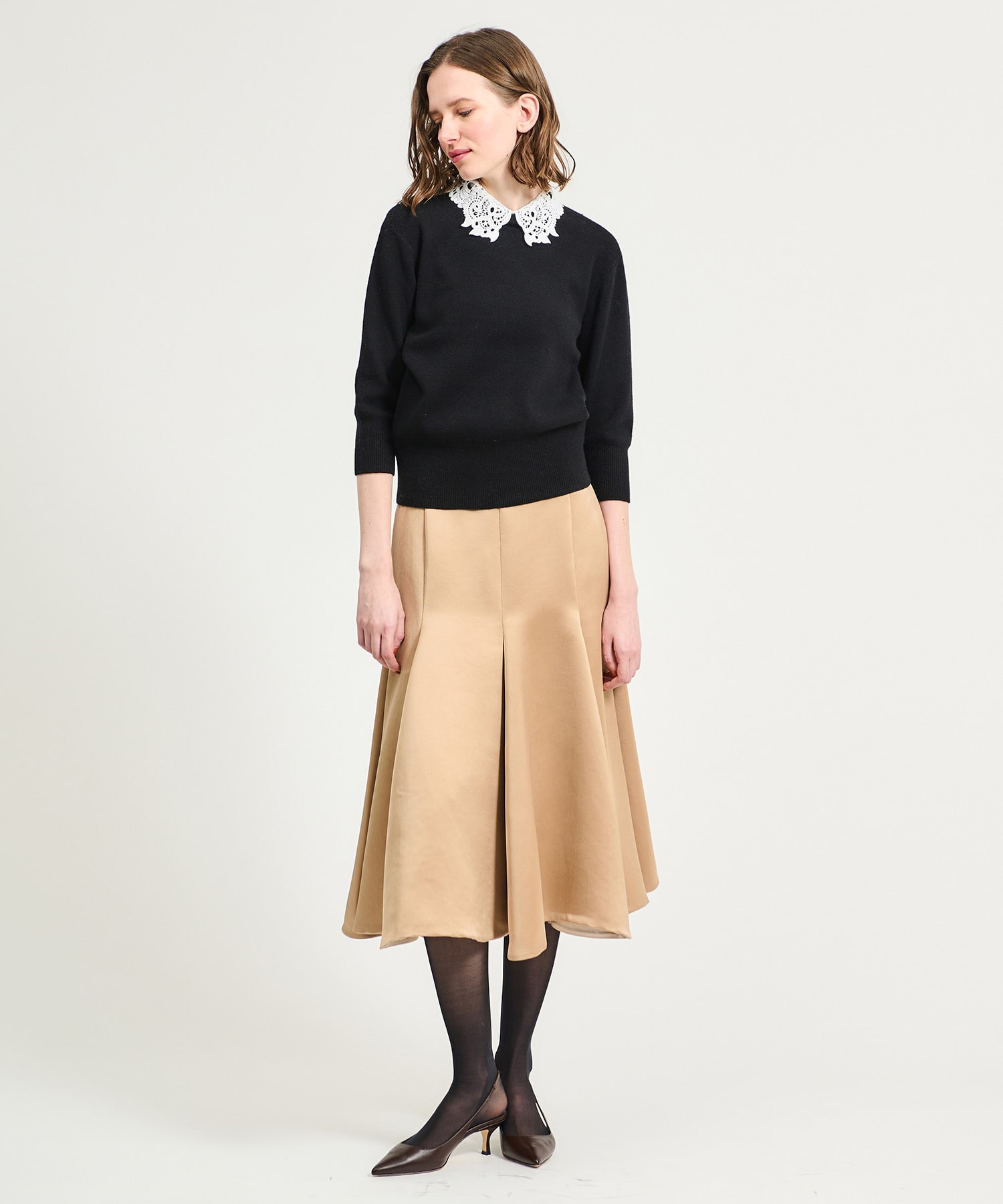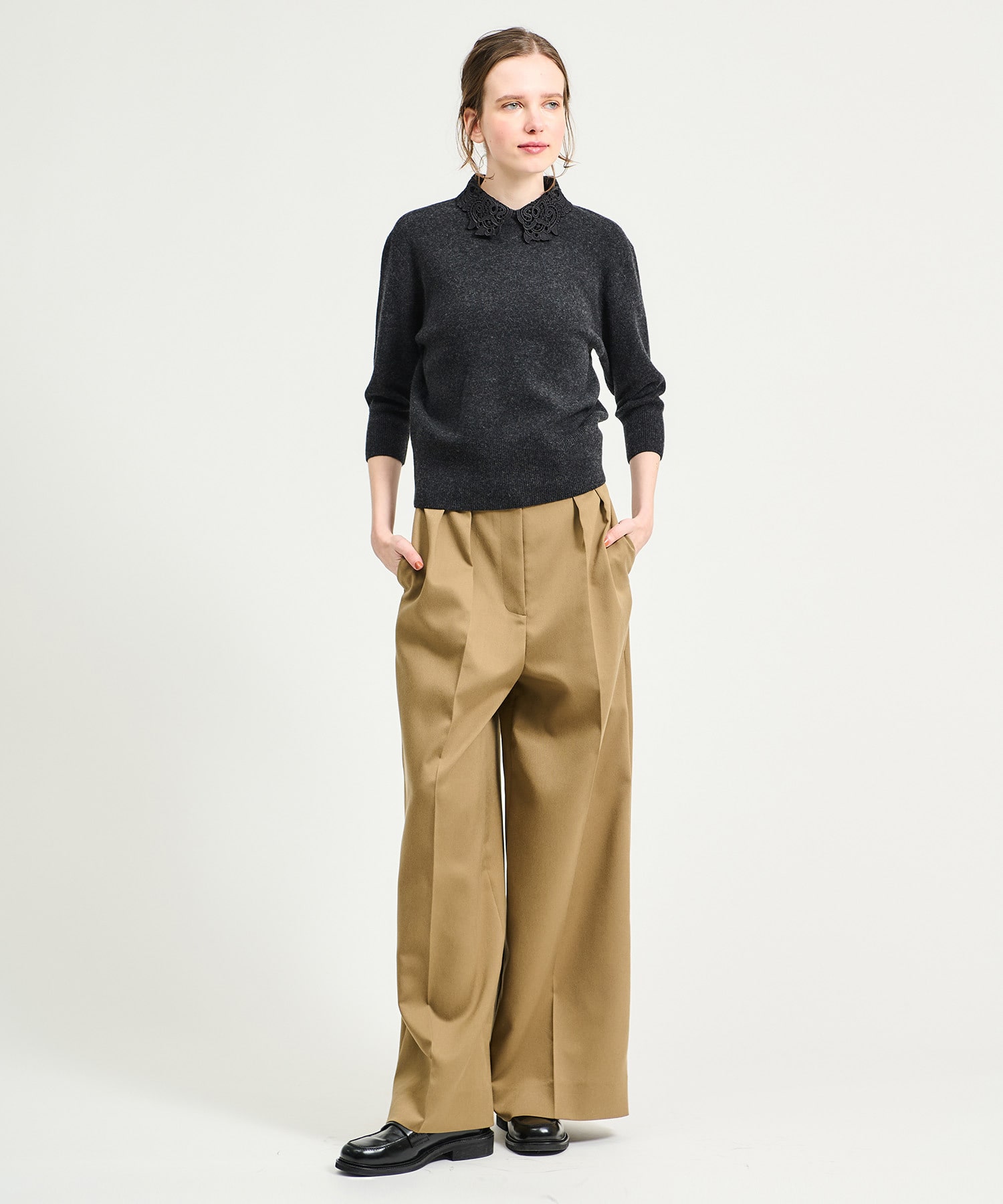 オリジナルで作成したレース襟はビンテージ感のあるデザインが印象的。襟を外せばシンプルなニットとしても着用できます。