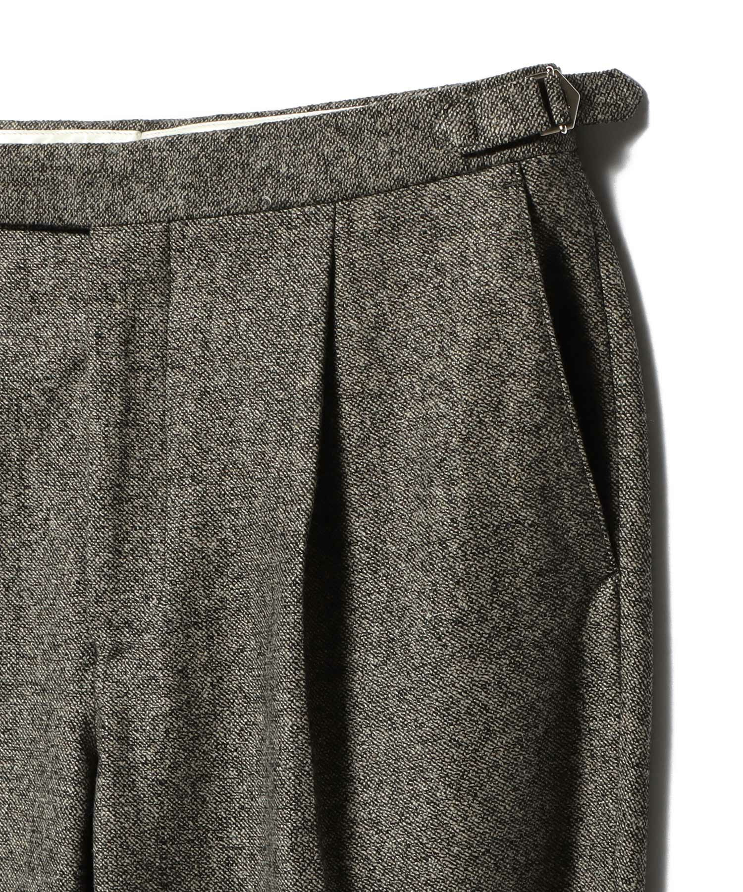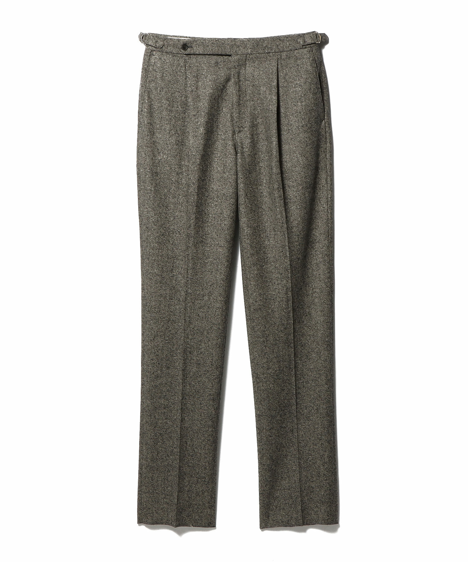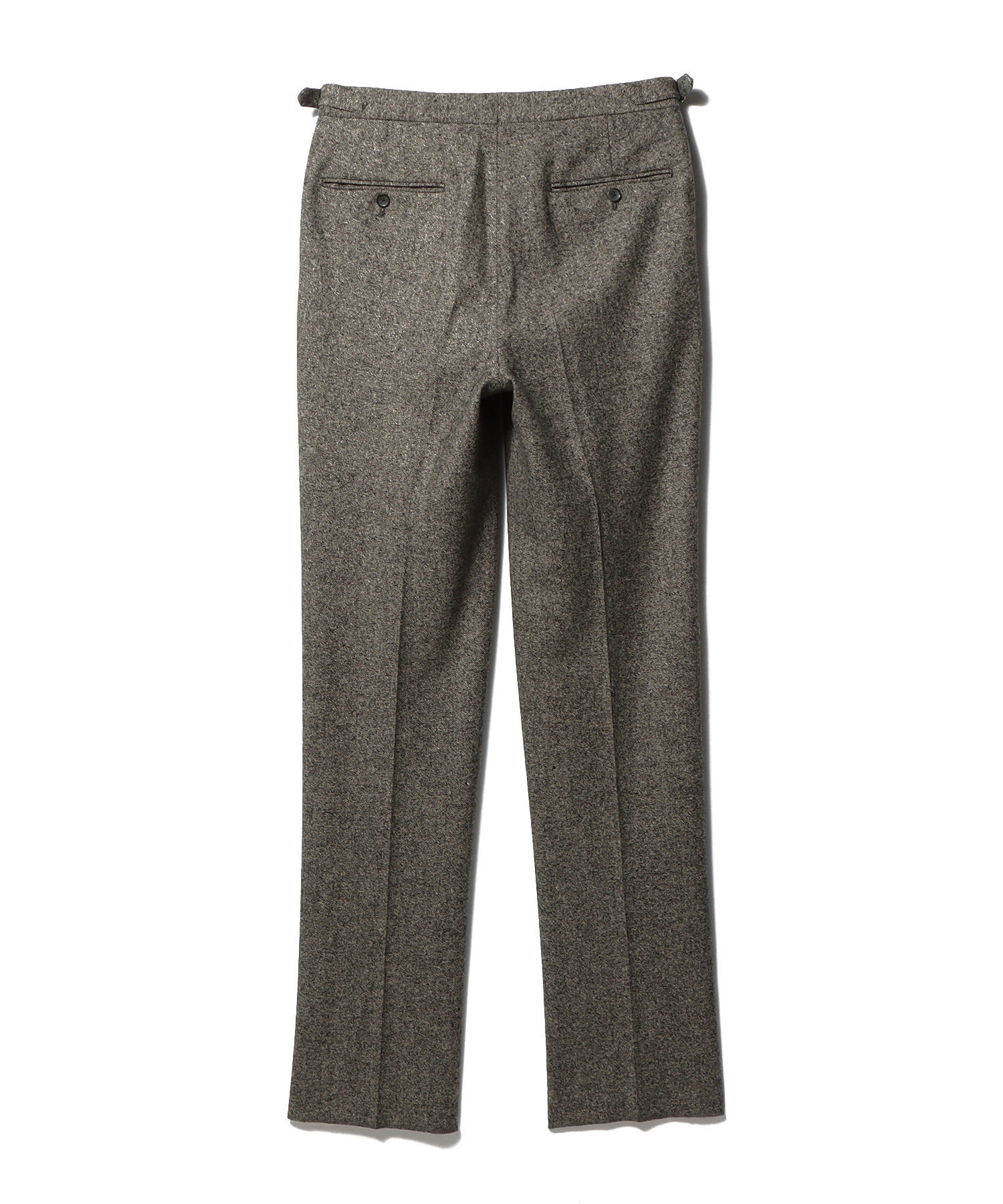 デザインは、内側にサスペンダーボタンを備えた1プリーツ仕様。ウエストはサイドアジャスターで調整可能となっております。フロントには長めの持ち出しを取り入れ、さりげないアクセントに。