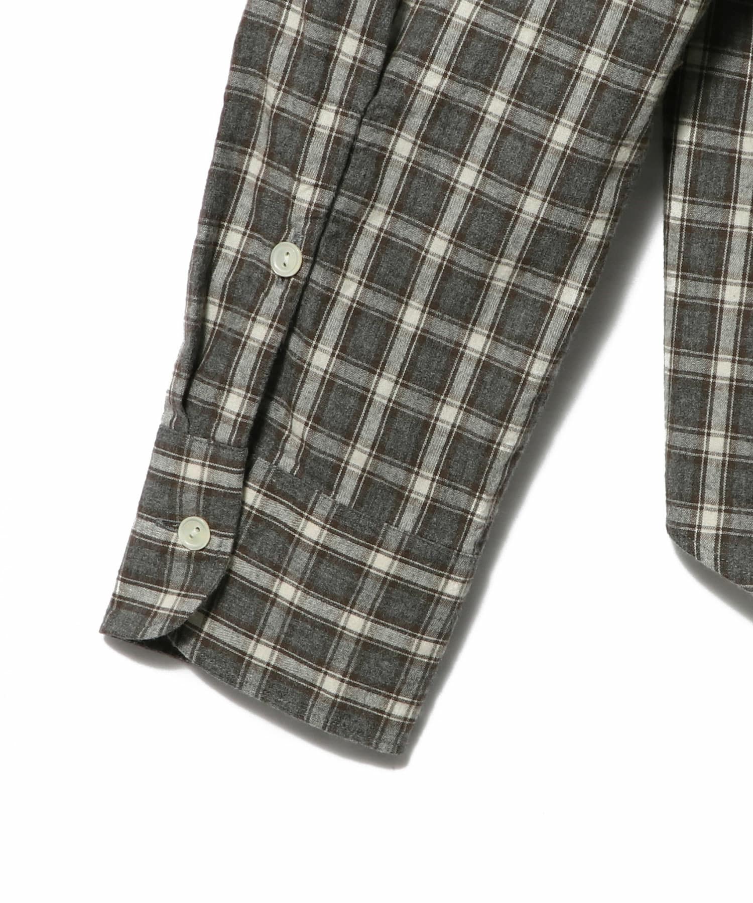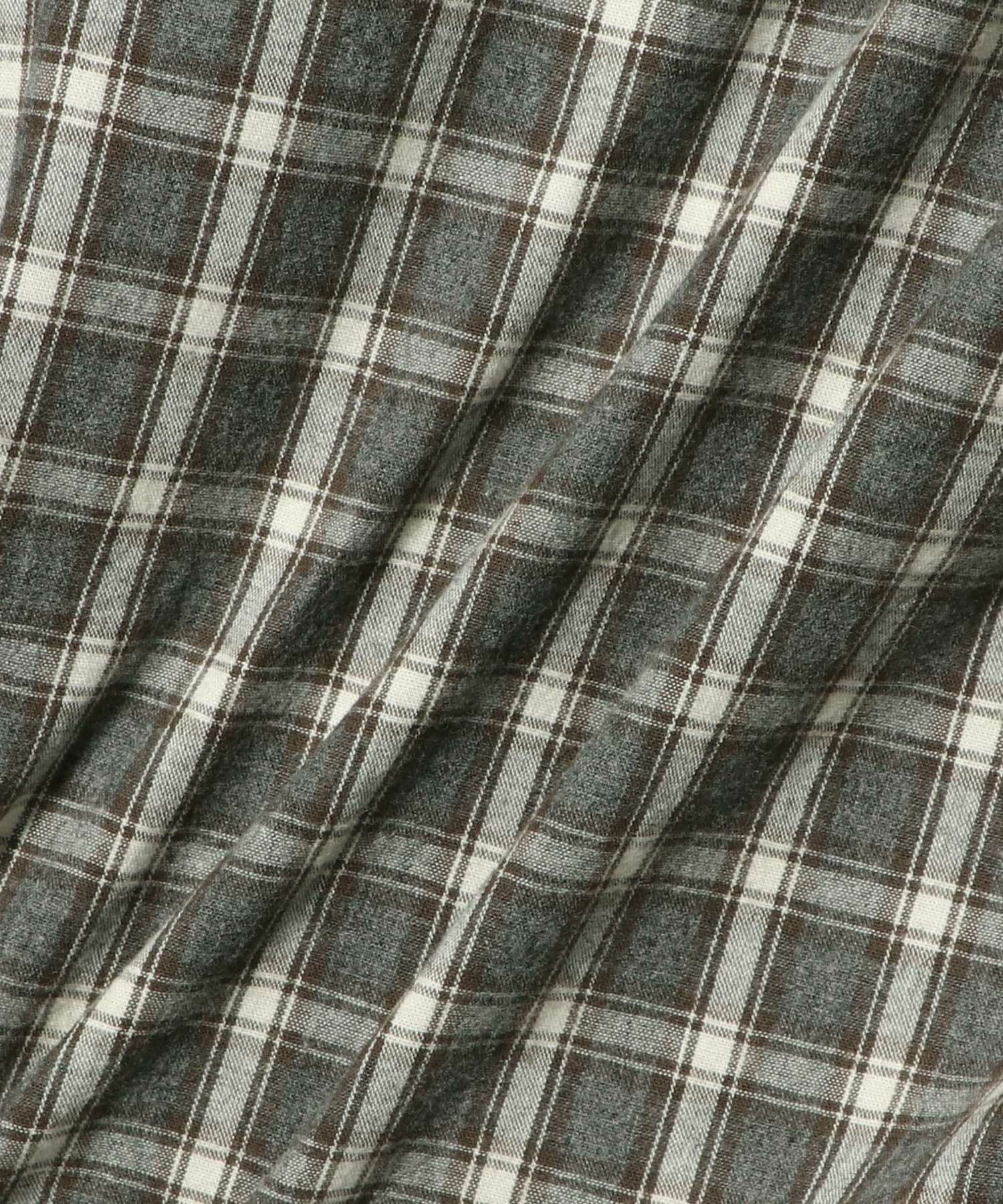 繊細な起毛加工によって生まれる柔らかな肌触りと、メランジ糸によるフェード感のあるブラウンチェック柄が、落ち着きと奥行きのある印象を与えます。
