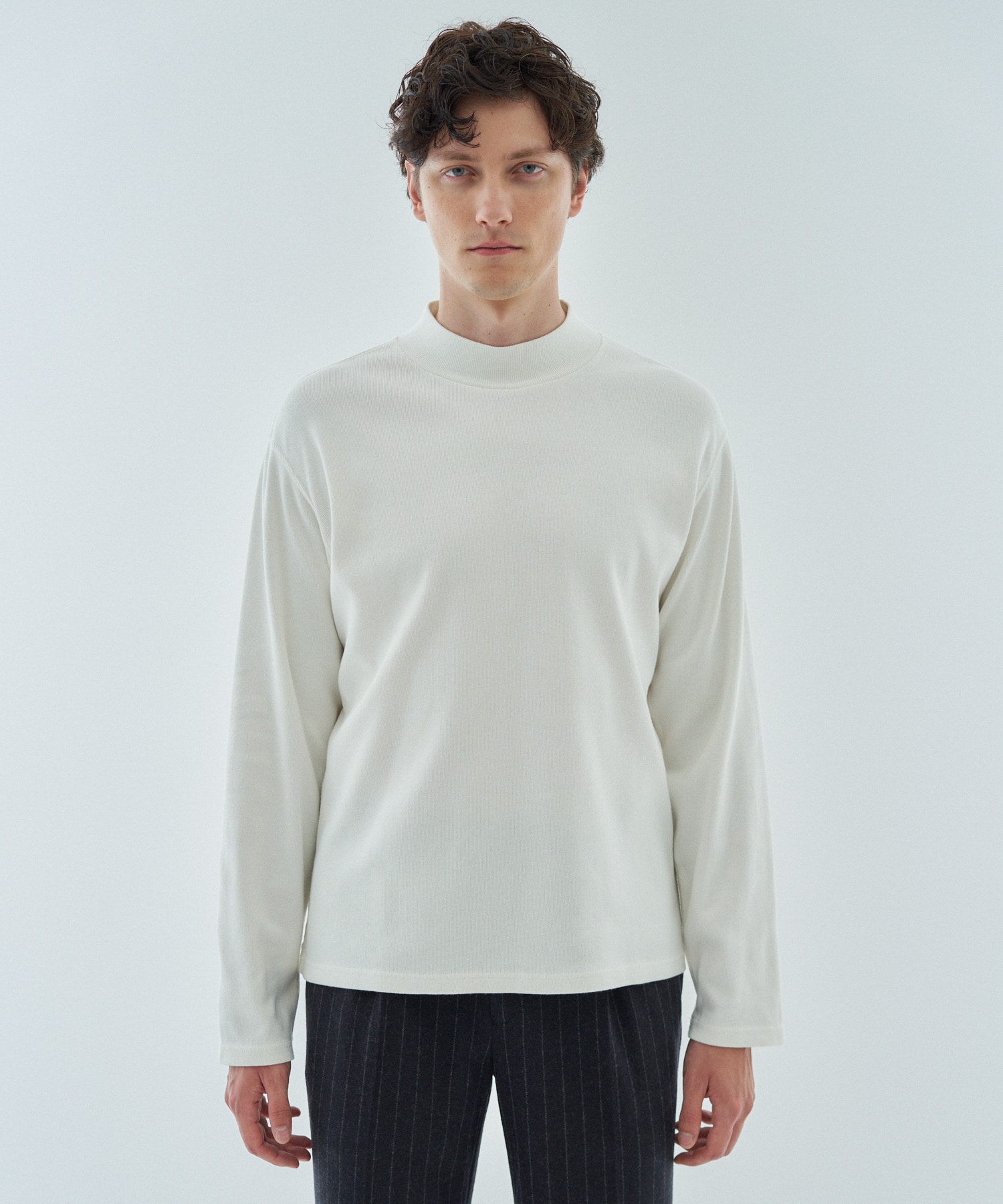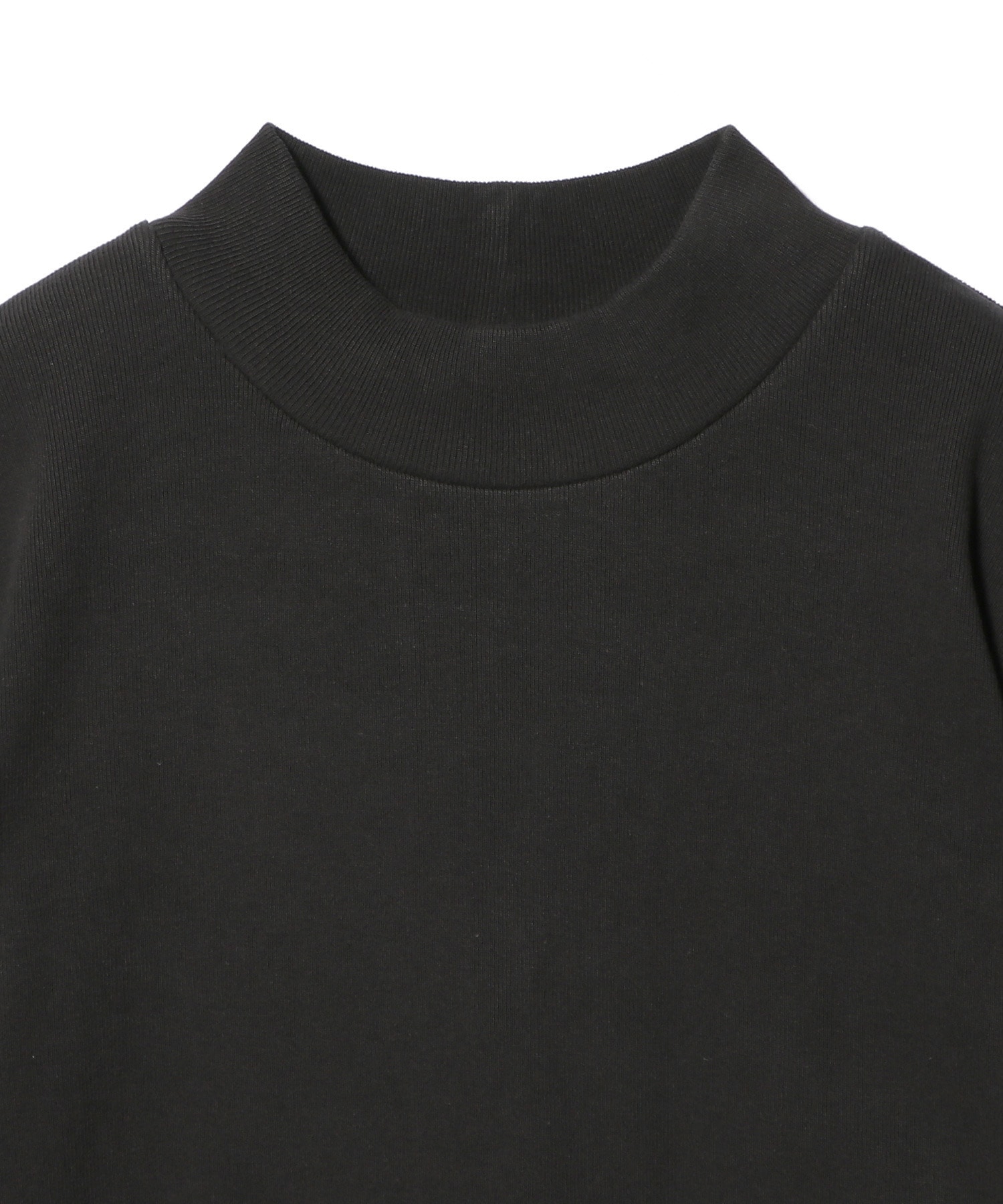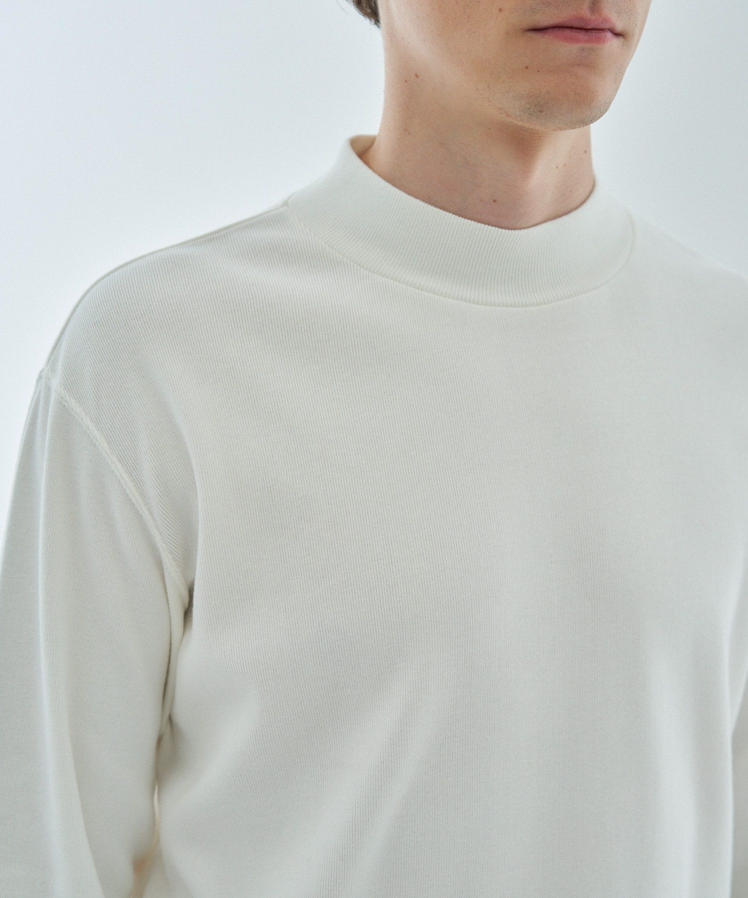二ットのような表情と程よい厚みが魅力の、太番手コットンフライスを使用したモックネックカットソー。