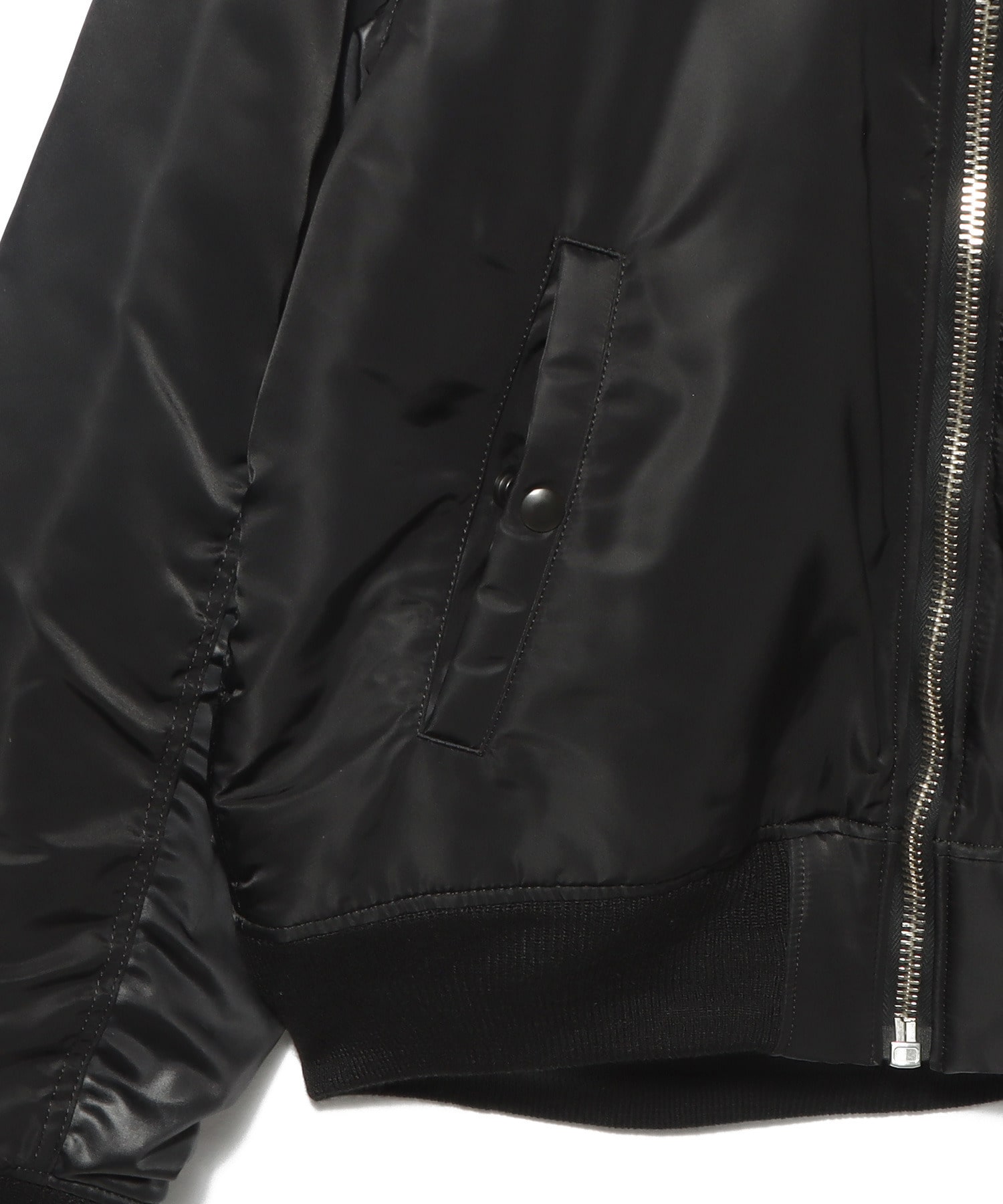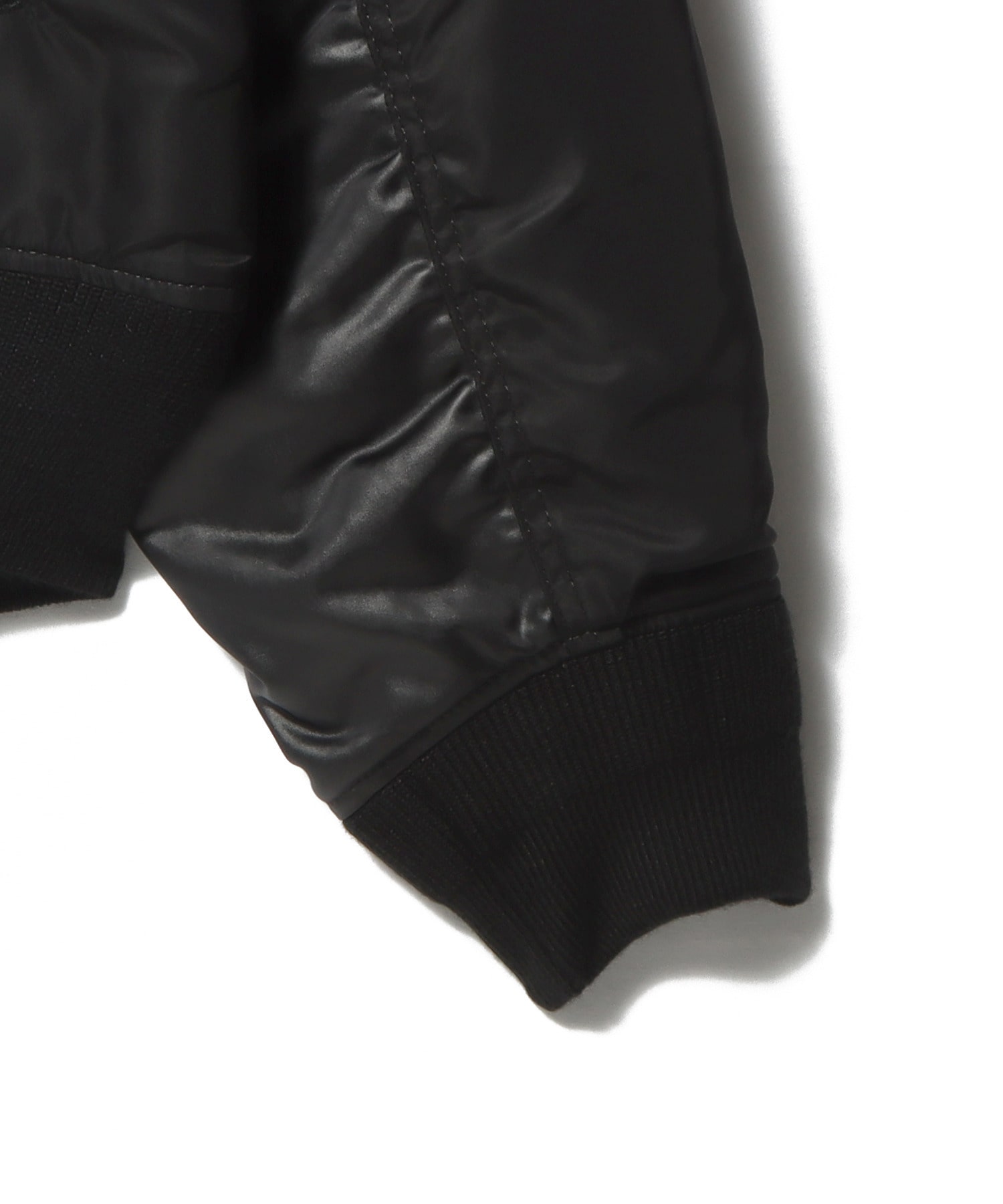 素材表地:ナイロン100%、別布:ポリエステル100%、中わた:ポリエステル100%、裏地:アセテート100%、リブ部分:アクリル85%、毛13%、ポリエステル1%、ポリウレタン1%