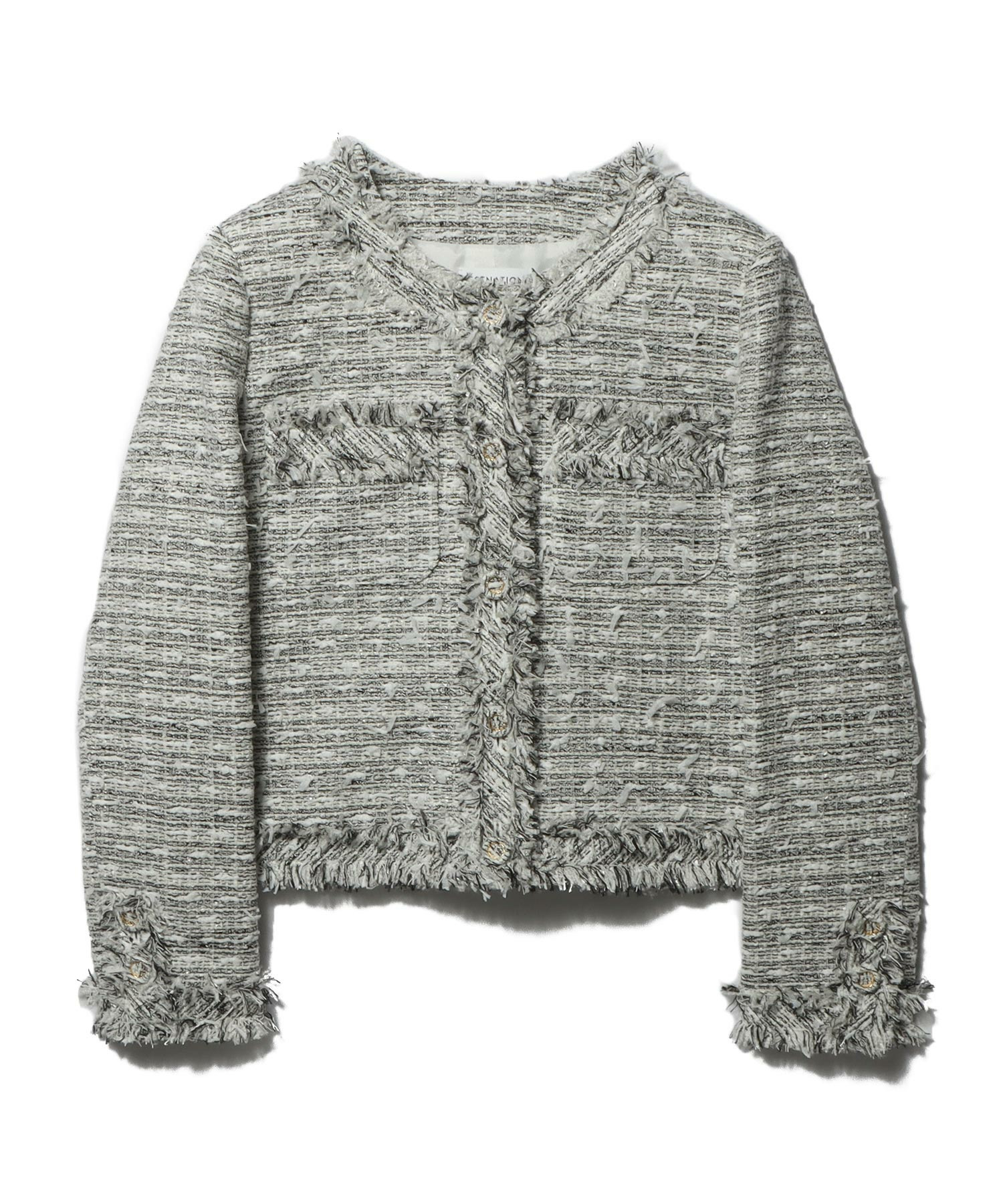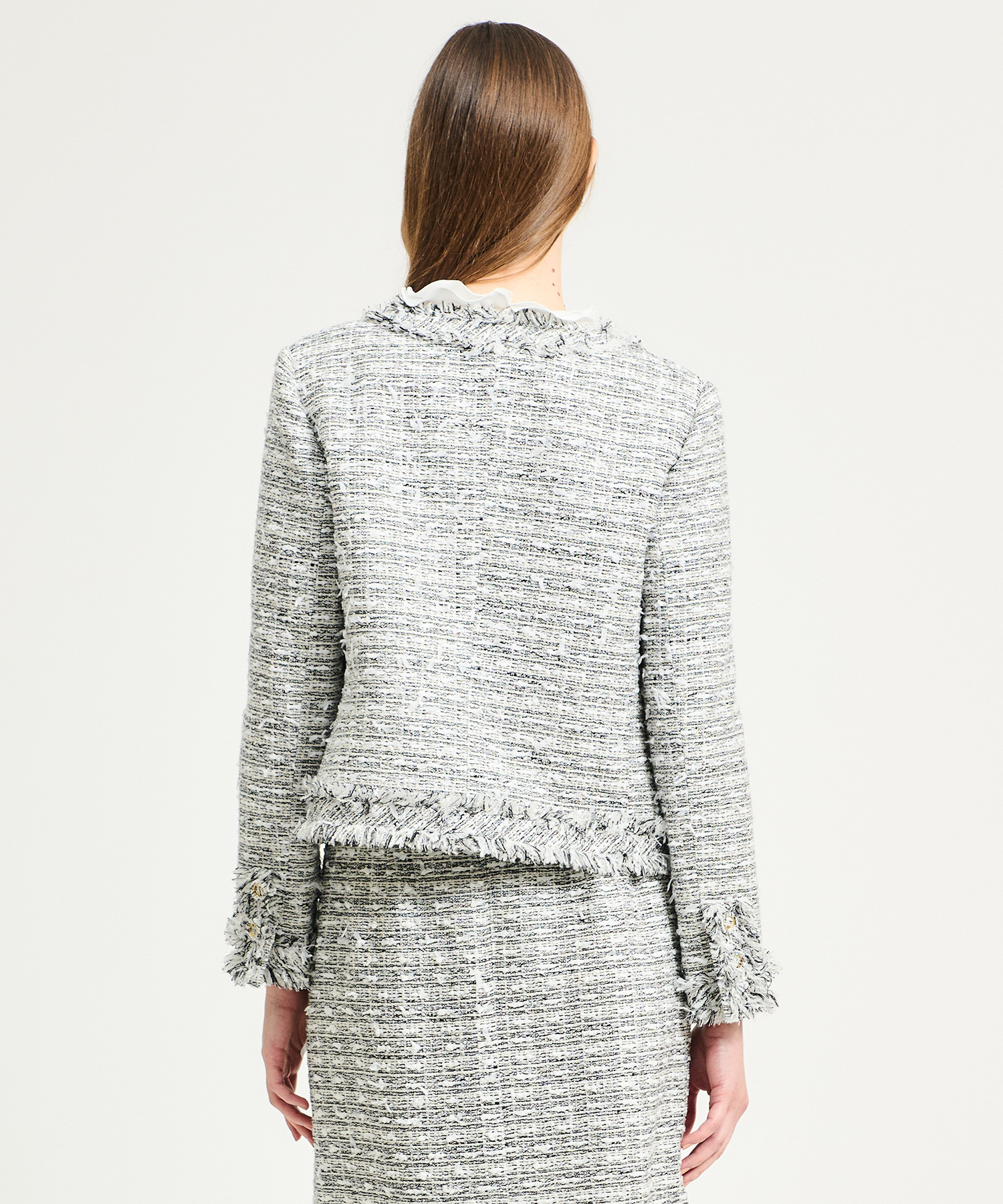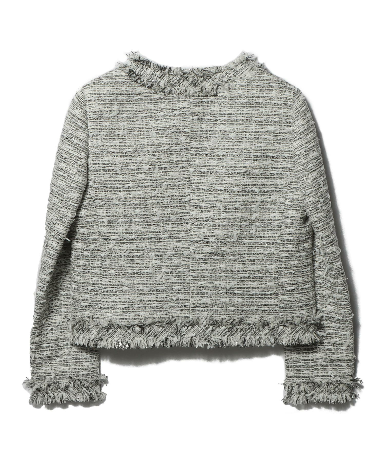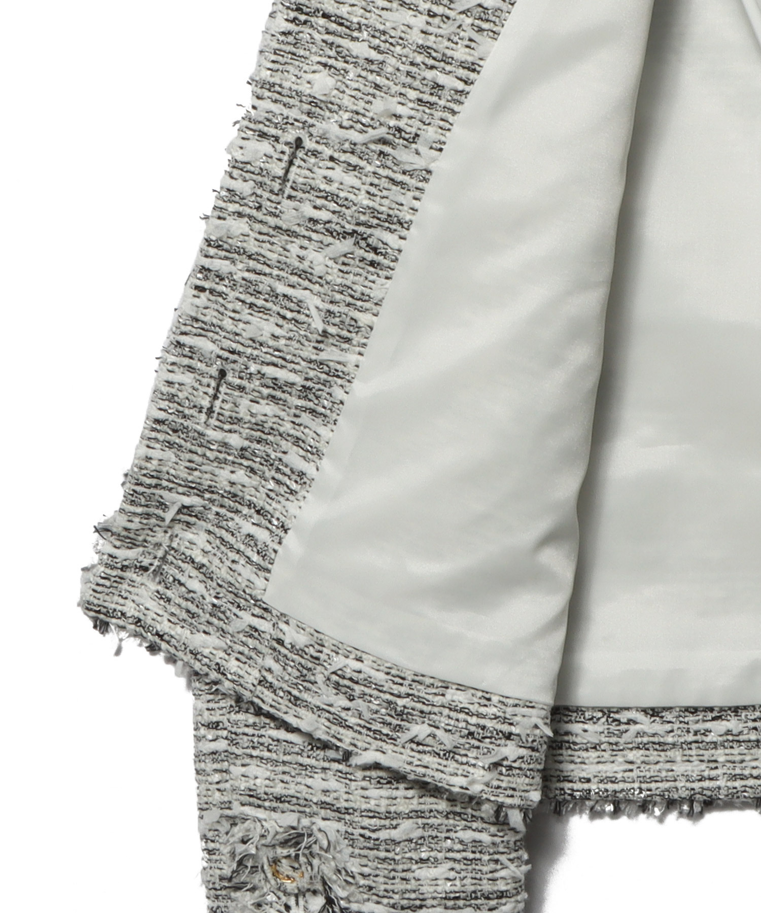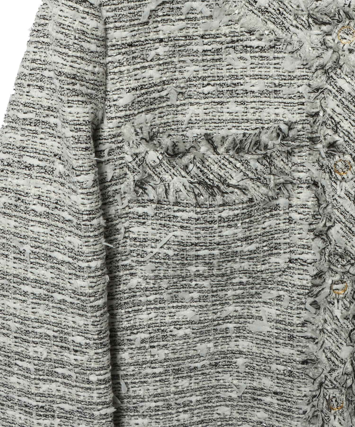 表情のあるファンシーツイード素材のノーカラージャケット。