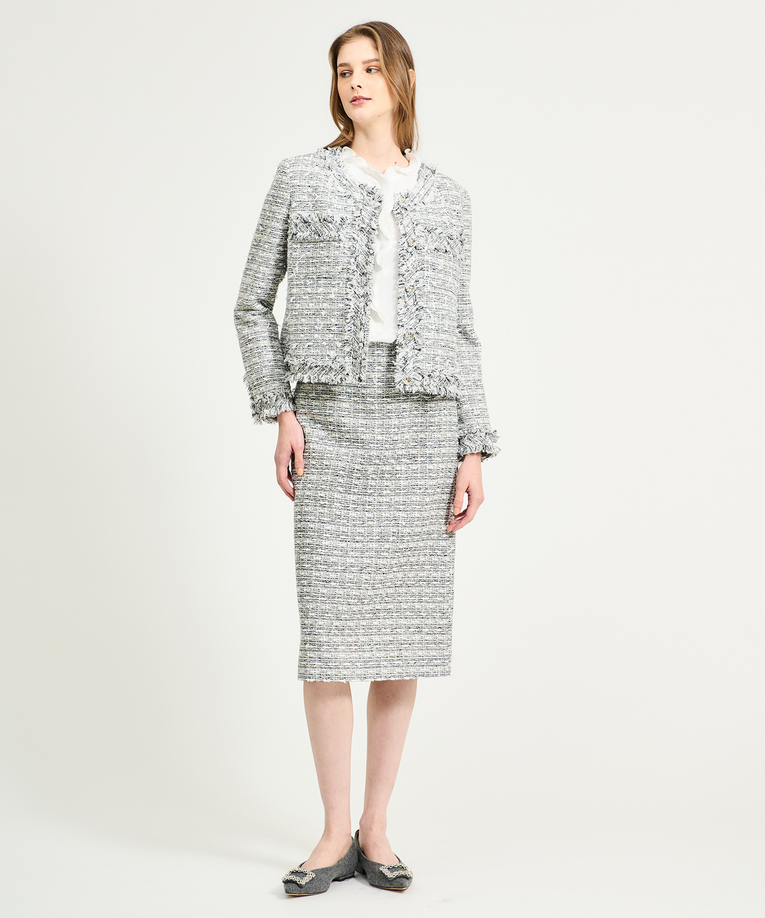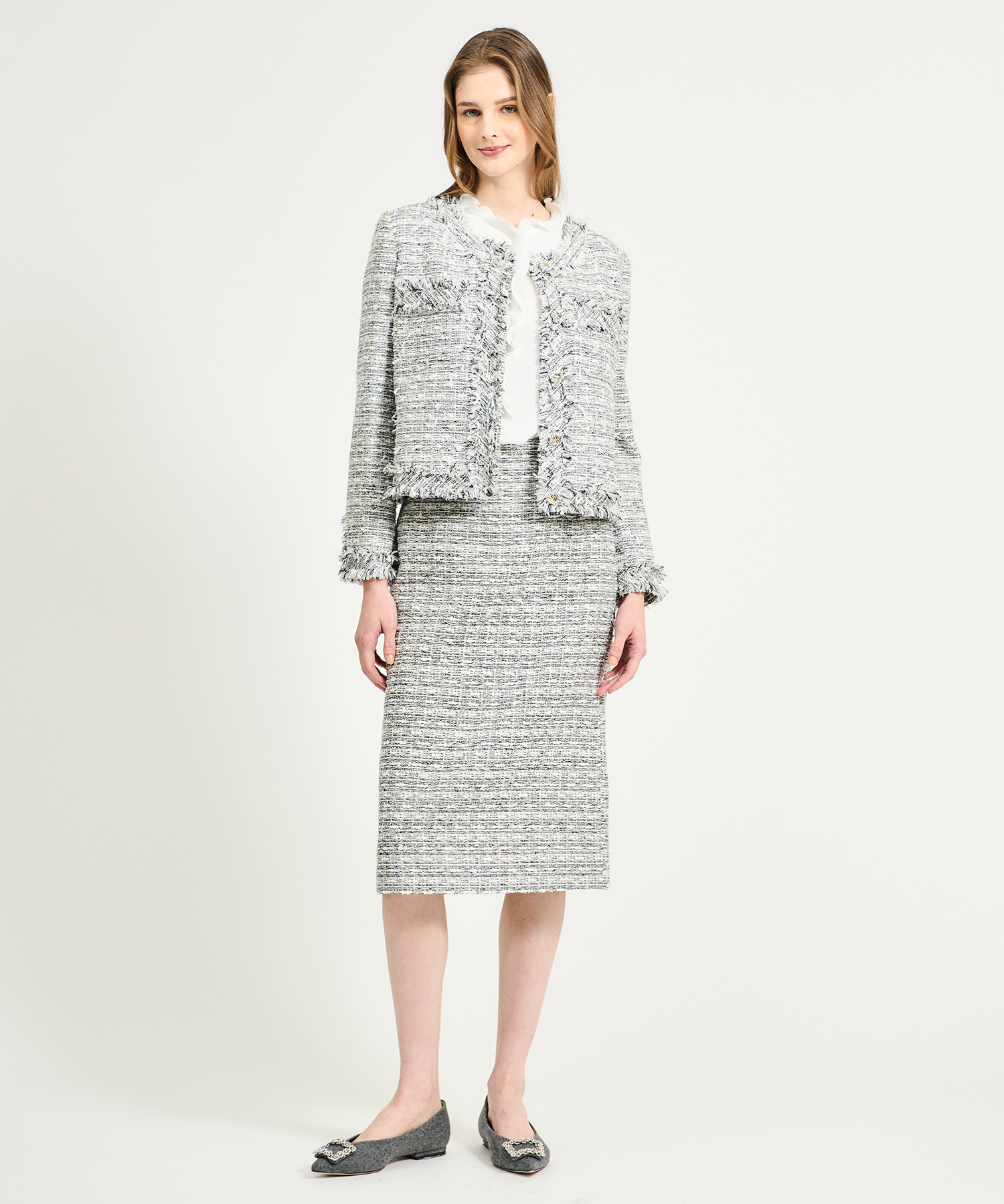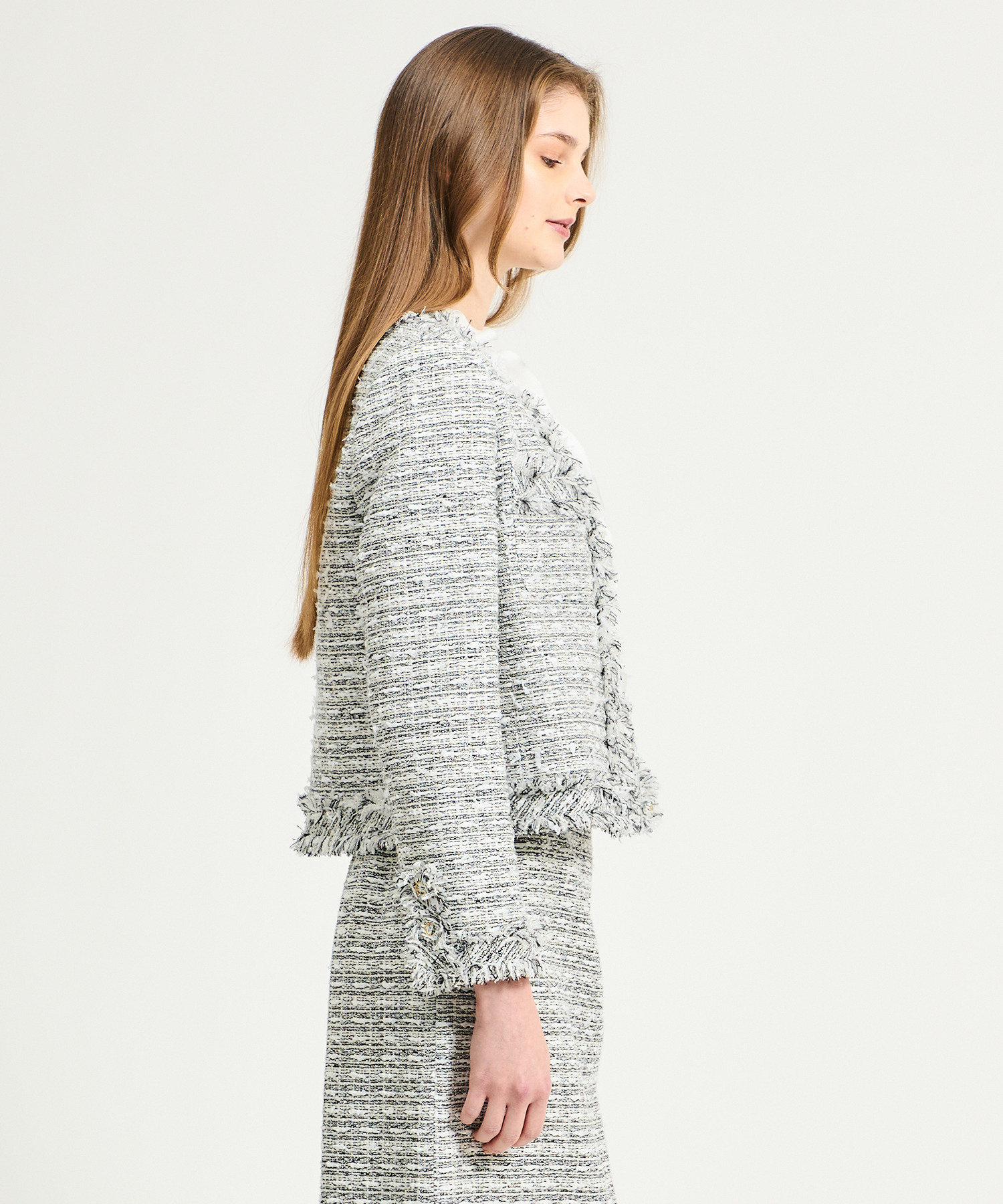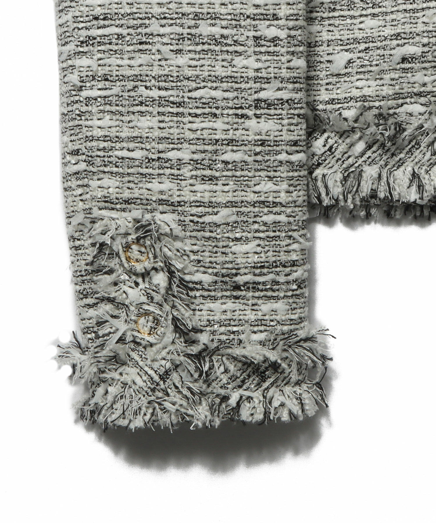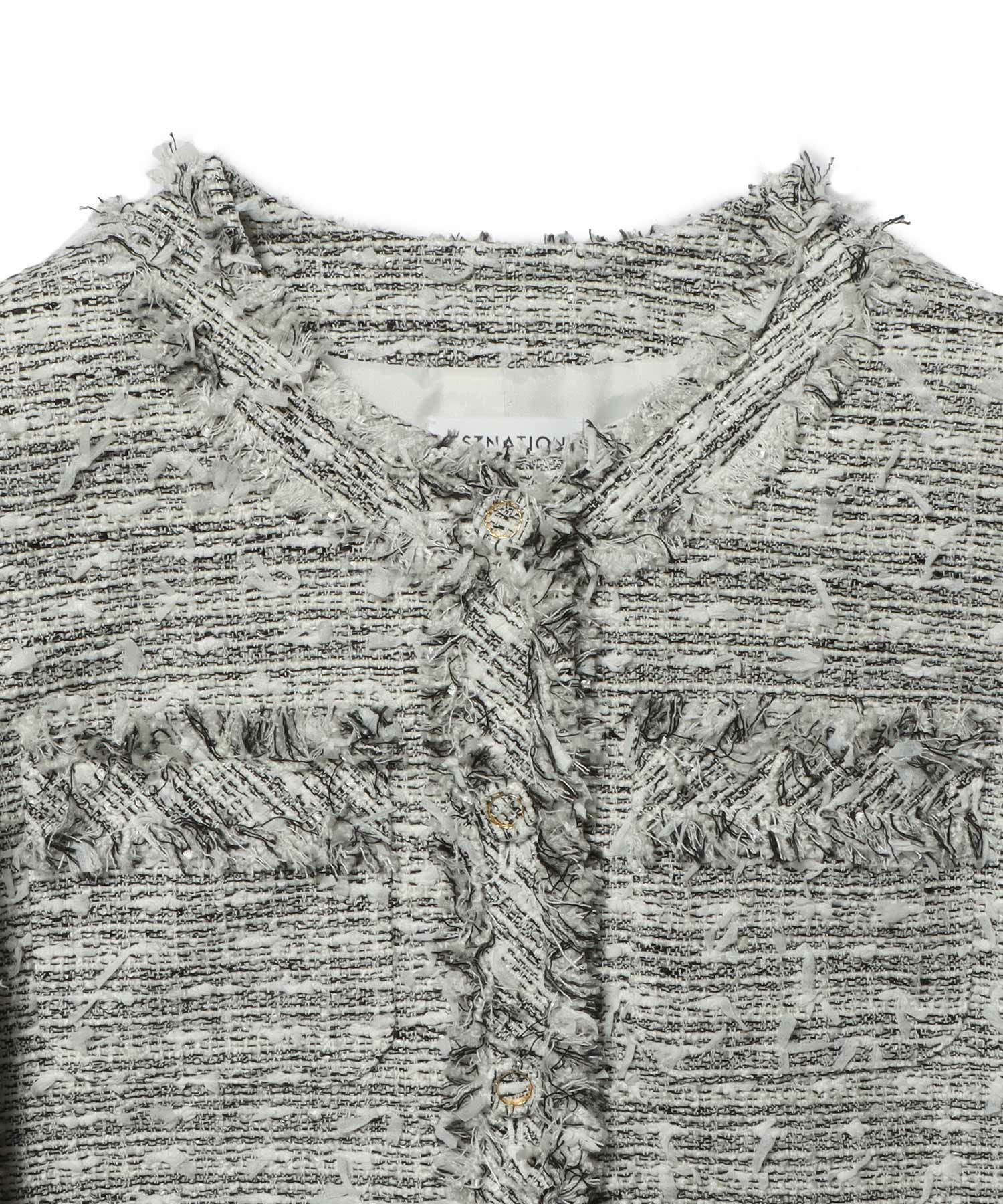 表情のあるファンシーツイード素材のノーカラージャケット。