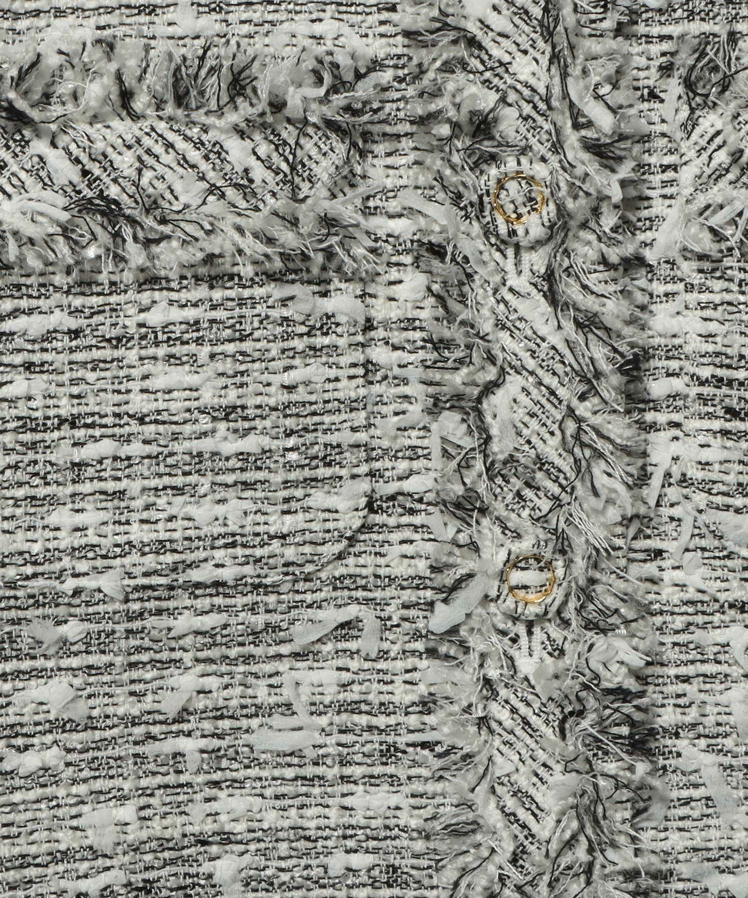 モノトーンミックスの多彩な糸使いで、素材感を活かしたデザインが特徴。襟周りと前立て、ポケットやカフスに共布のフリンジをあしらい、華やかな印象に仕上げました。