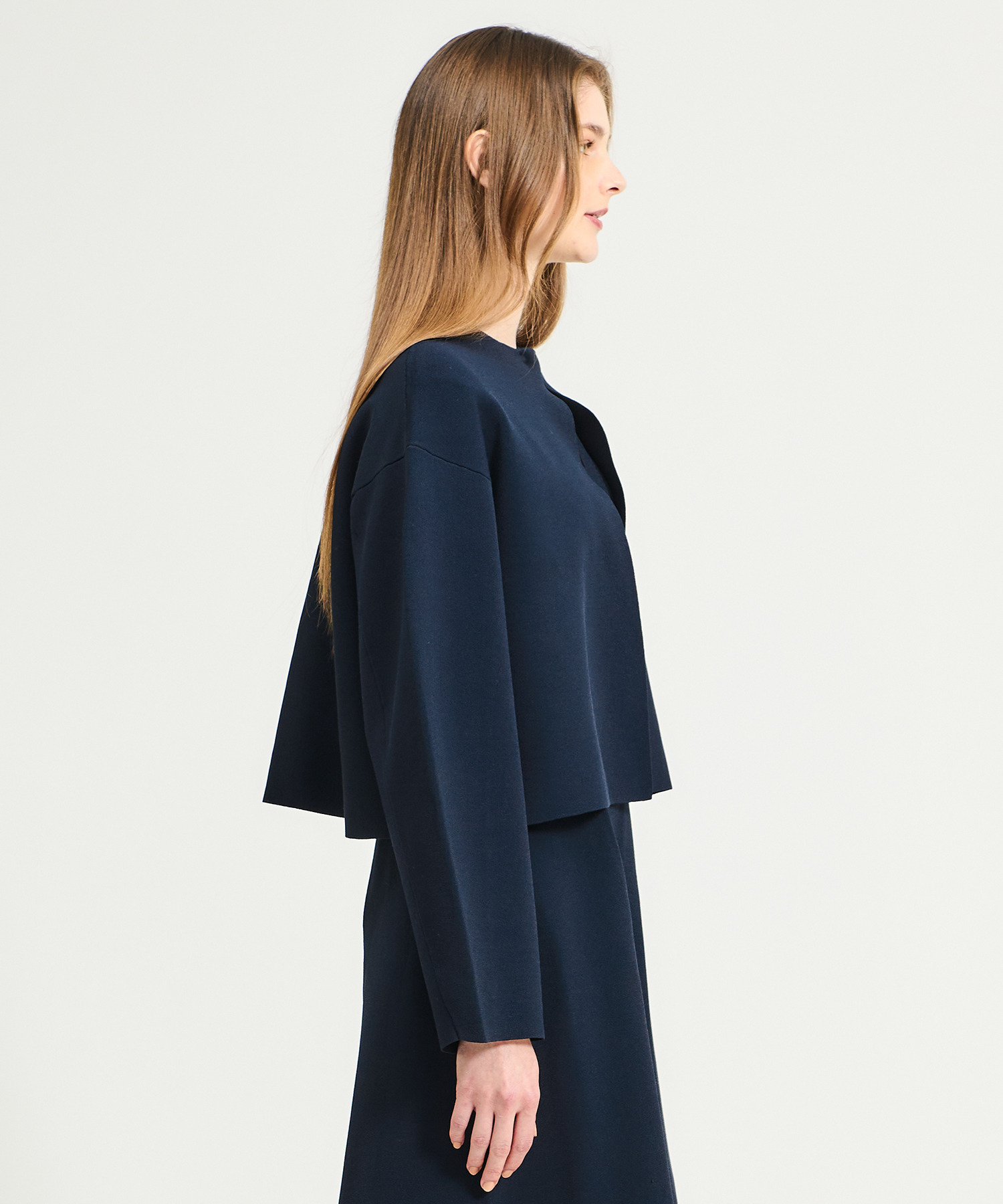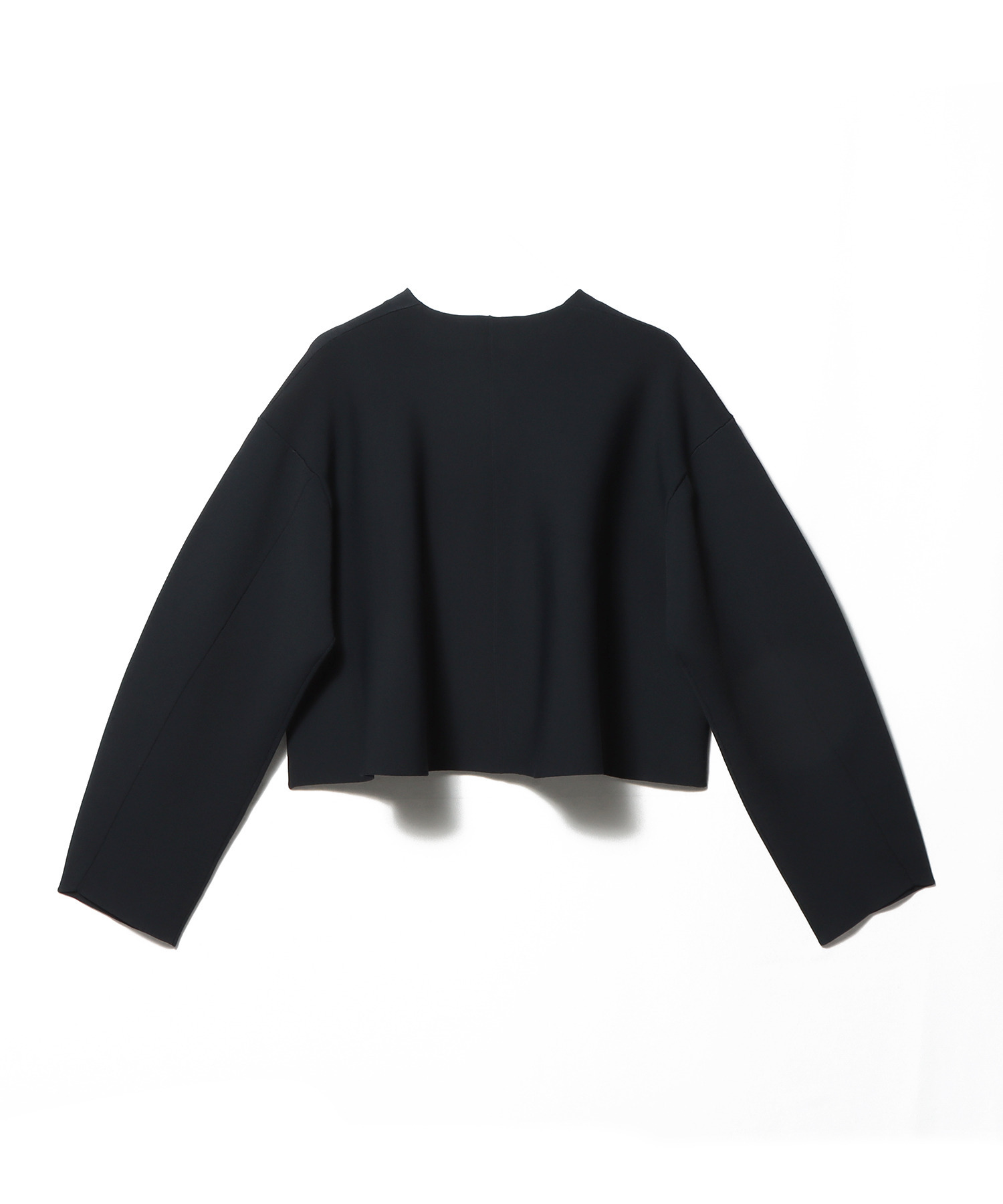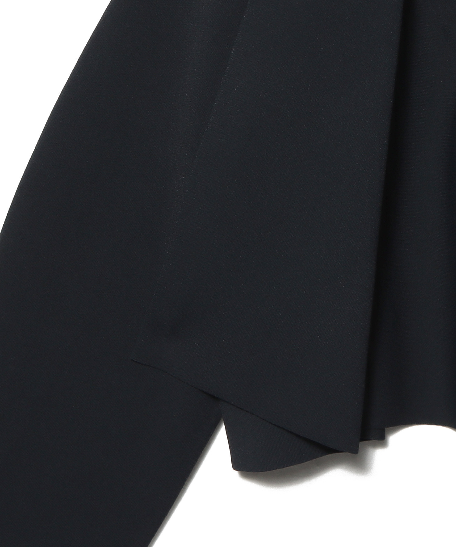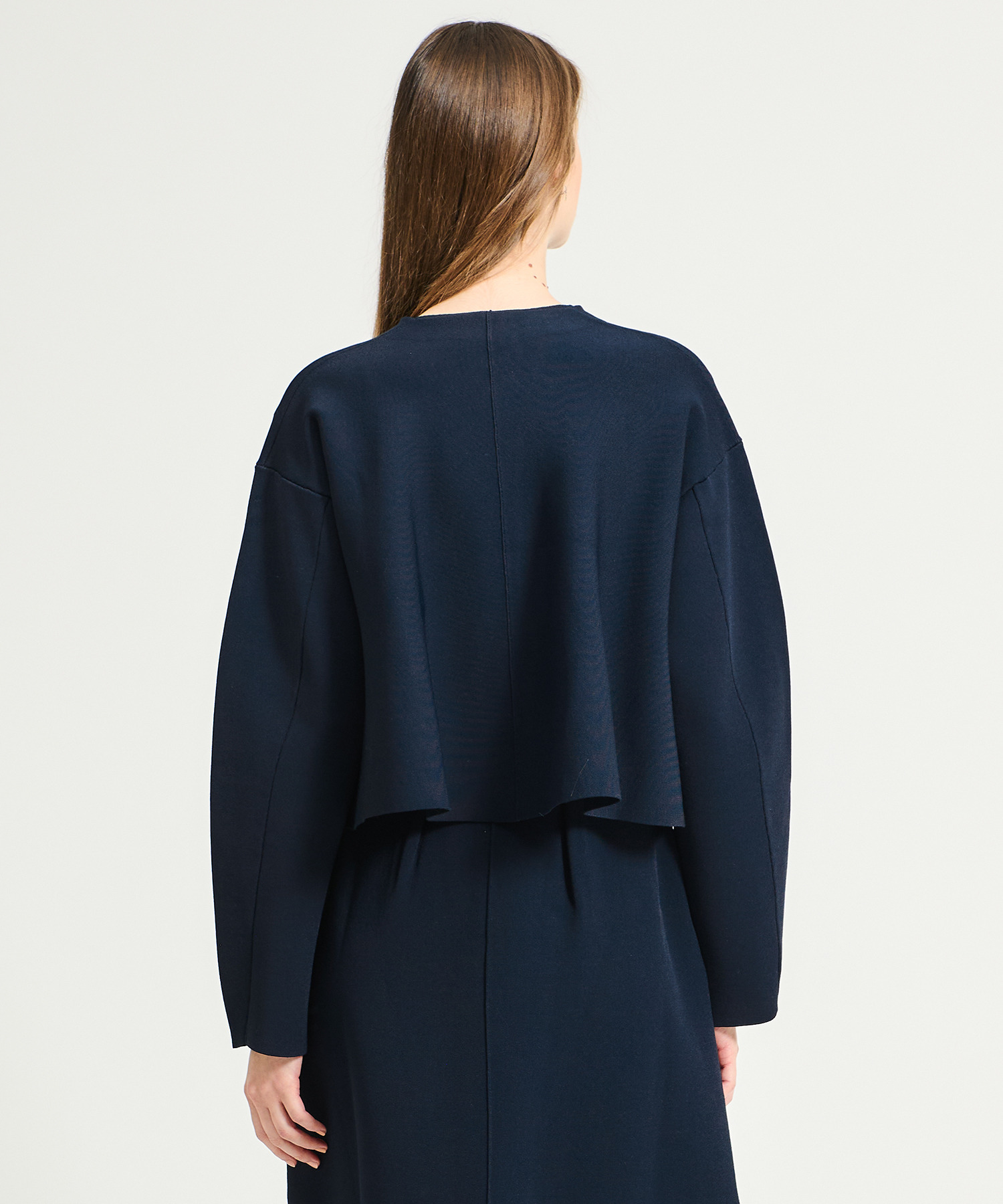 前はすっきりとシンプルに、後ろはフレアシルエットでボリュームを持たせ、立体的でモードな印象に仕上げています。袖のカーヴィーなラインもポイント。