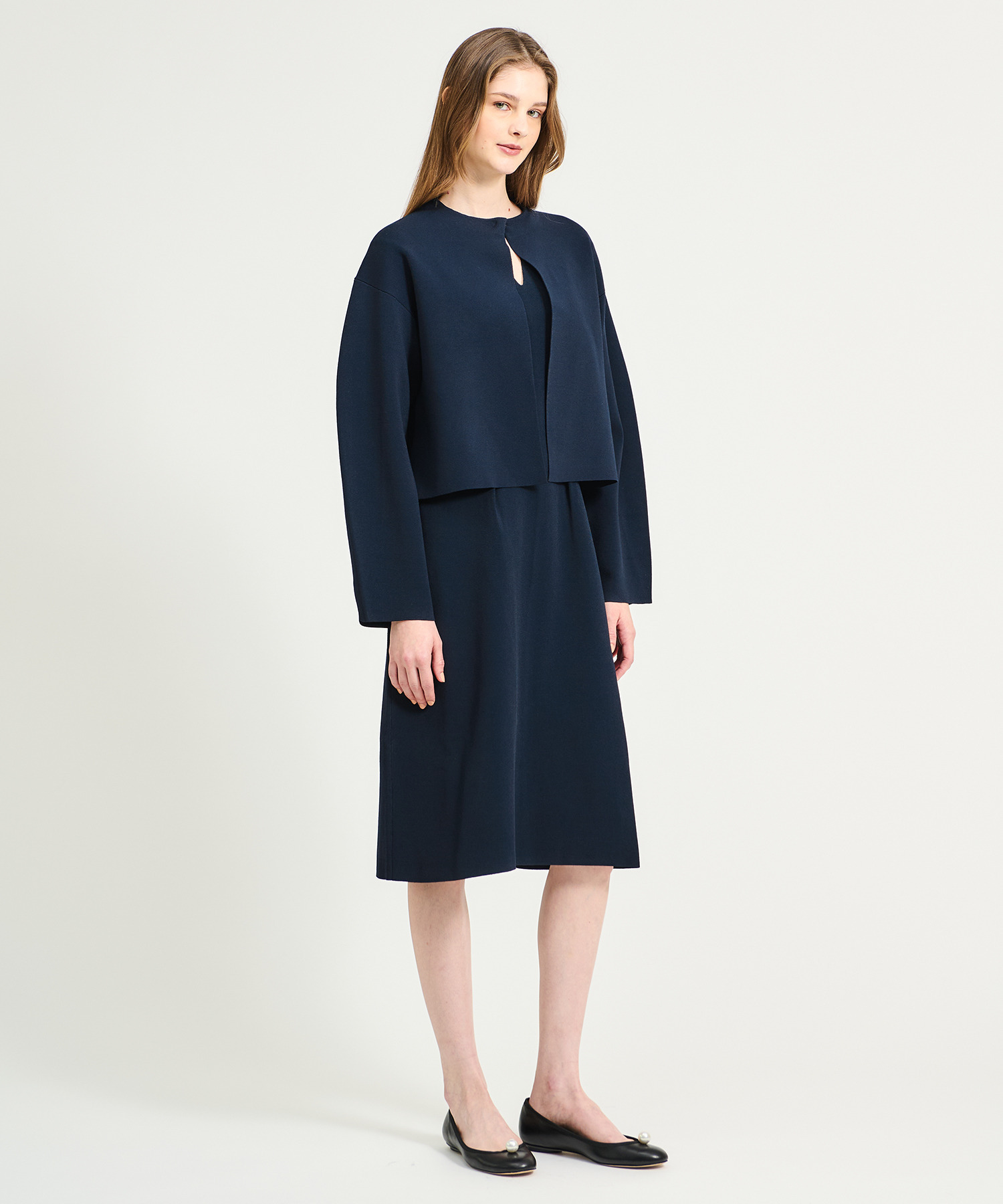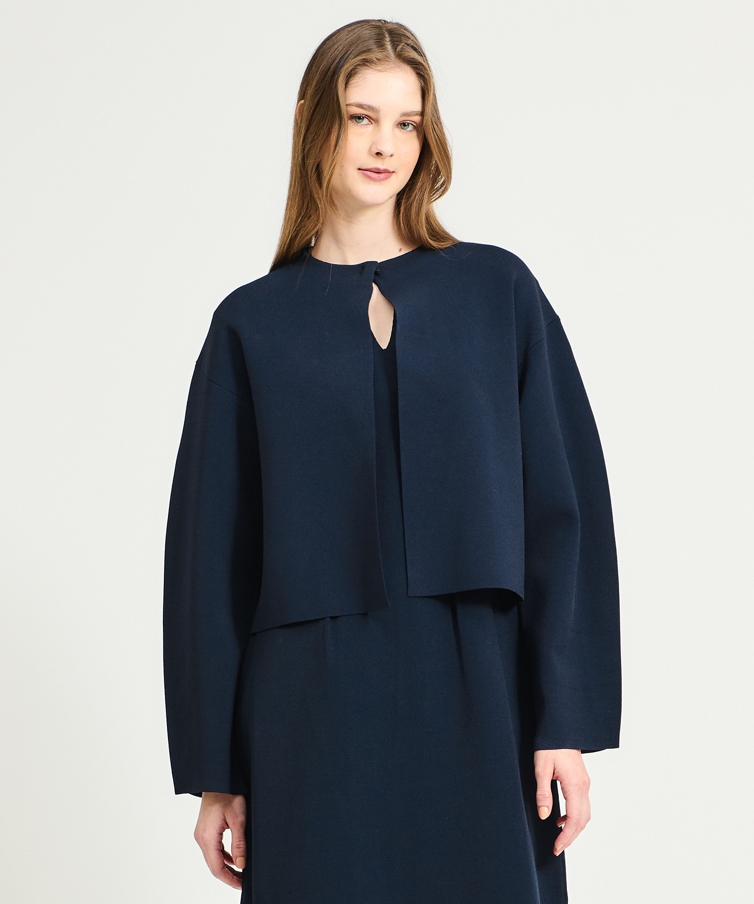 羽織りとしてはもちろん、同シリーズのニットワンピースとのアンサンブルスタイルもおすすめです。