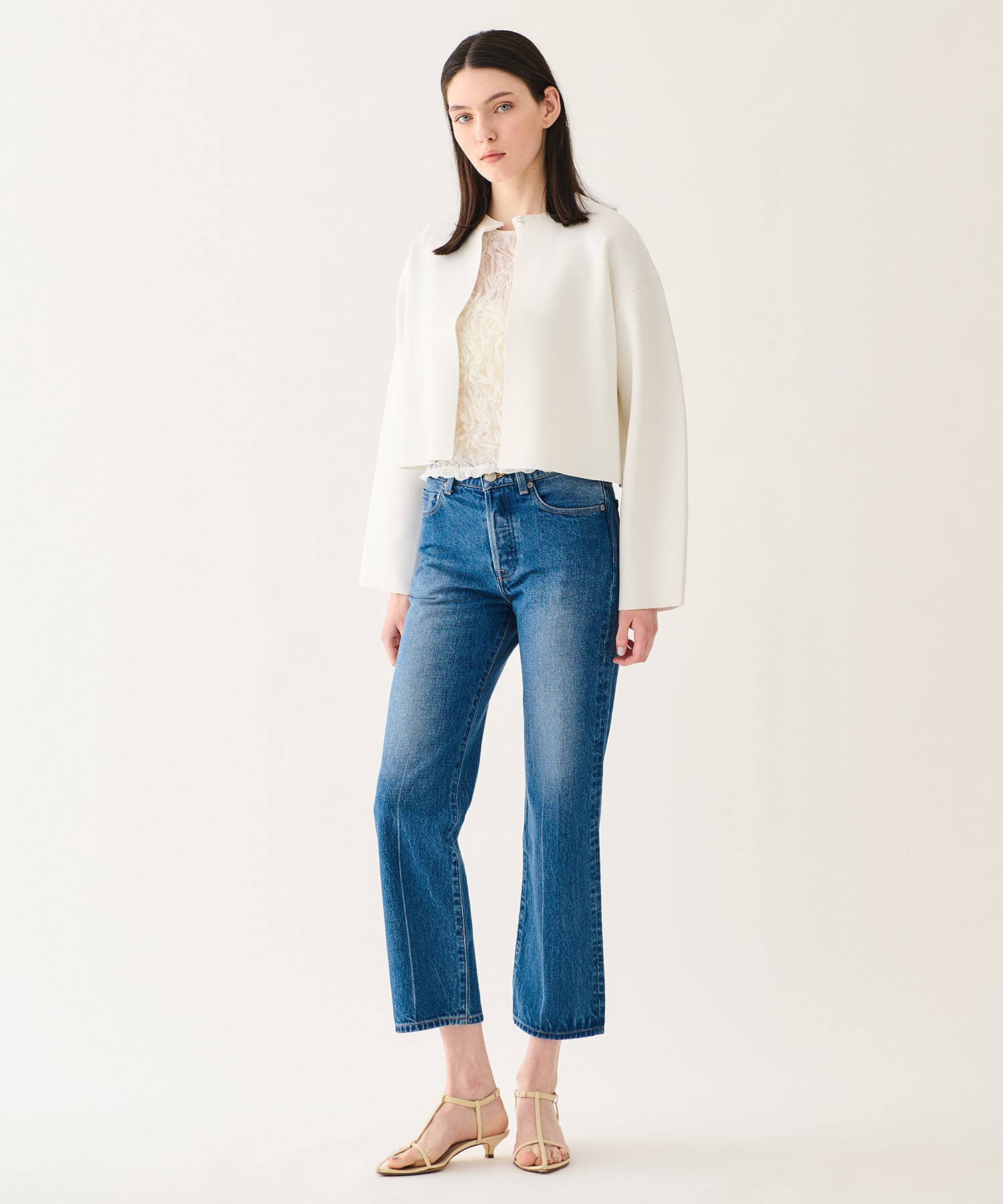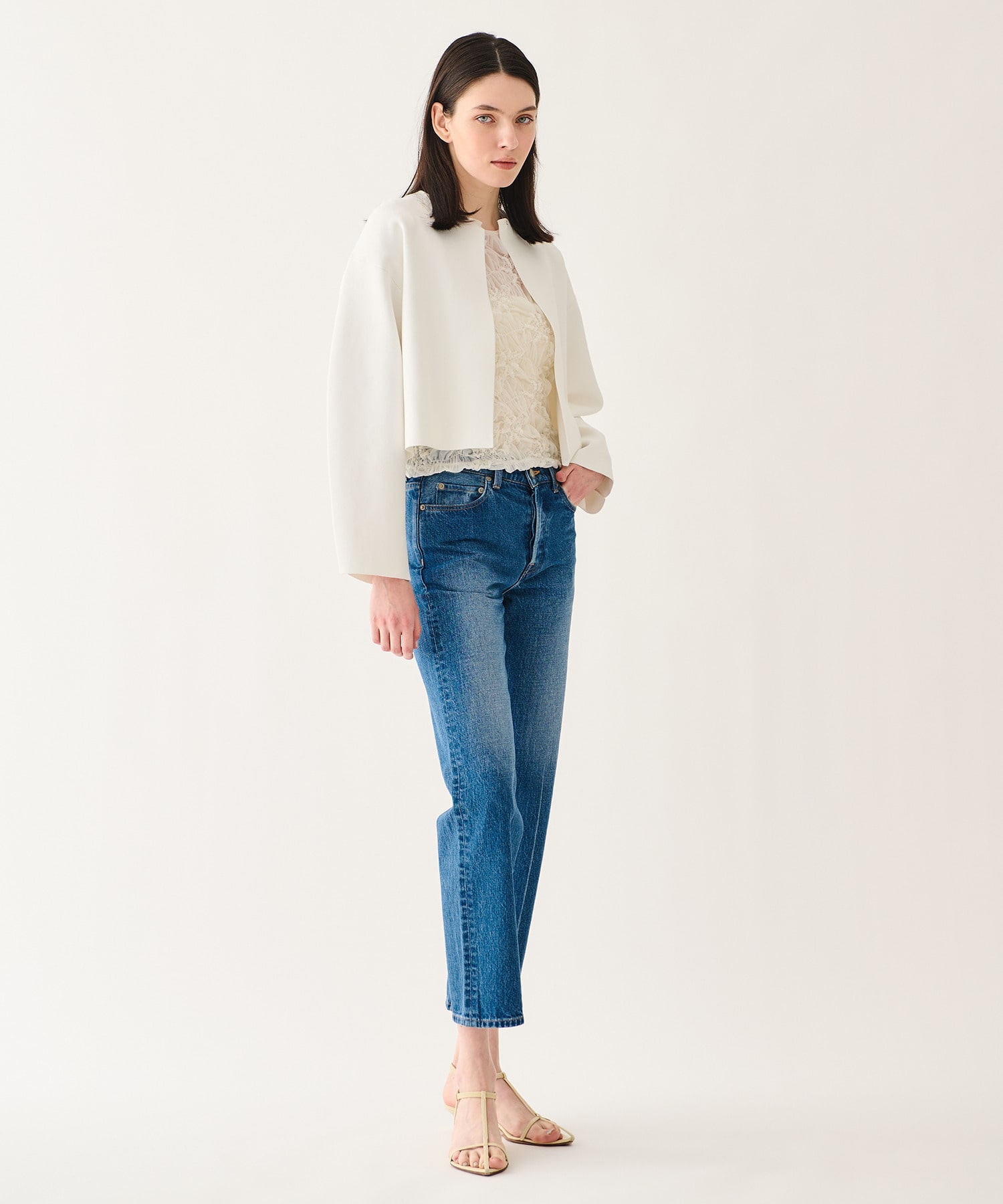 前はすっきりとシンプルに、後ろはフレアシルエットでボリュームを持たせ、立体的でモードな印象に仕上げています。袖のカーヴィーなラインもポイント。