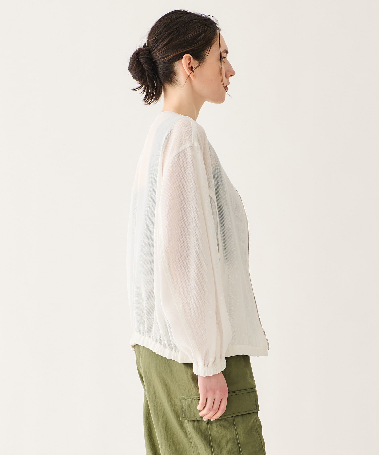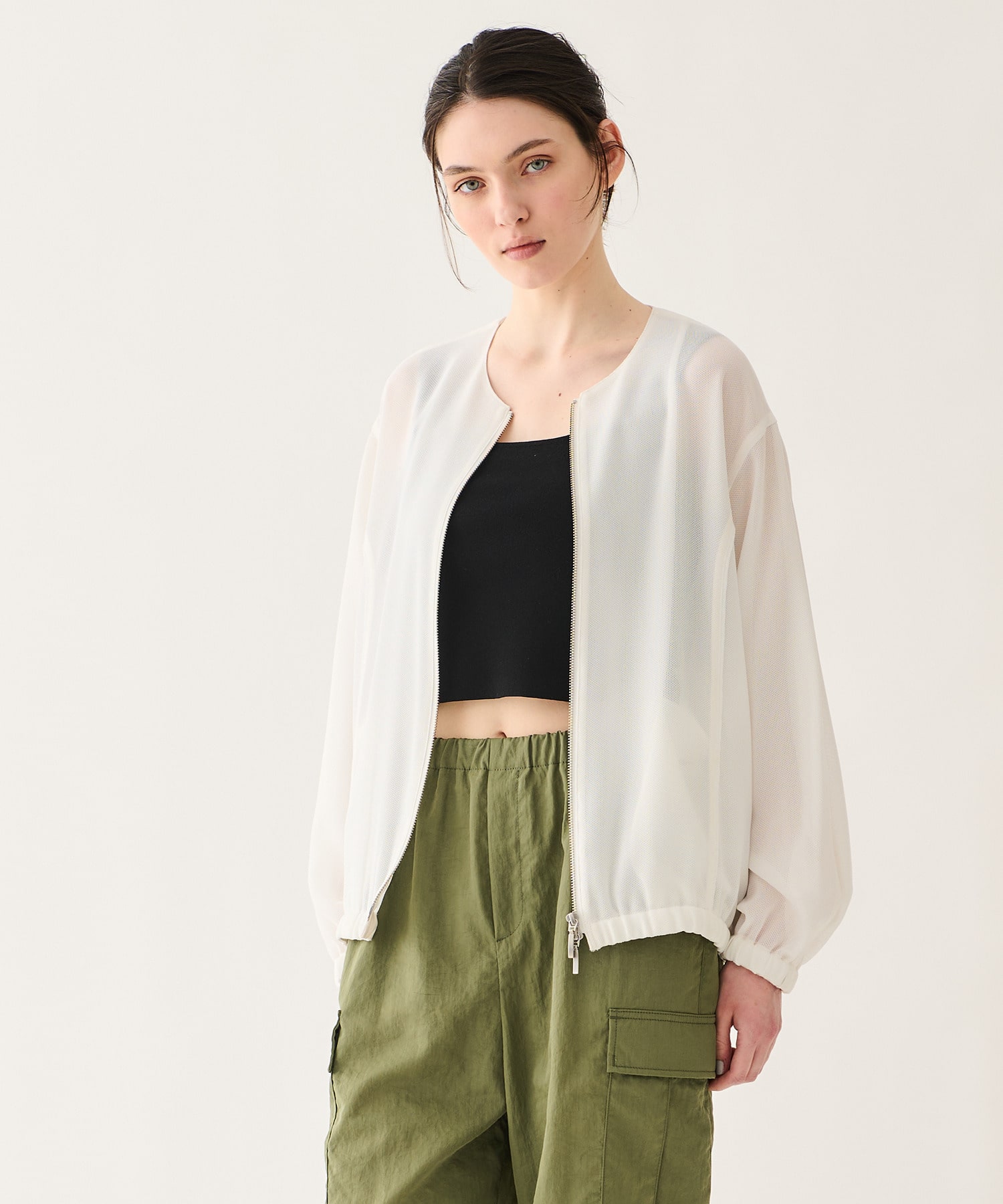 シアーブルゾンとして軽やかに羽織れる、トレンド感のあるジップアップアウター。