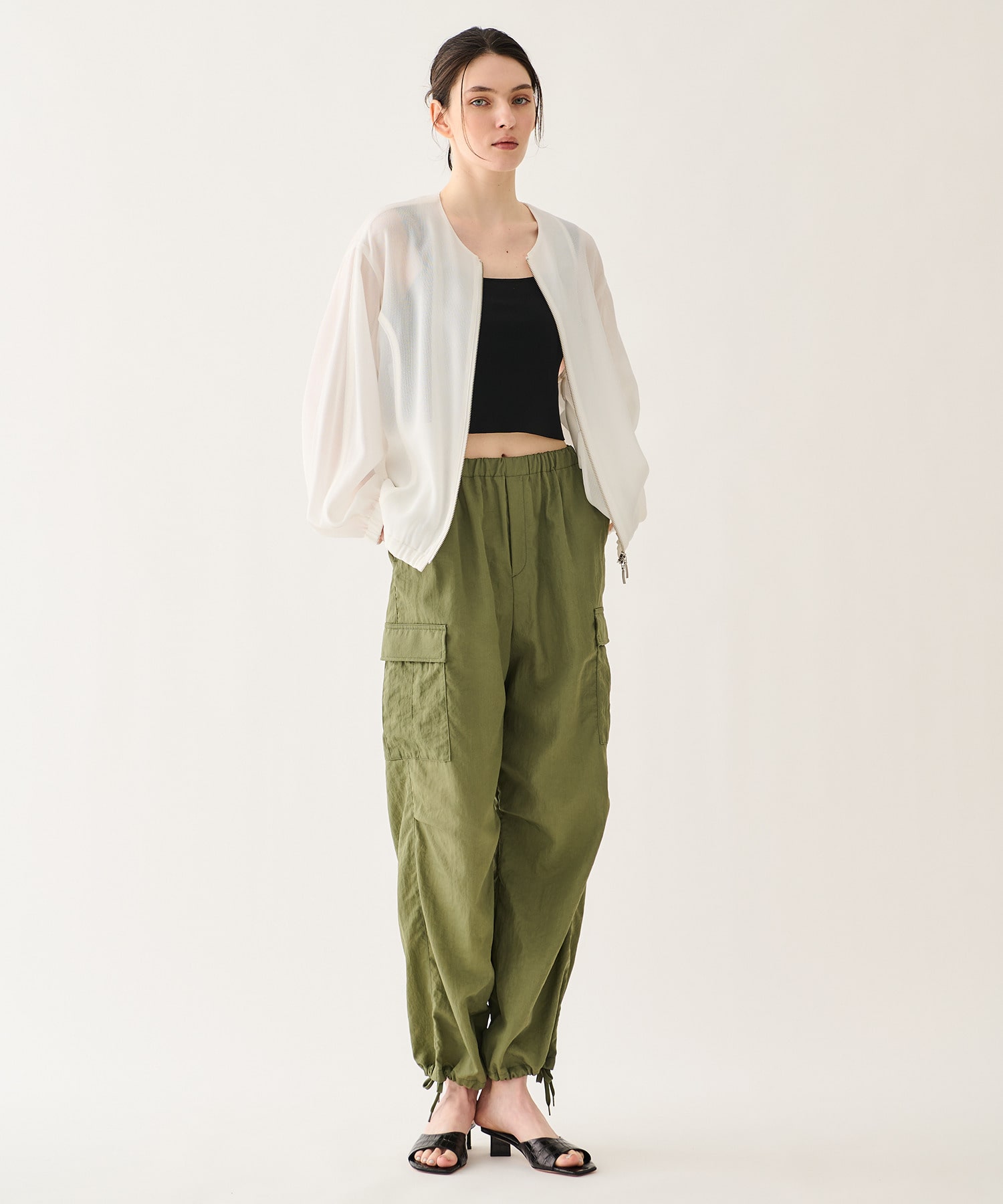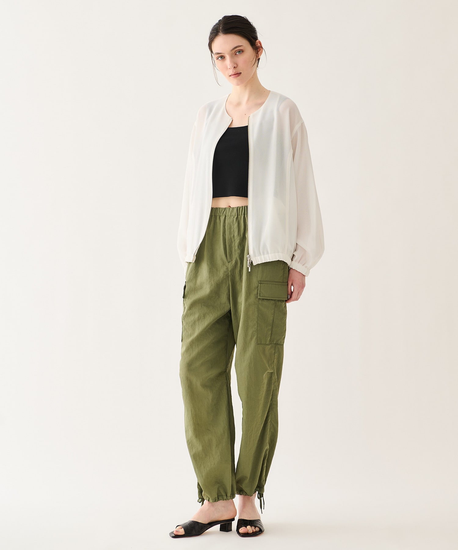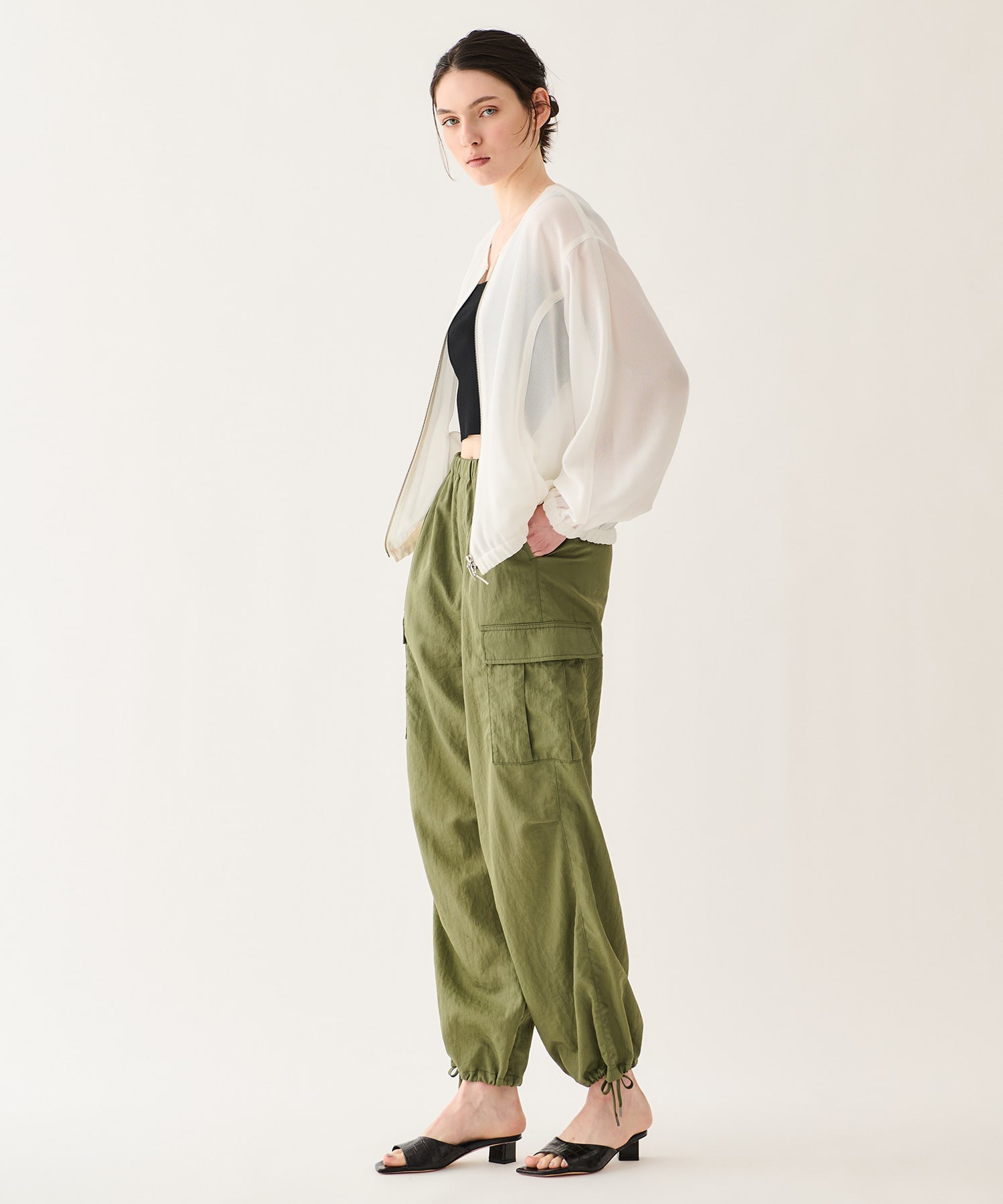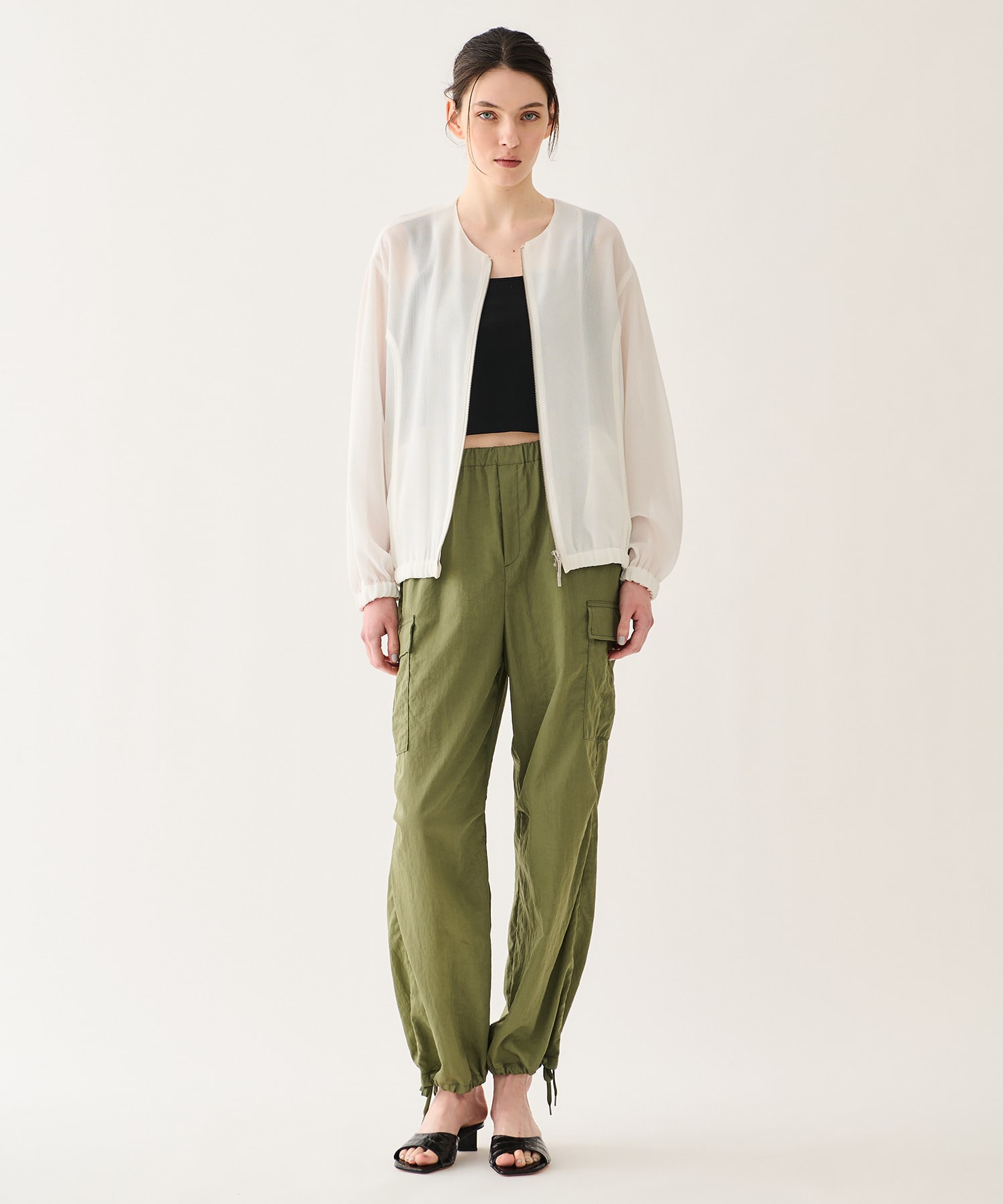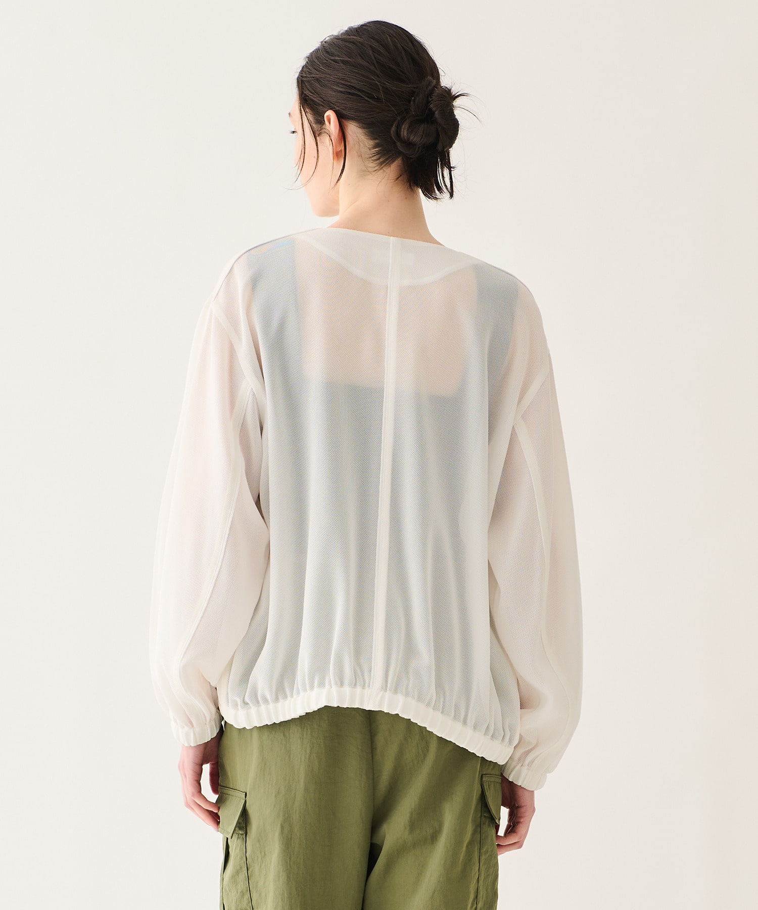 ポリエステルとレーヨンをブレンドしたカラミ素材を使用。ややしなやかなタッチと程よい落ち感が特徴で、軽やかさと上品さを兼ね備えています。透けすぎない絶妙なシアー感で、スタイリングに取り入れやすい素材感に仕上げました。