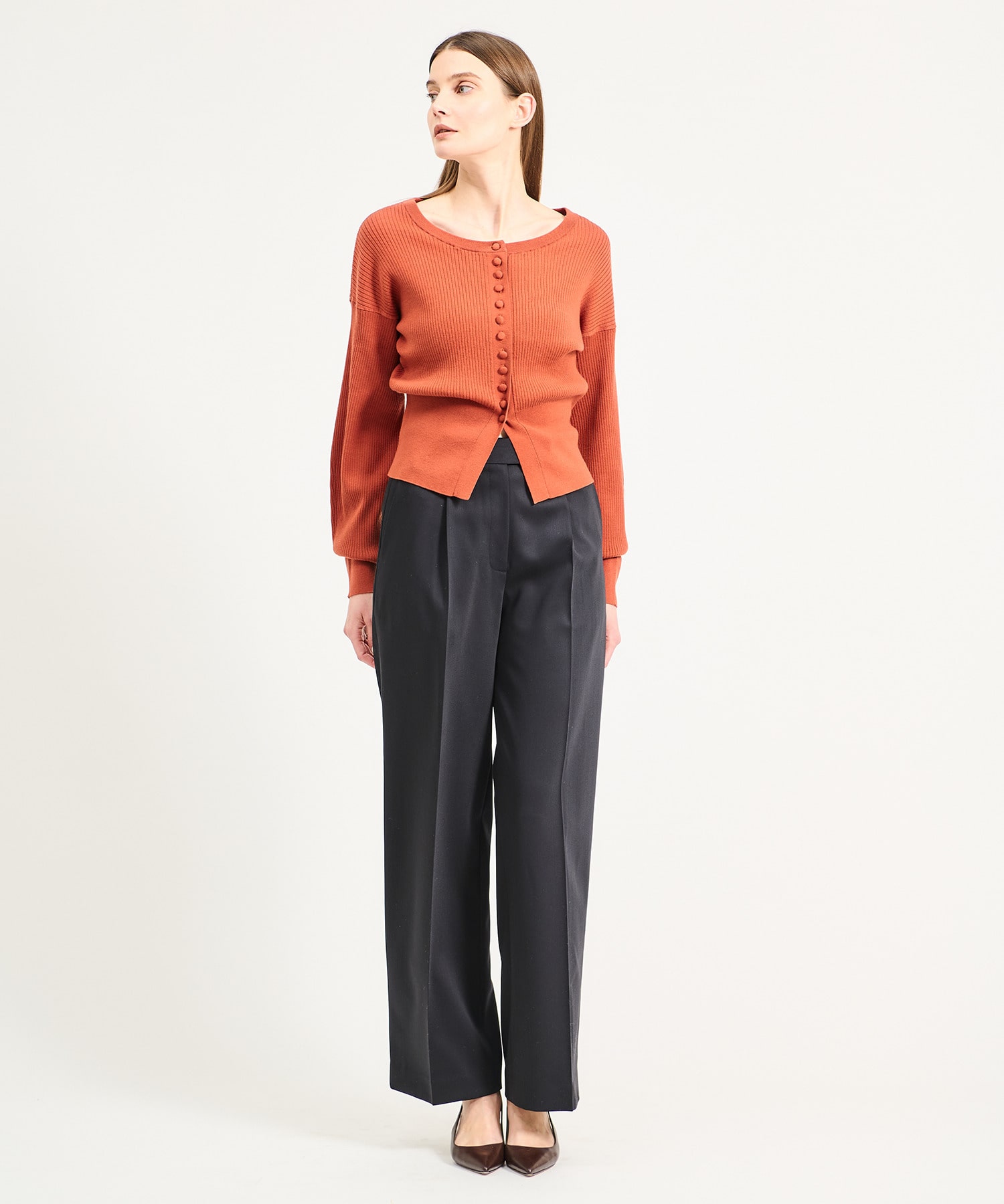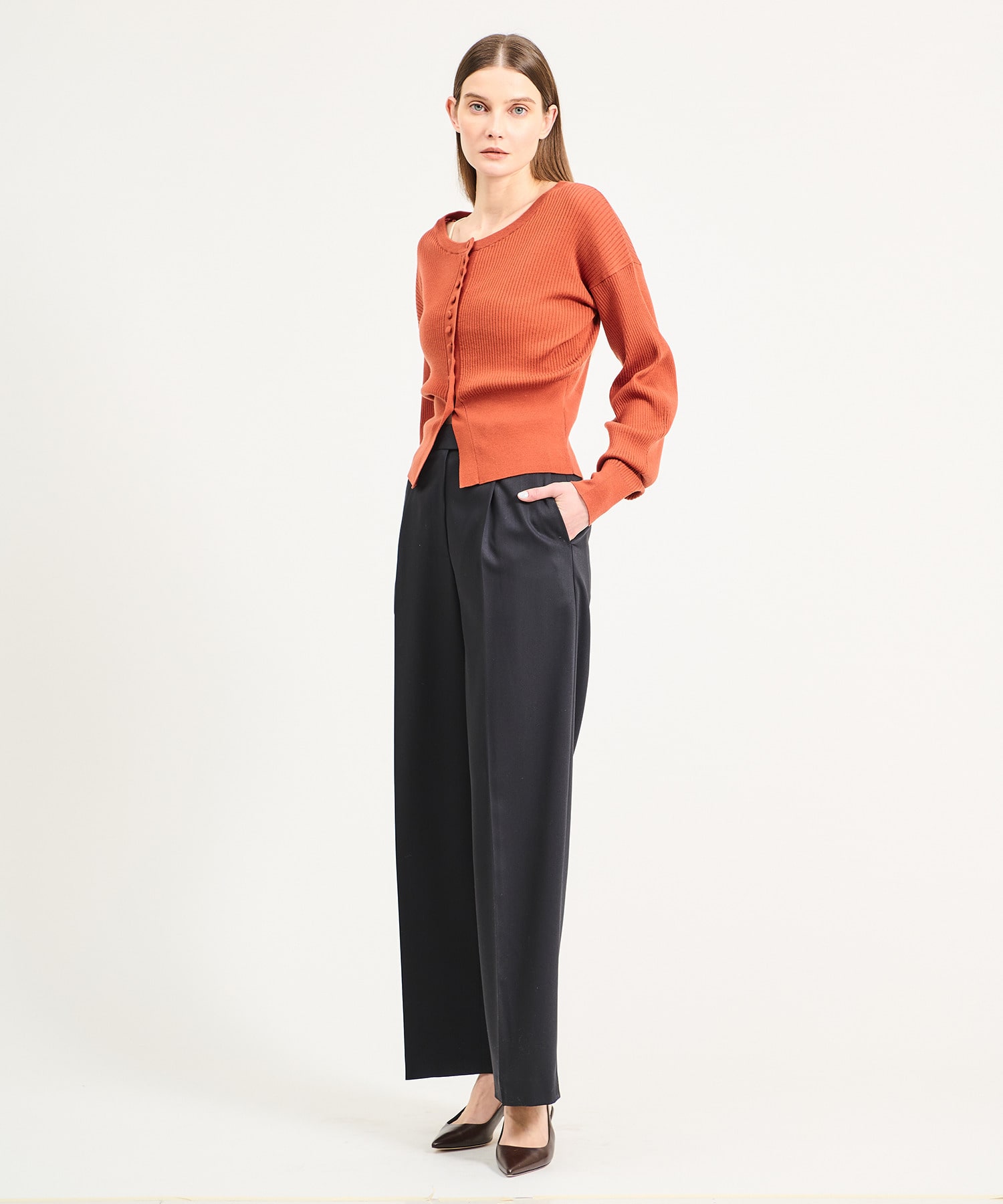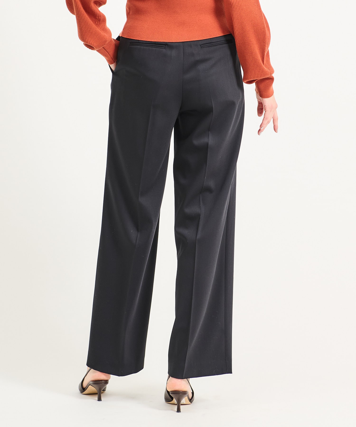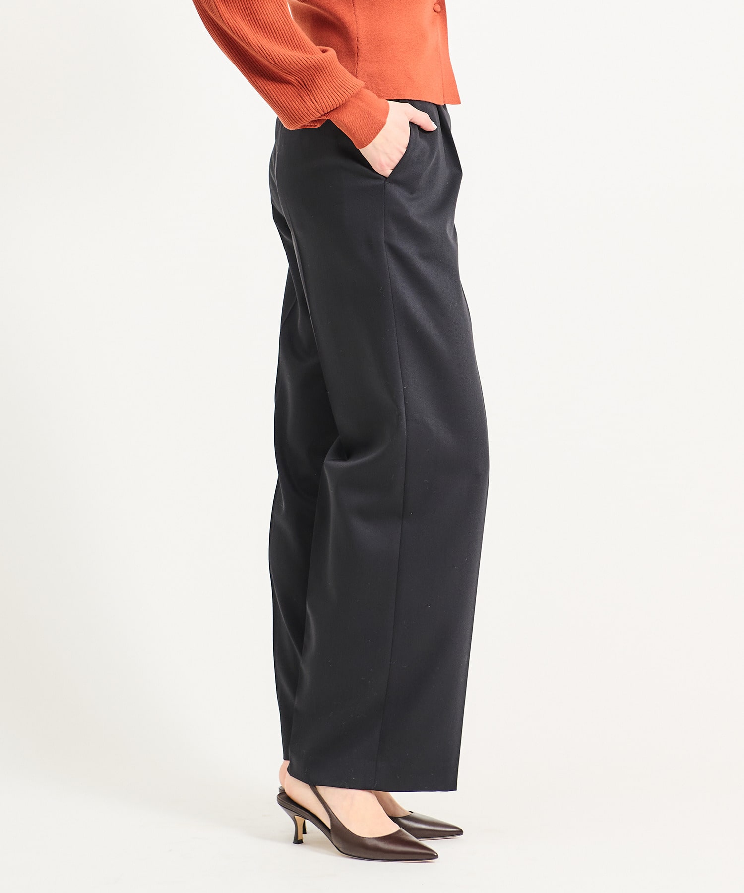 ジャケットとのセットアップスタイルはもちろん、ニットやブラウスなど幅広いトップスとも好相性。