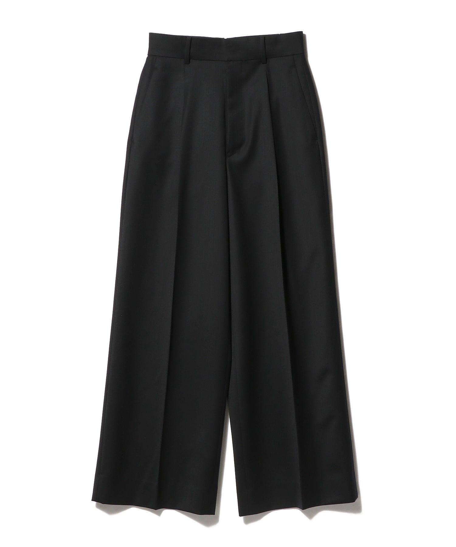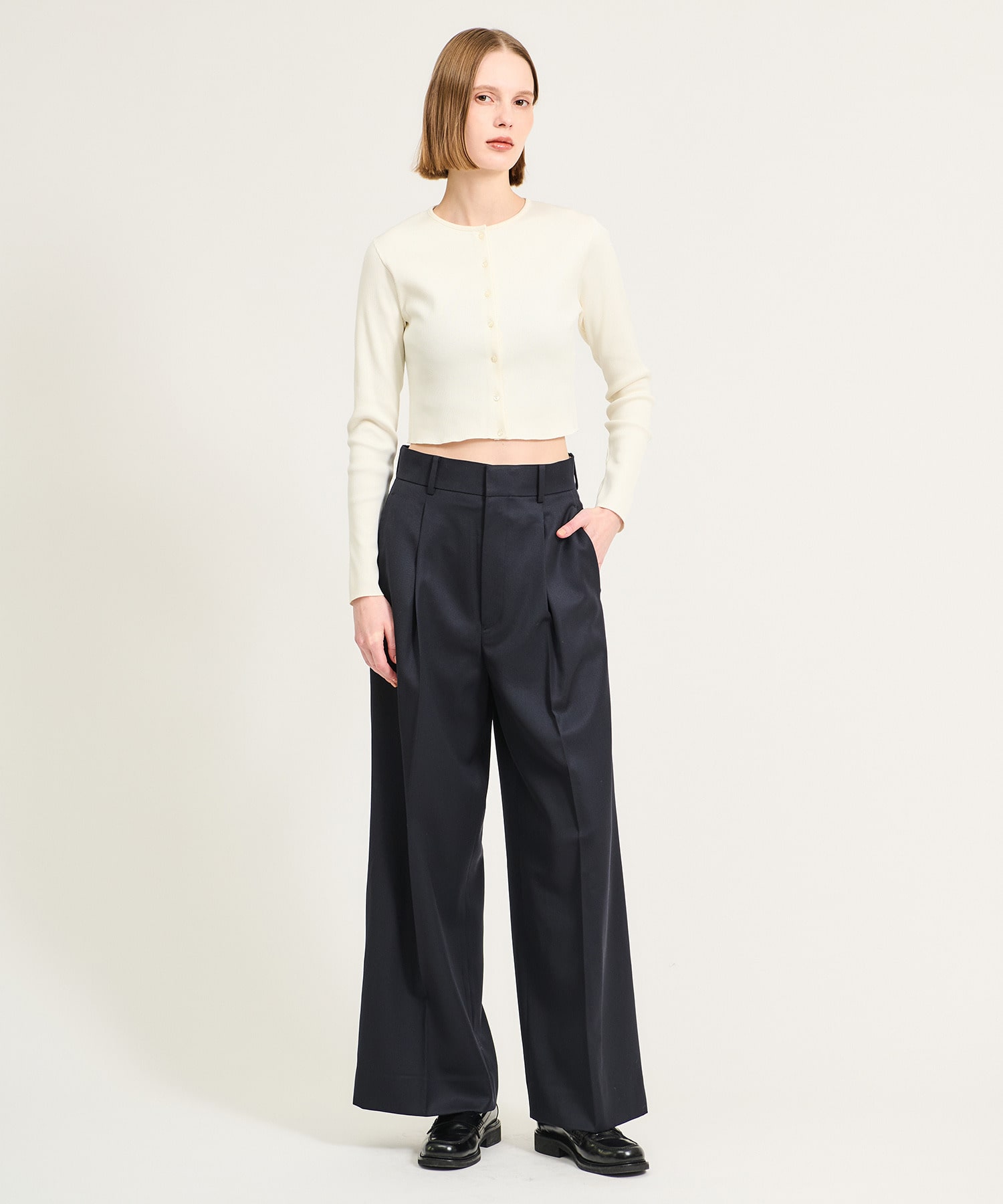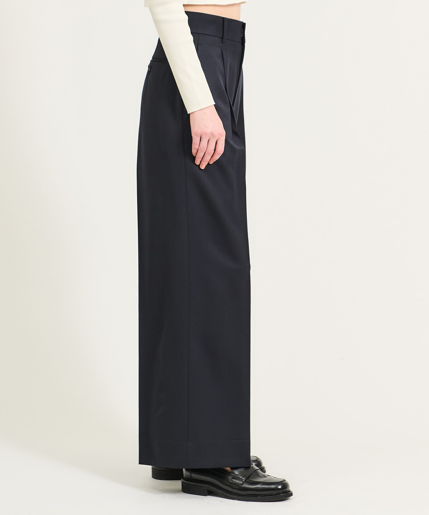 高めのウエスト位置で足長効果も期待できるタックワイドパンツ。