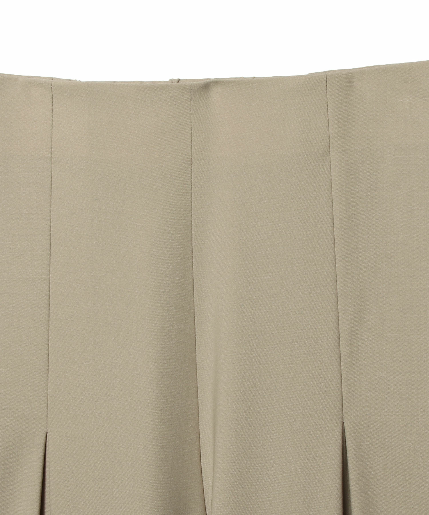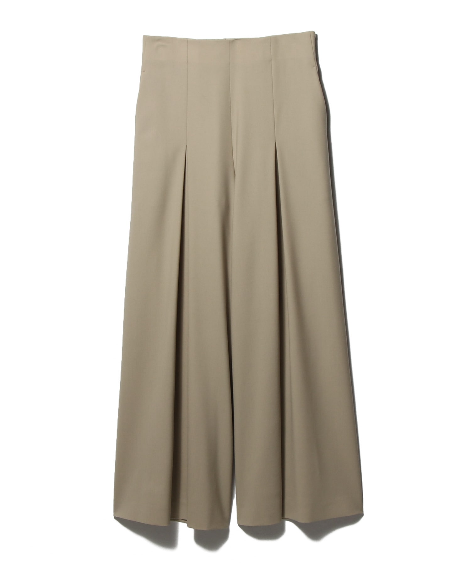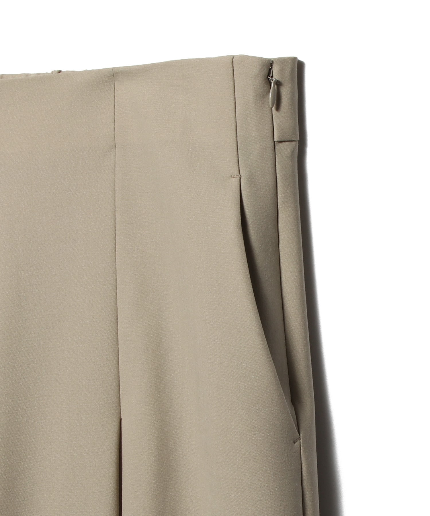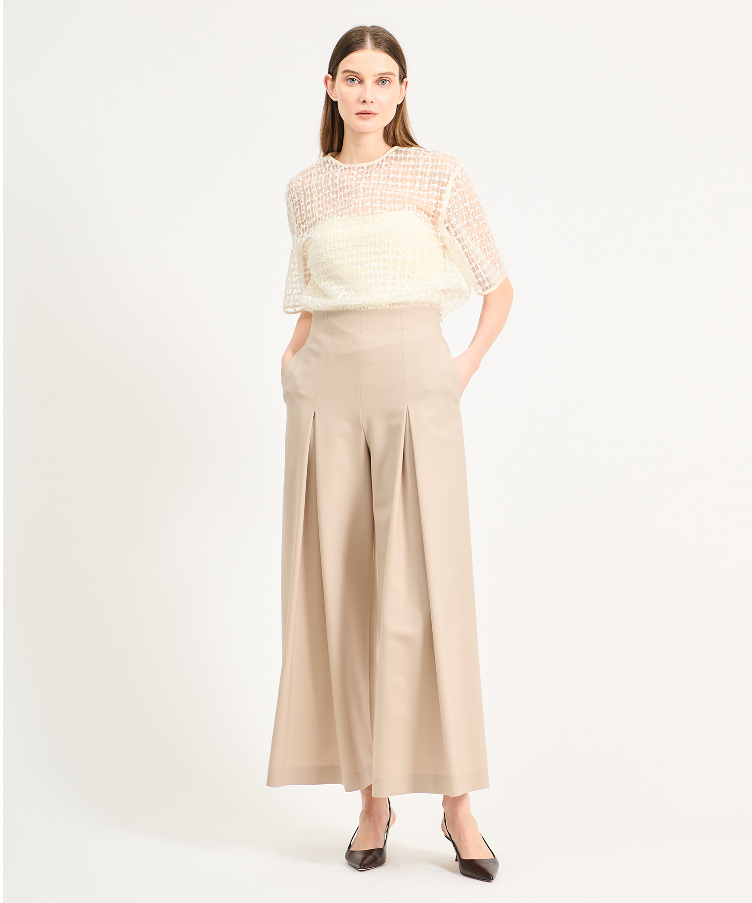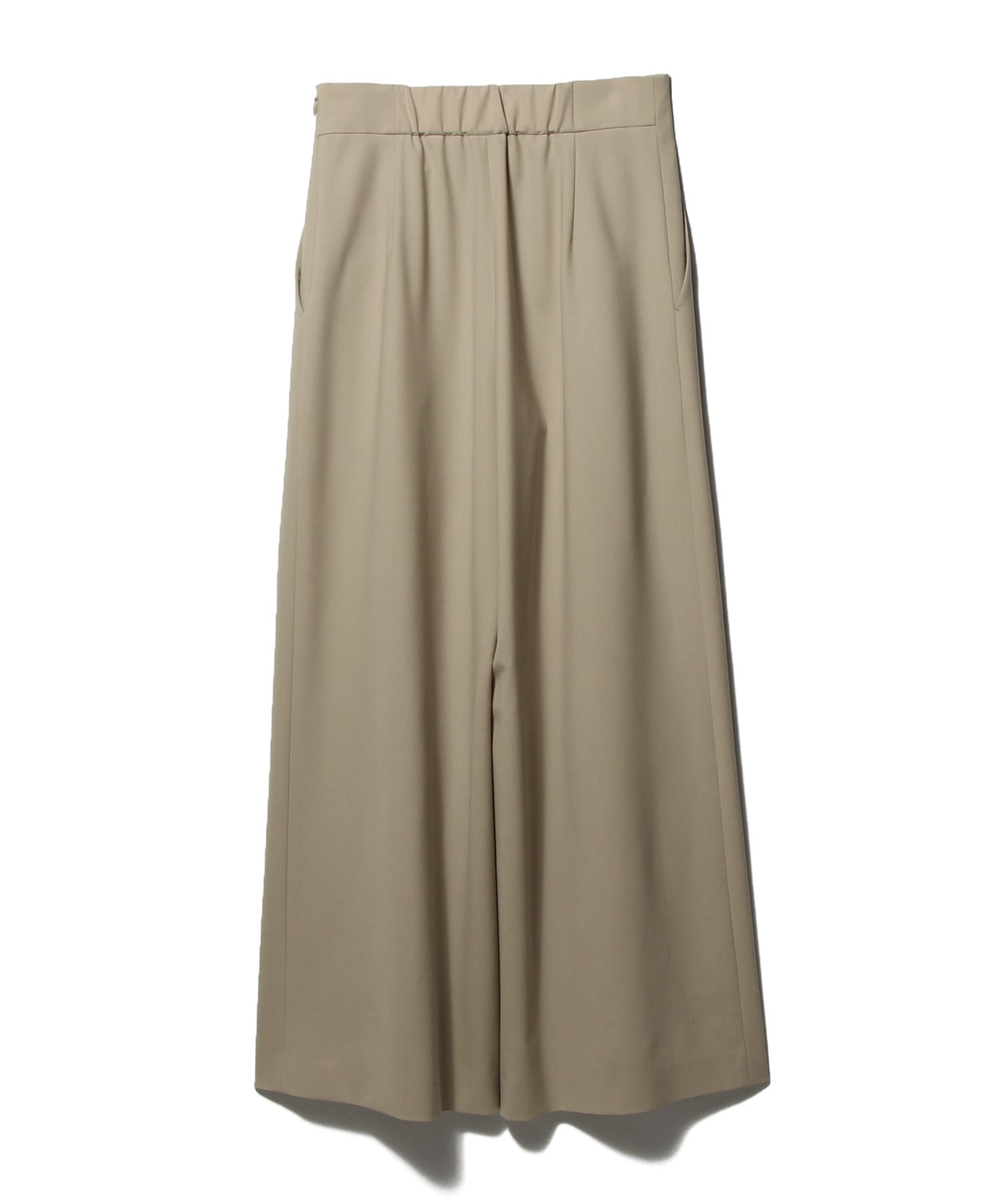 足長効果のあるハイウエストでお腹周りはすっきりとしながらも、ヒップライン辺りからボックスタックを施し、裾に向かって贅沢に広がるワイドシルエットのデザイン。後ろはゴム仕様で着心地の良さも嬉しいポイントです。