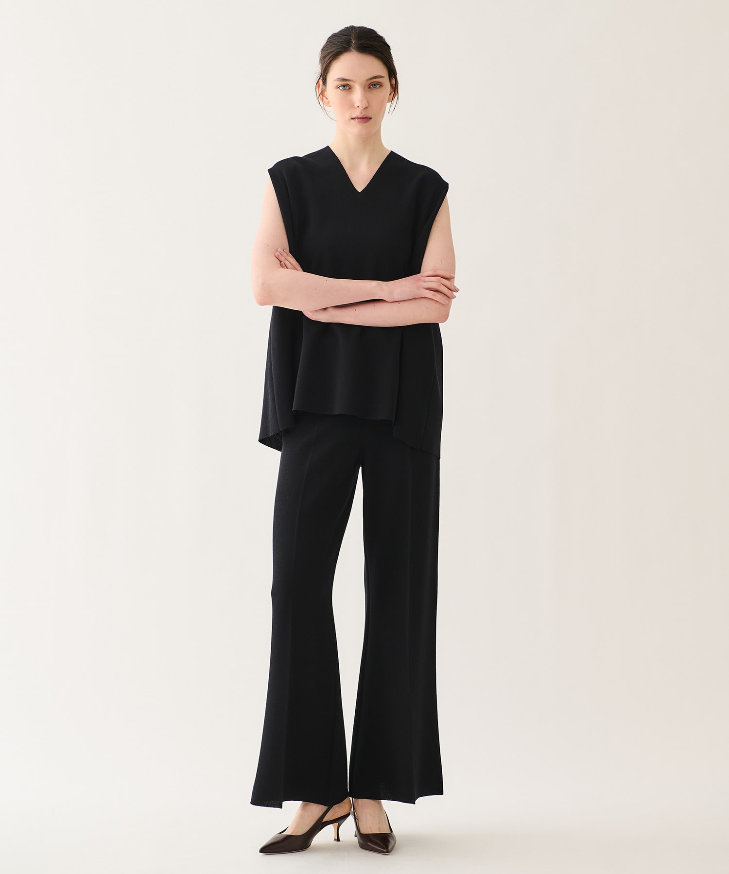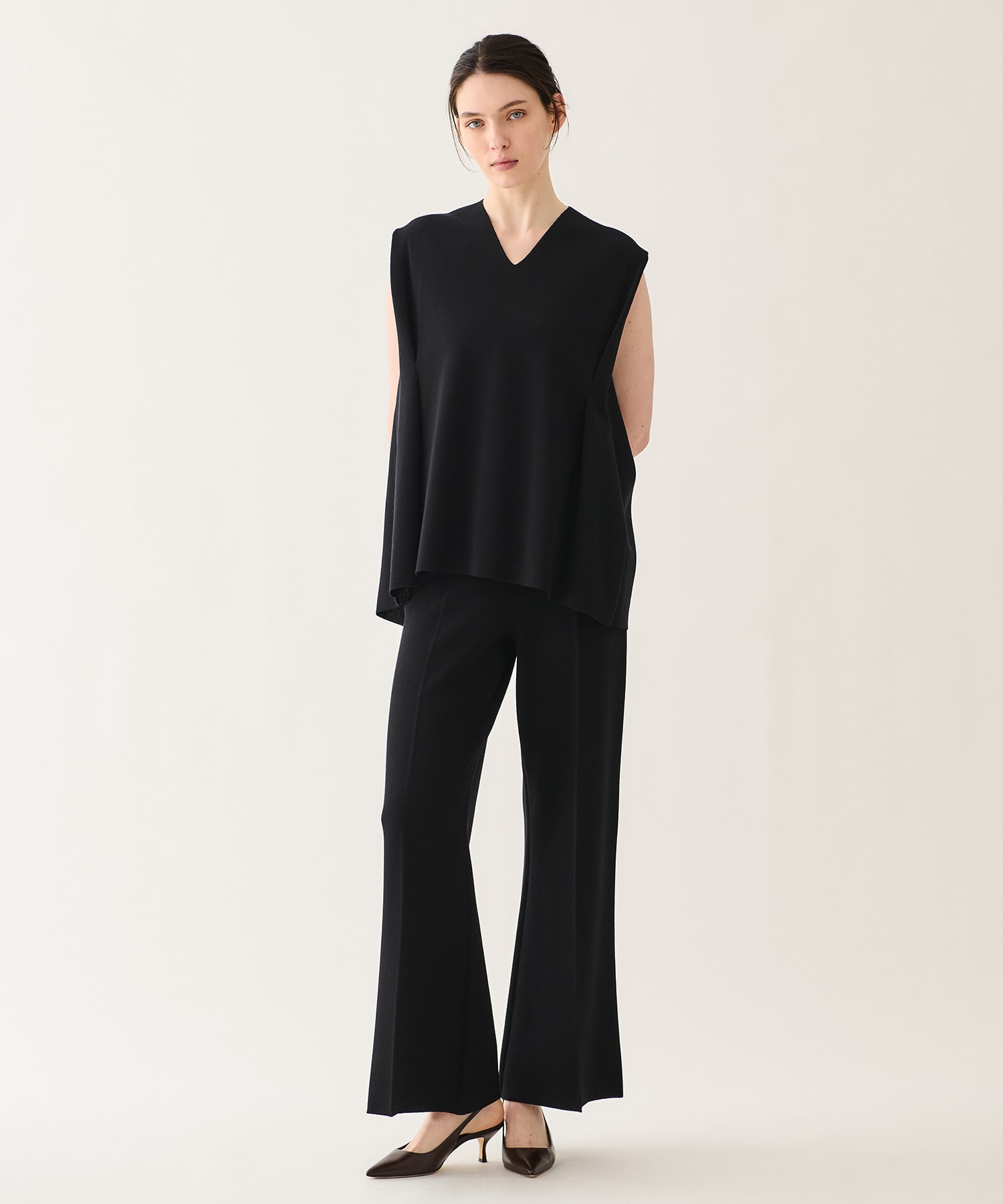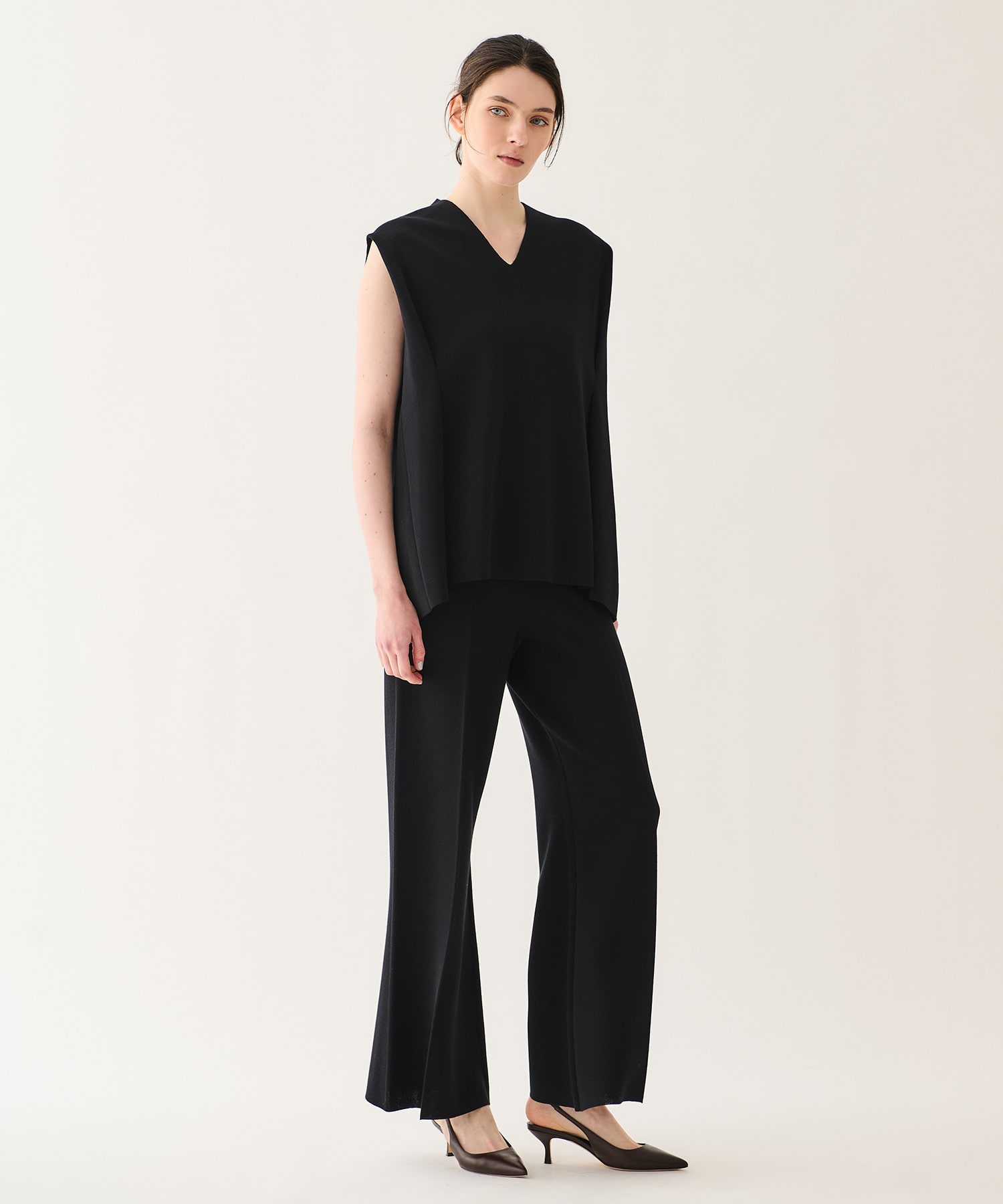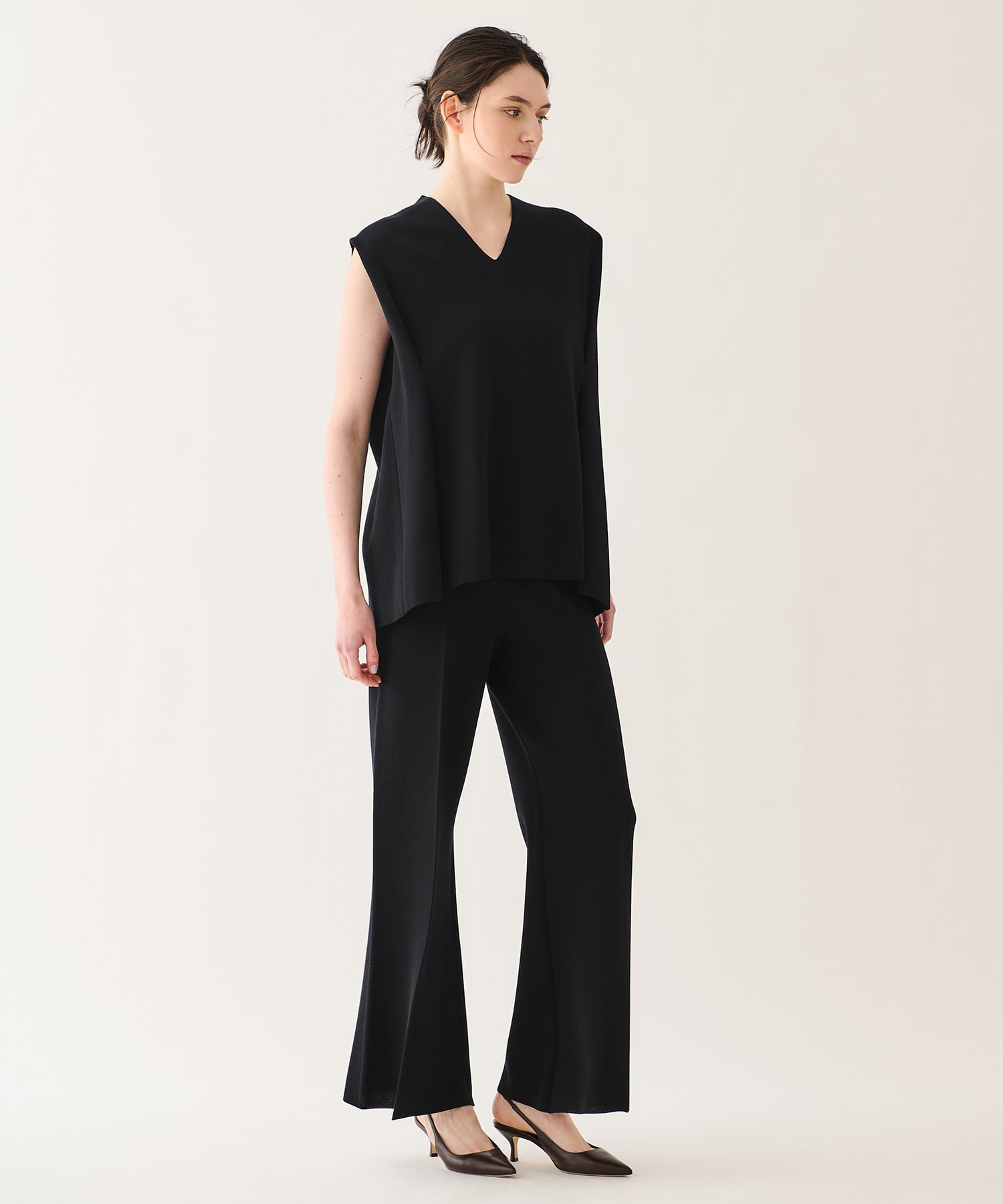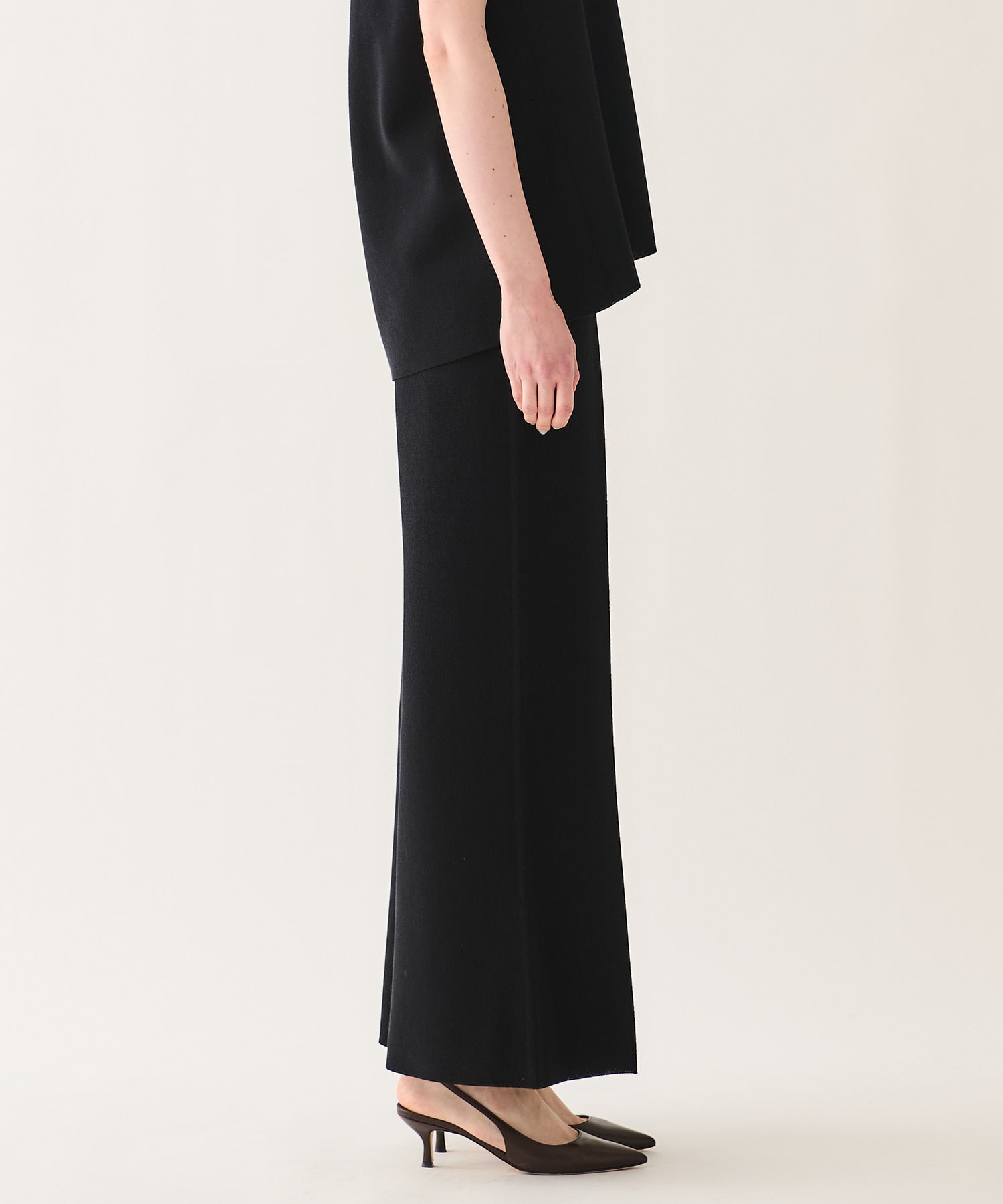 ゆとりがありながらも、膝位置をわずかに絞ることで、ワイドでもすっきりと綺麗に見えるよう計算されたシルエットです。