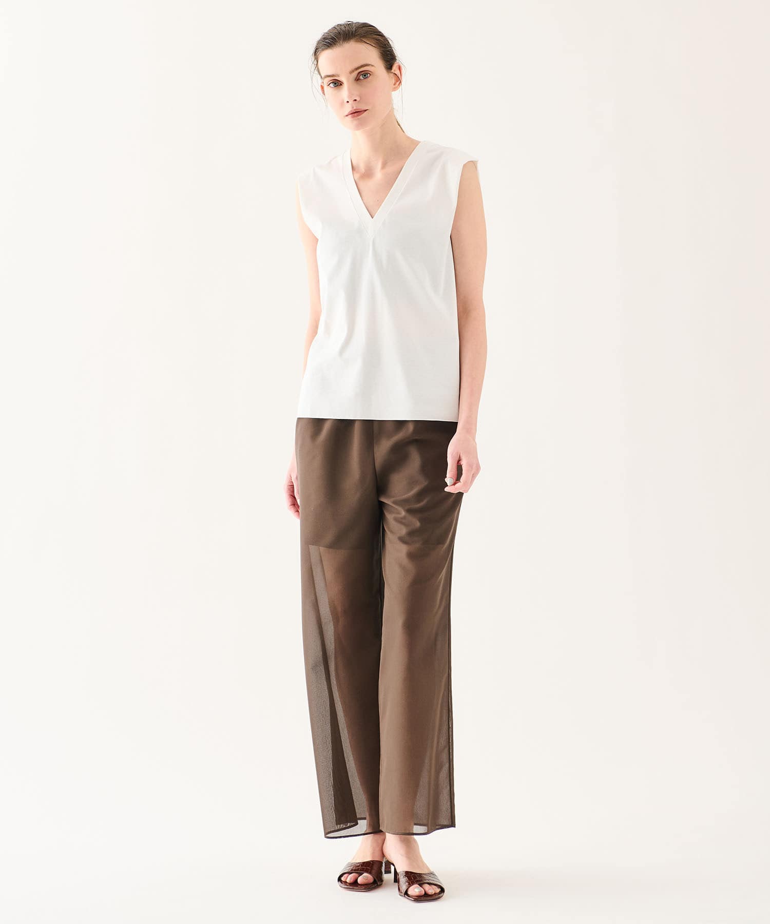 張り感を出す加工をし、風合いにも拘った別注素材を使用。シアーな軽さのある素材で清涼感のあるアイテムに仕上げています。やや光沢感があり、上品見えするのもポイントです。
