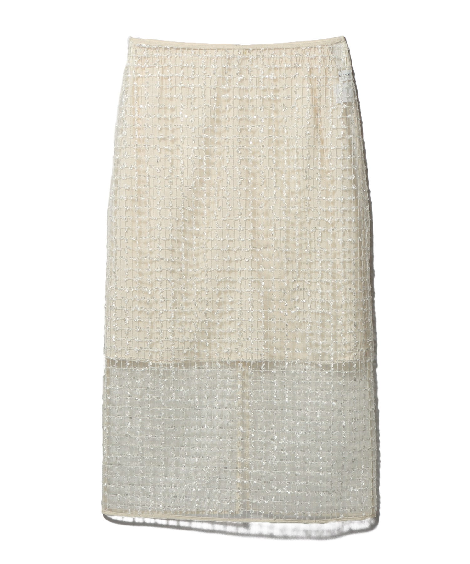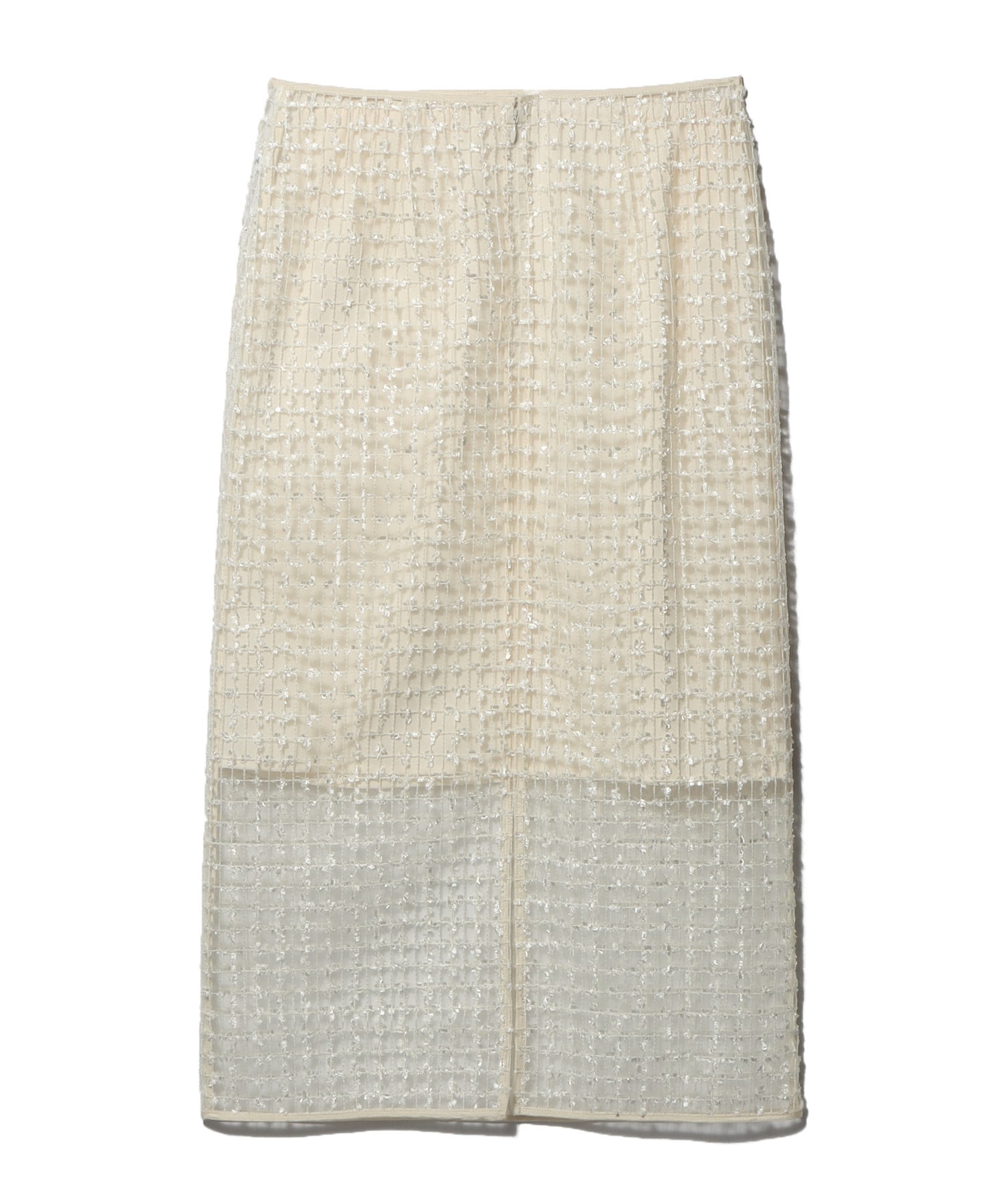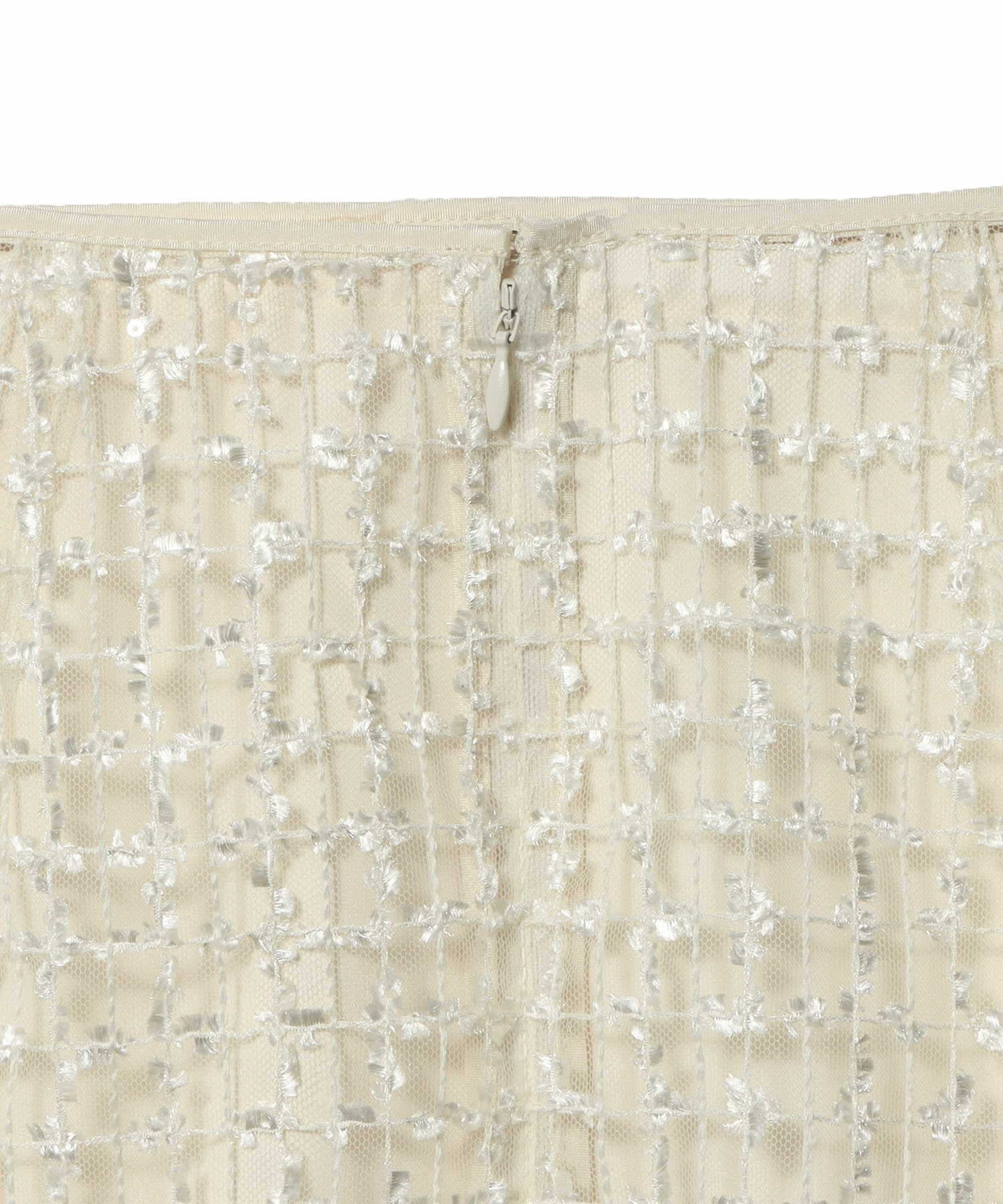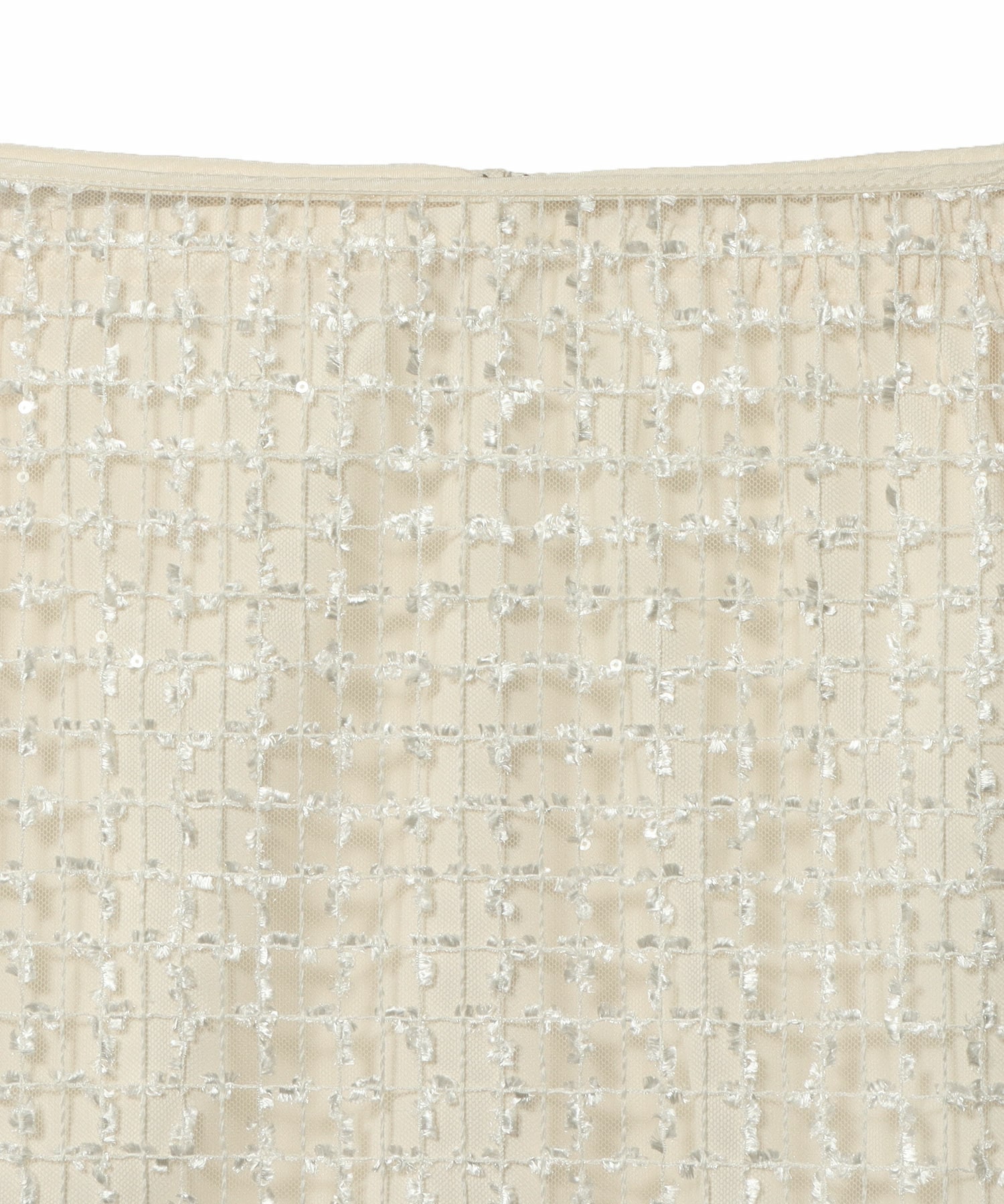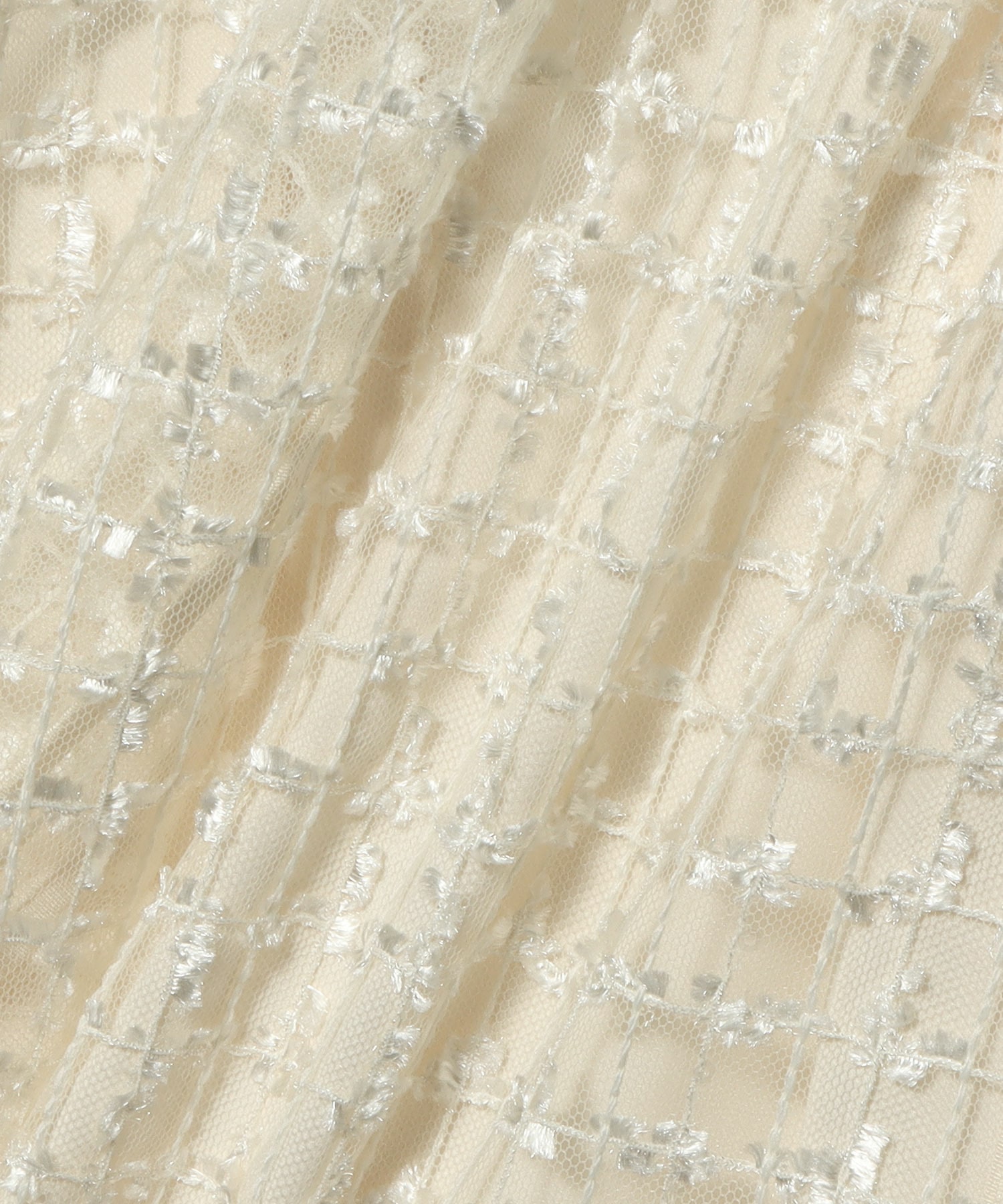 繊細なチュール地に、フェザーヤーンとスパンコールでチェック柄に刺繍を入れた立体感のあるオリジナル素材。とっても涼しく、真夏でもストレスなく着て頂けるデザインです。