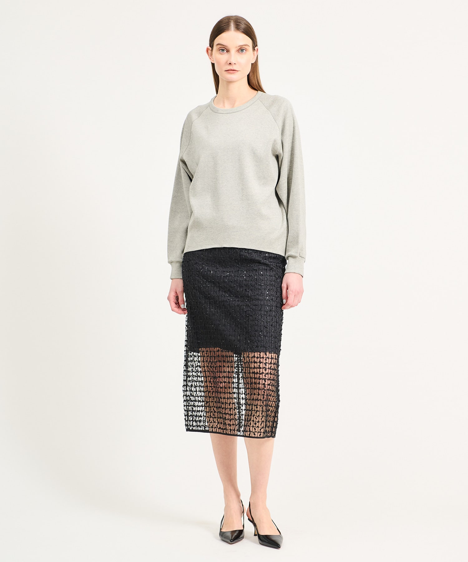 ヒップハングで着用するIラインが印象的なスカート。