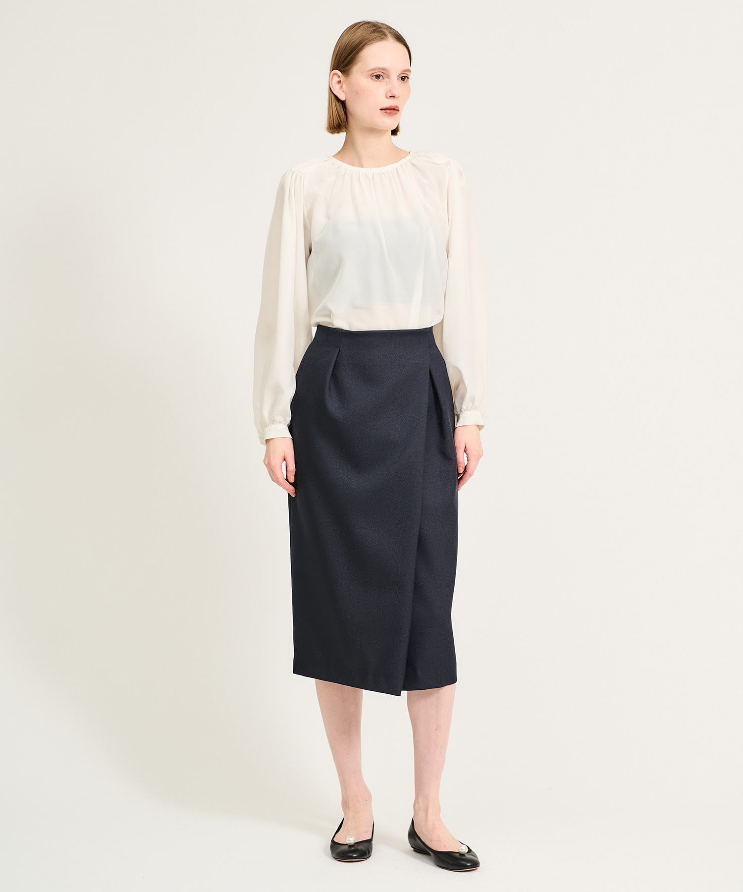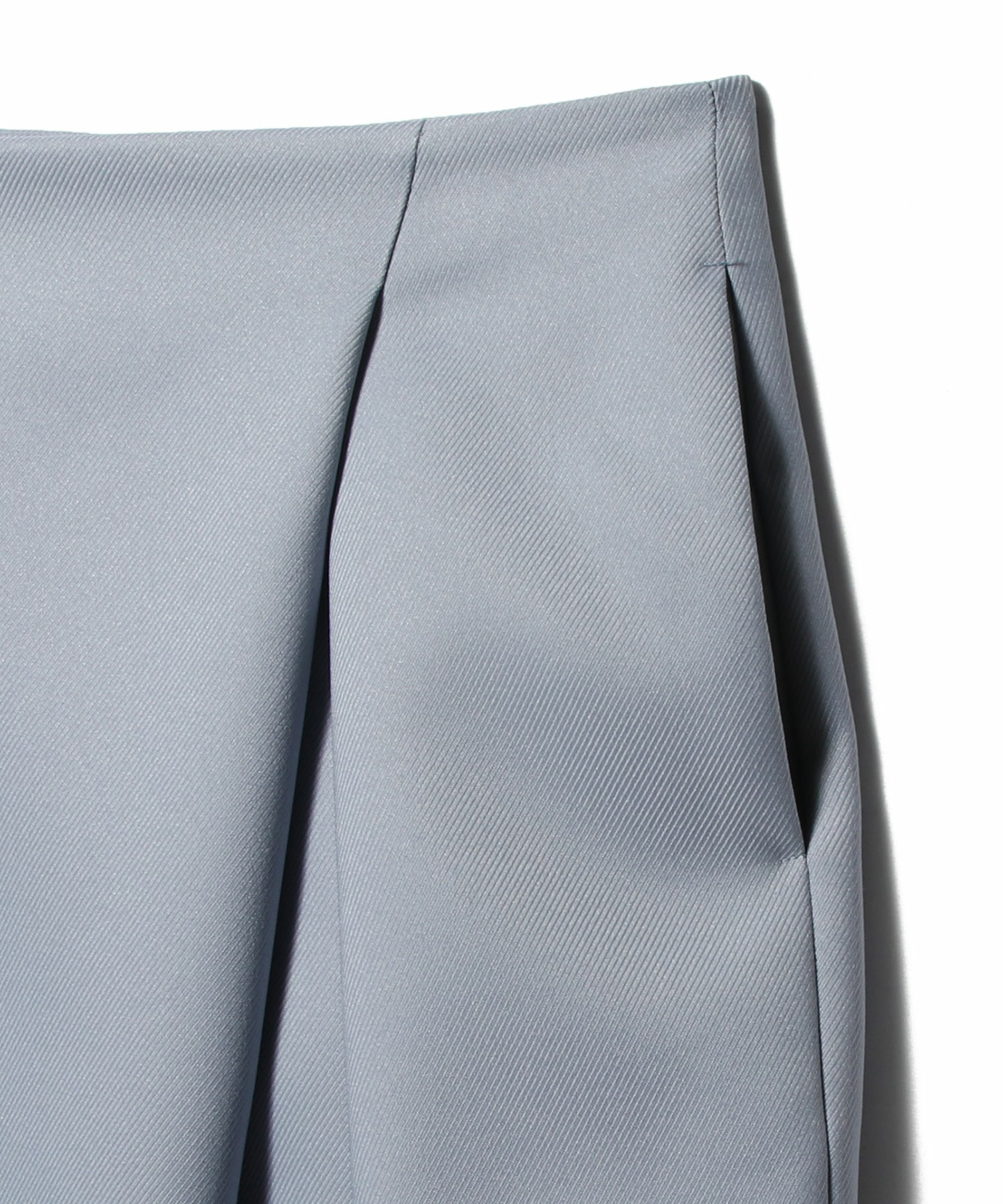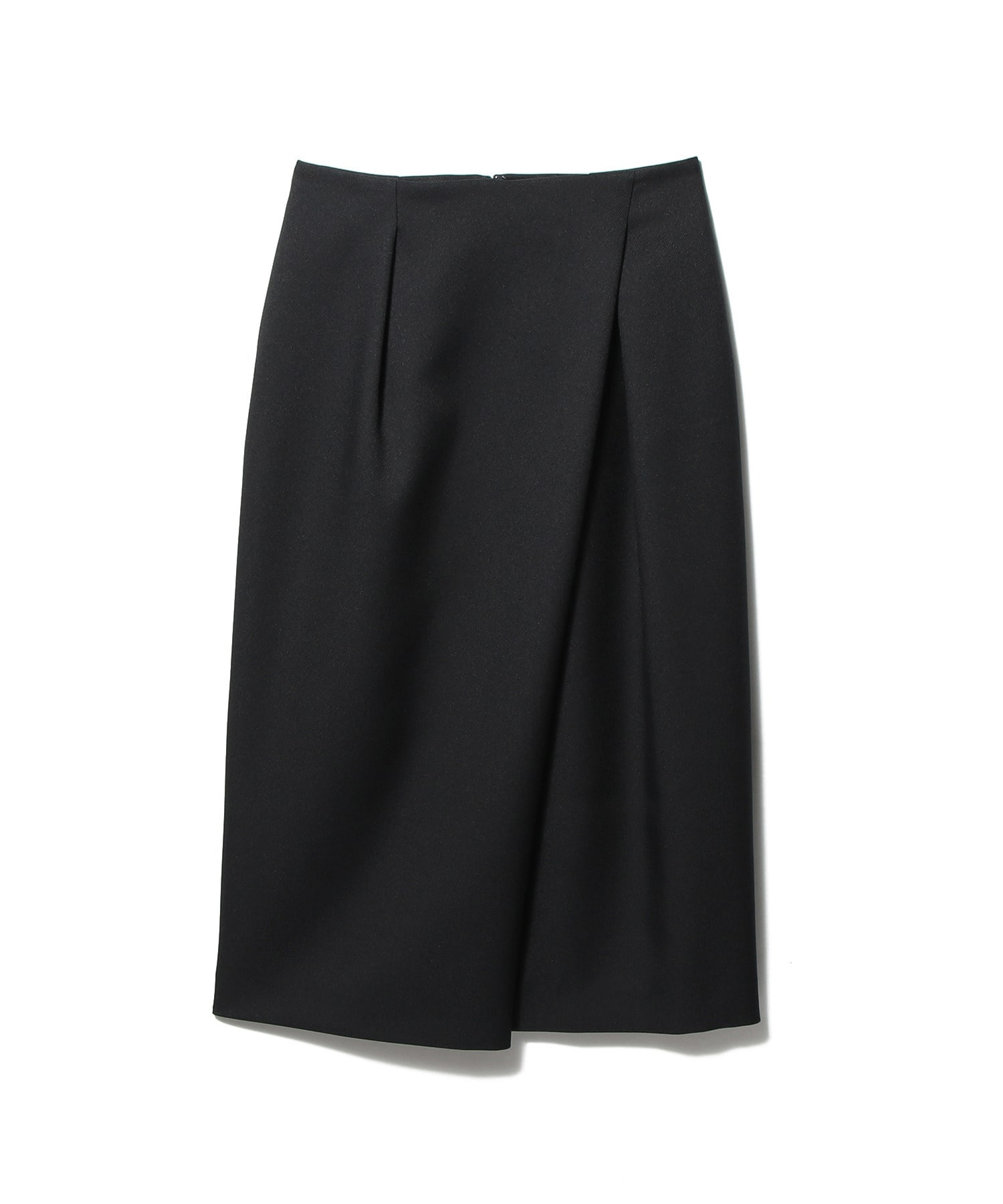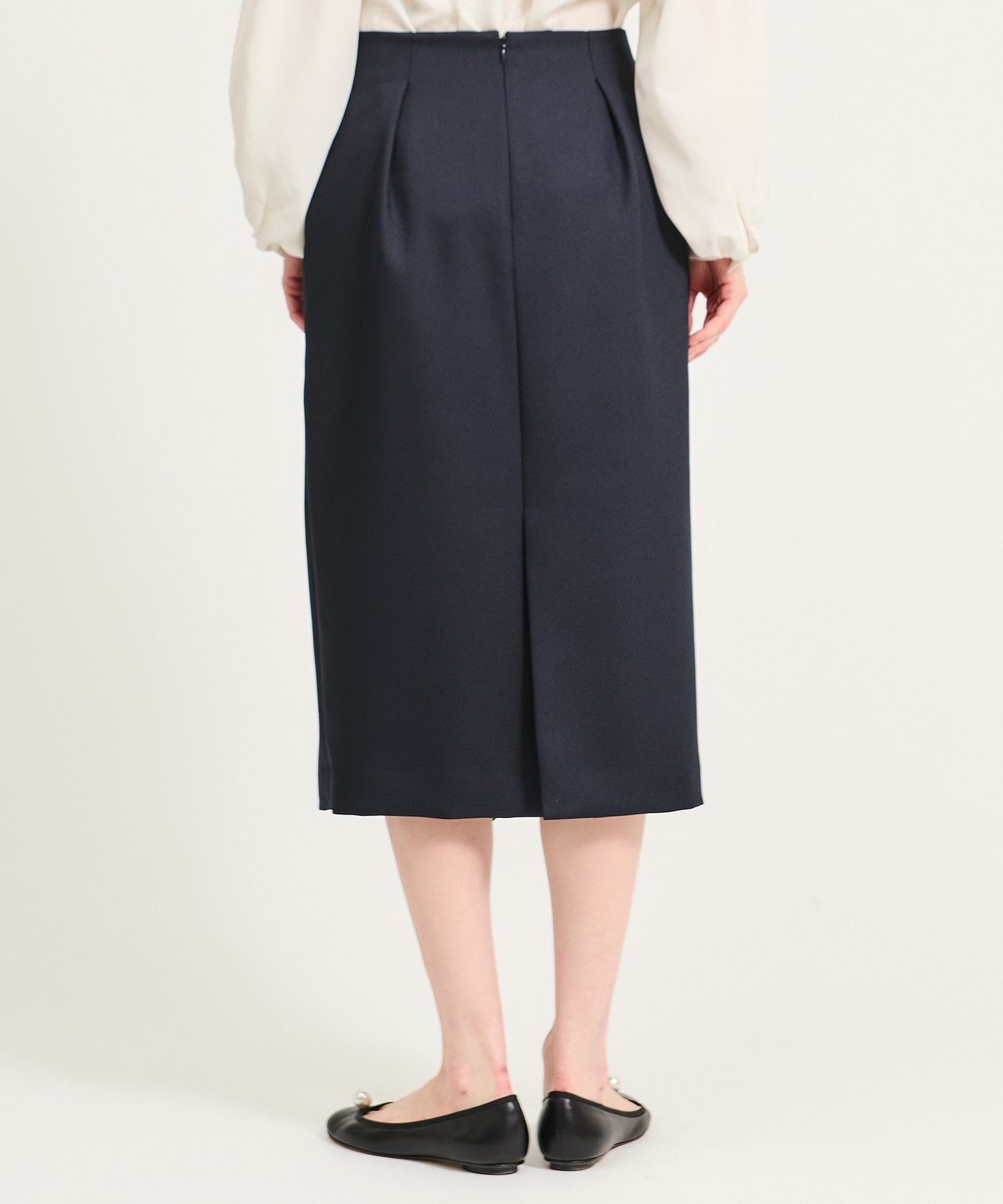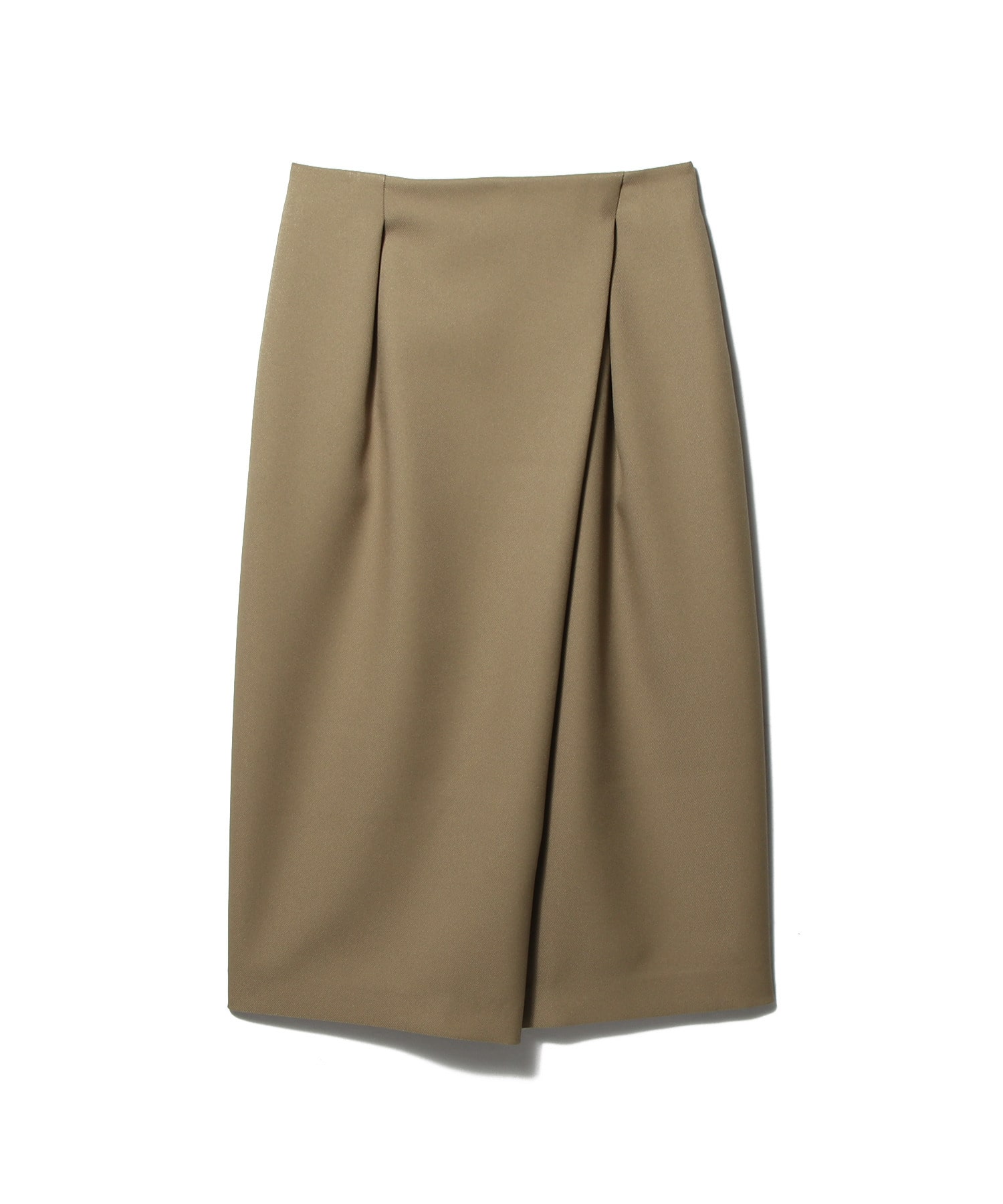 脚を美しく見せる膝下のミディ丈に、斜めに施したイレギュラーなタックがアクセント。