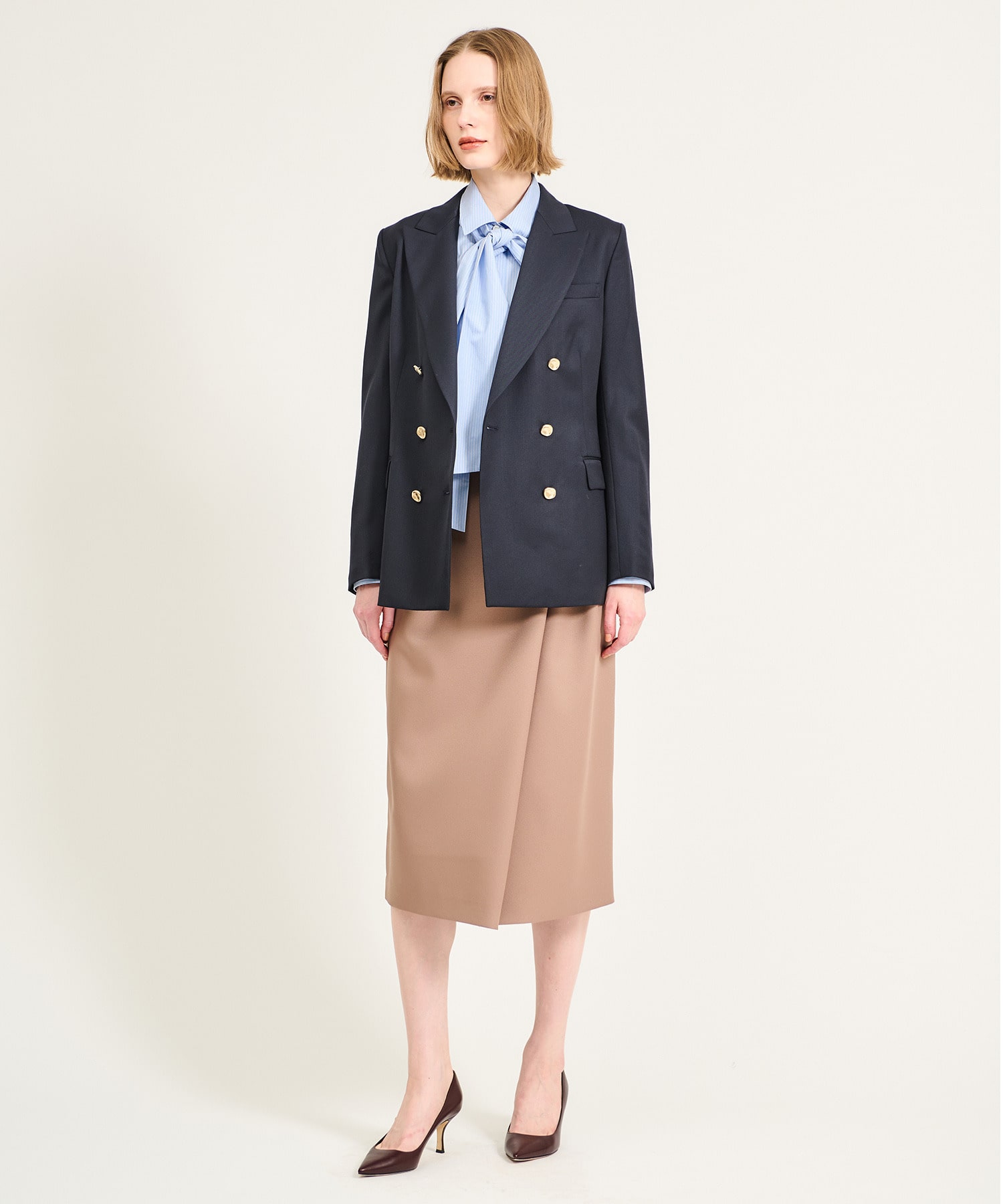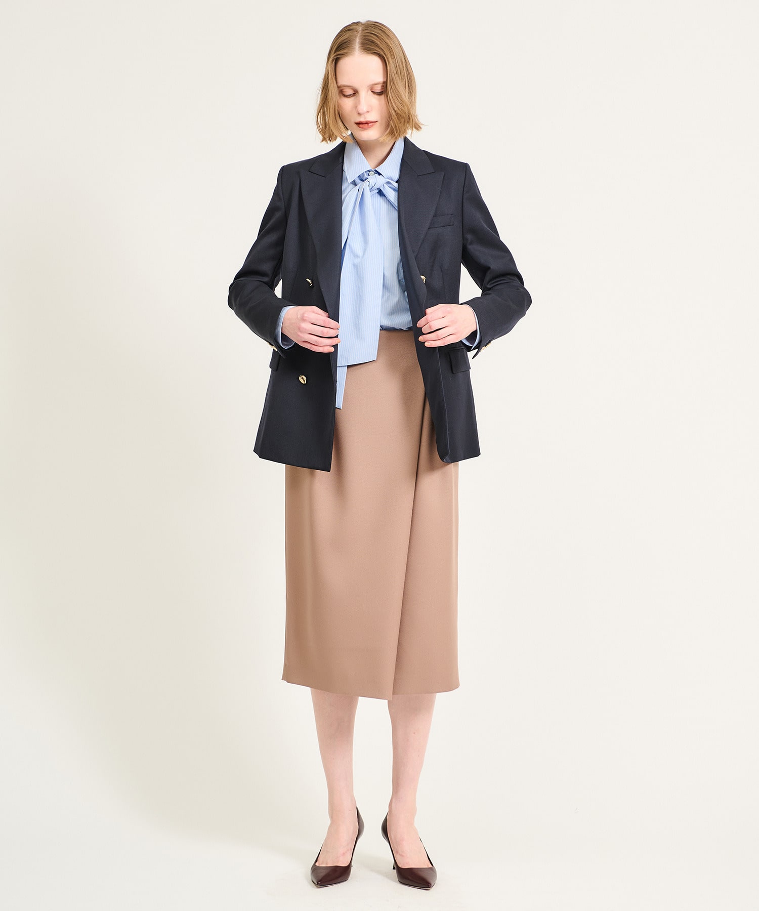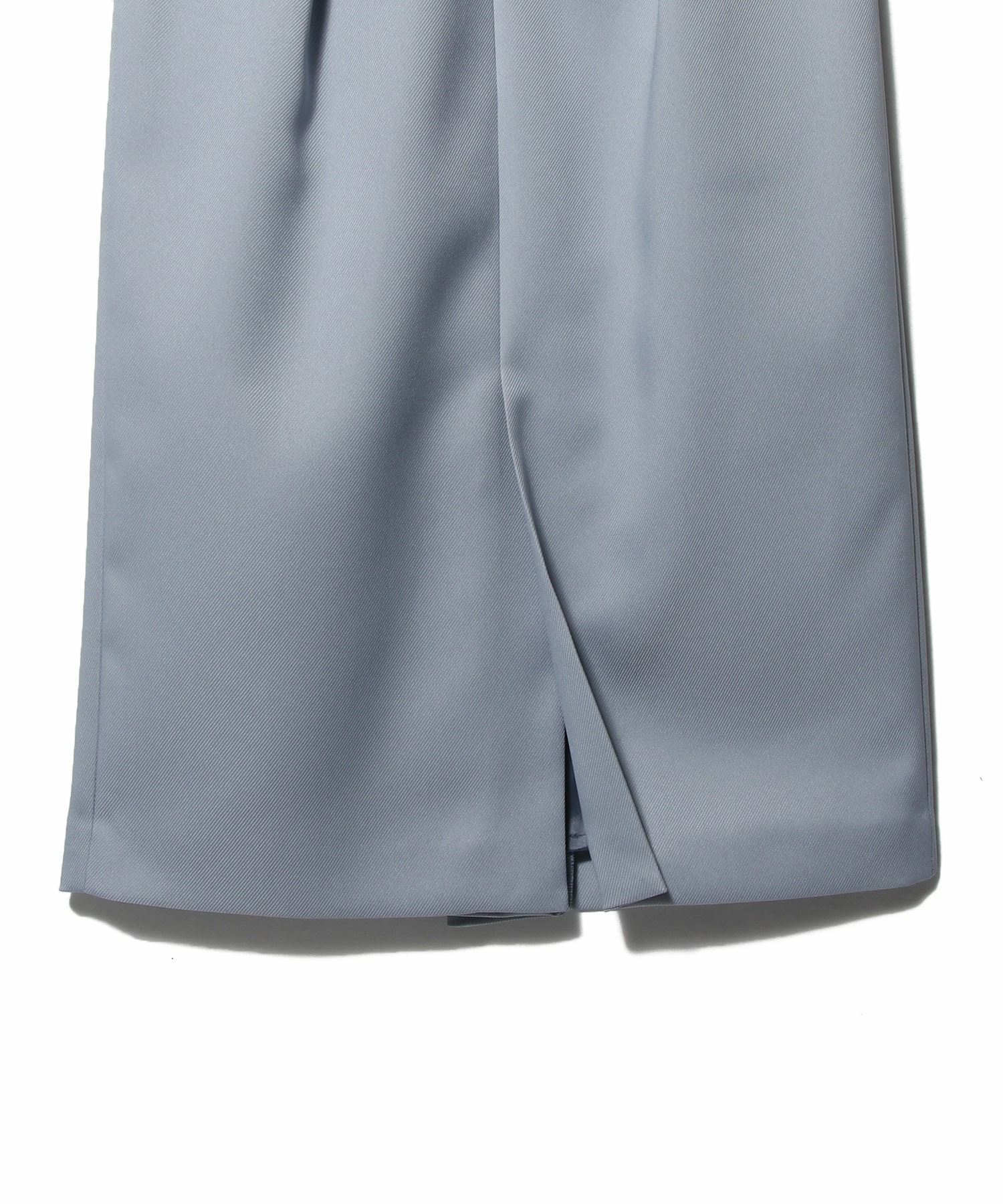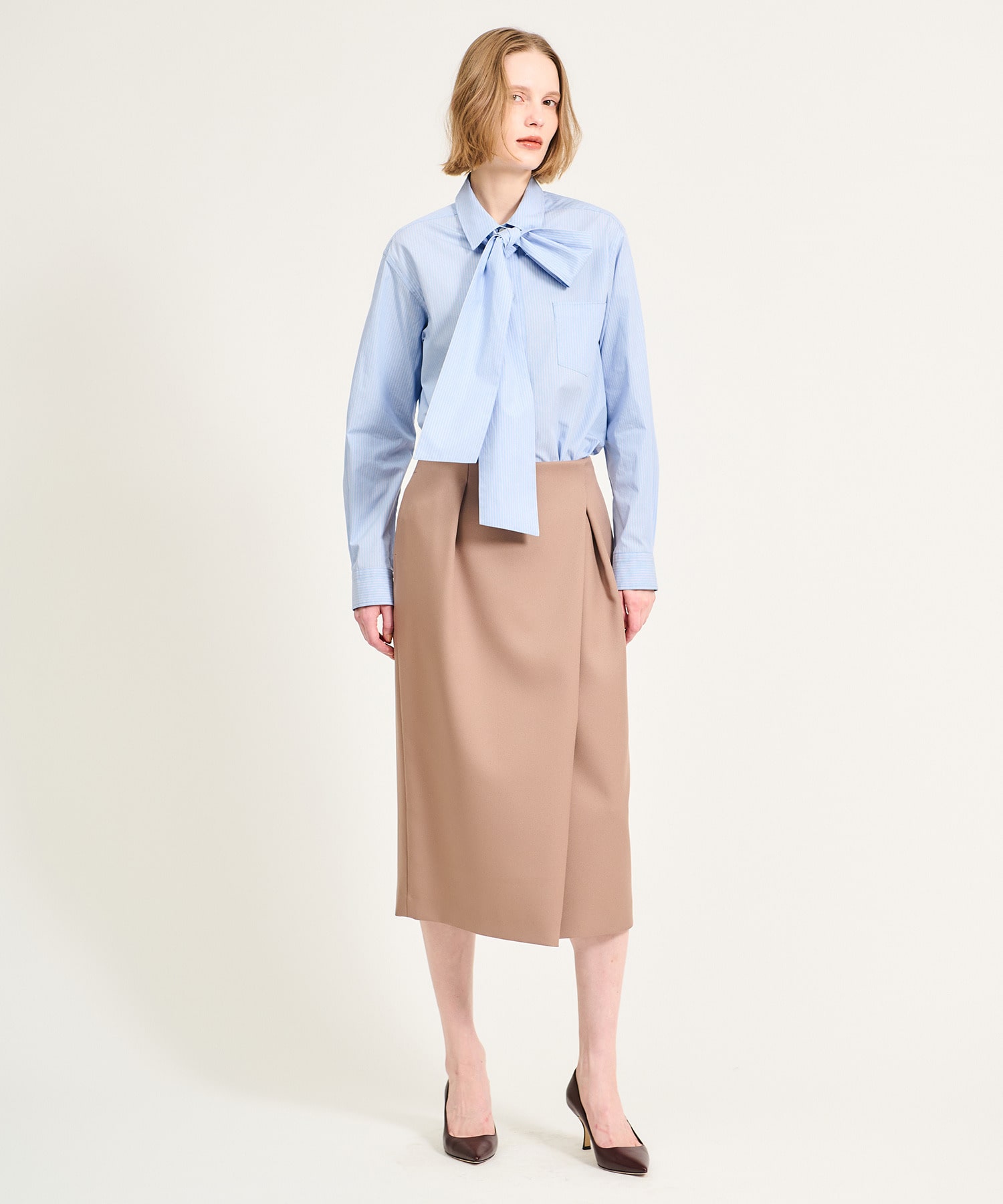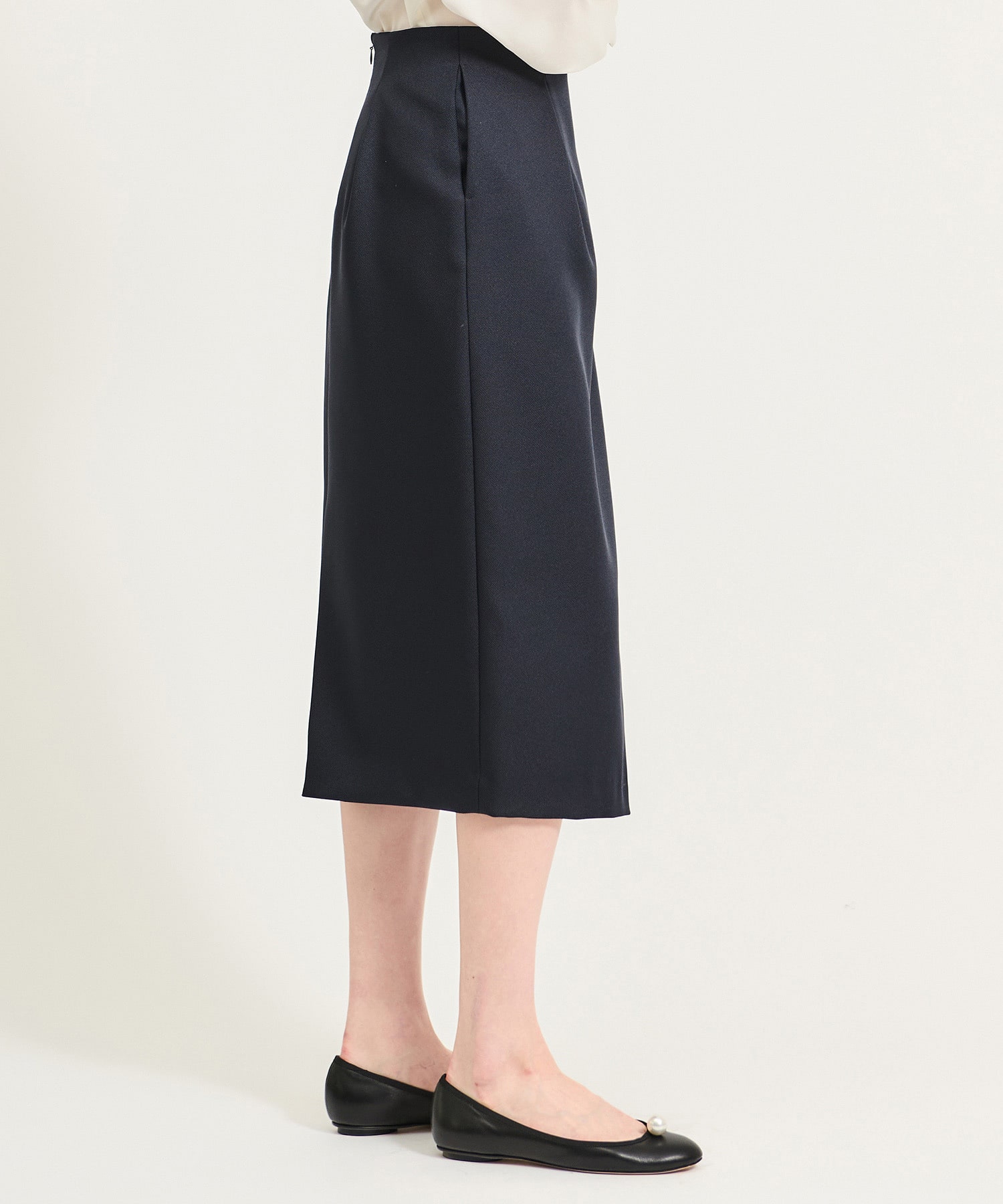 脚を美しく見せる膝下のミディ丈に、斜めに施したイレギュラーなタックがアクセント。