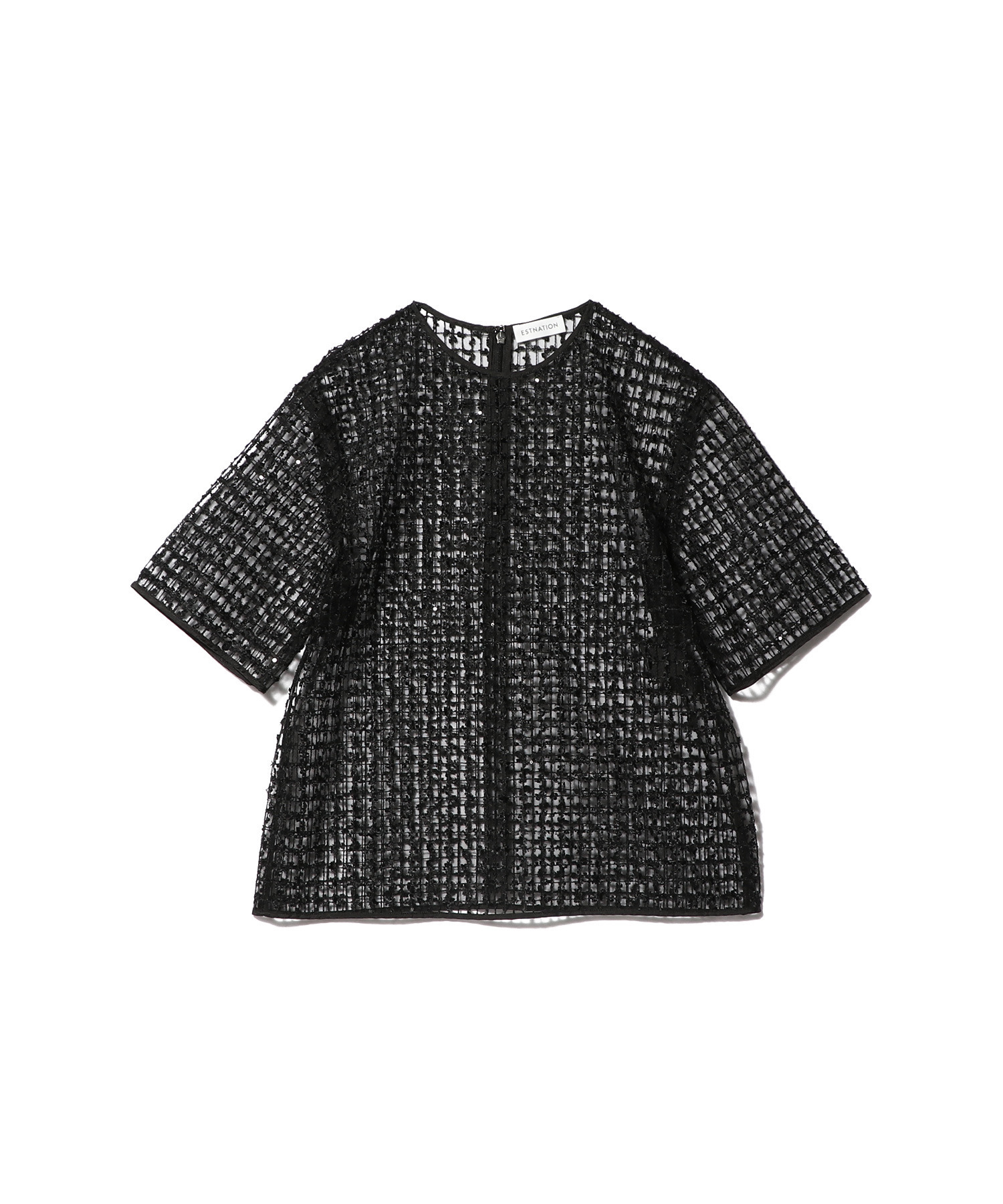 繊細なチュール地に、フェザーヤーンとスパンコールでチェック柄に刺繍を入れた立体感のあるオリジナル素材。とっても涼しく、真夏でもストレスなく着て頂けるデザインです。