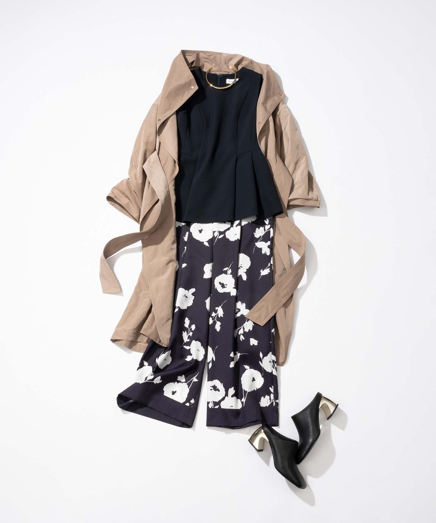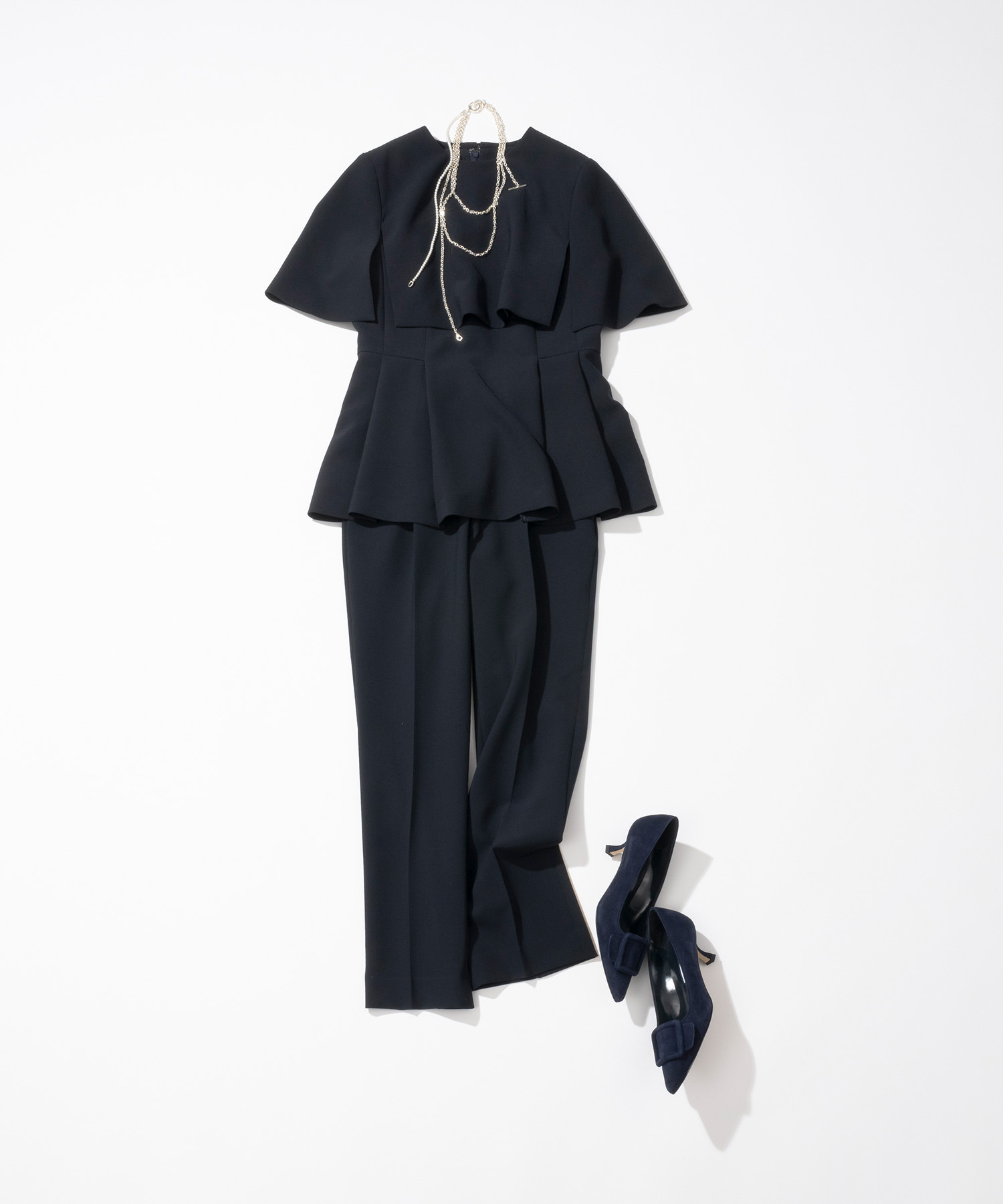 ウエストから裾にかけて大きく取ったタックとフレアでシルエットを出しています。