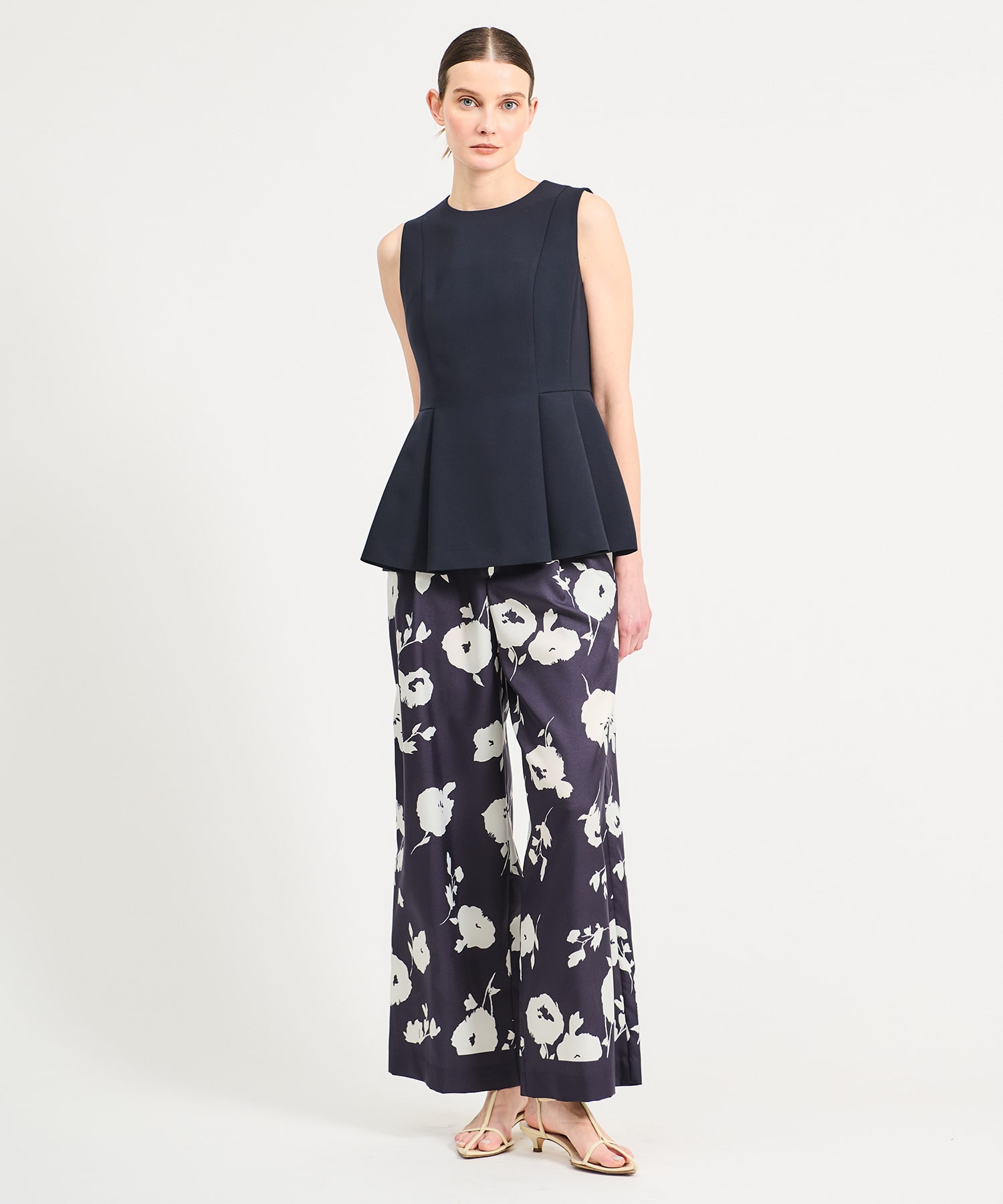 ウエストから裾にかけて大きく取ったタックとフレアでシルエットを出しています。