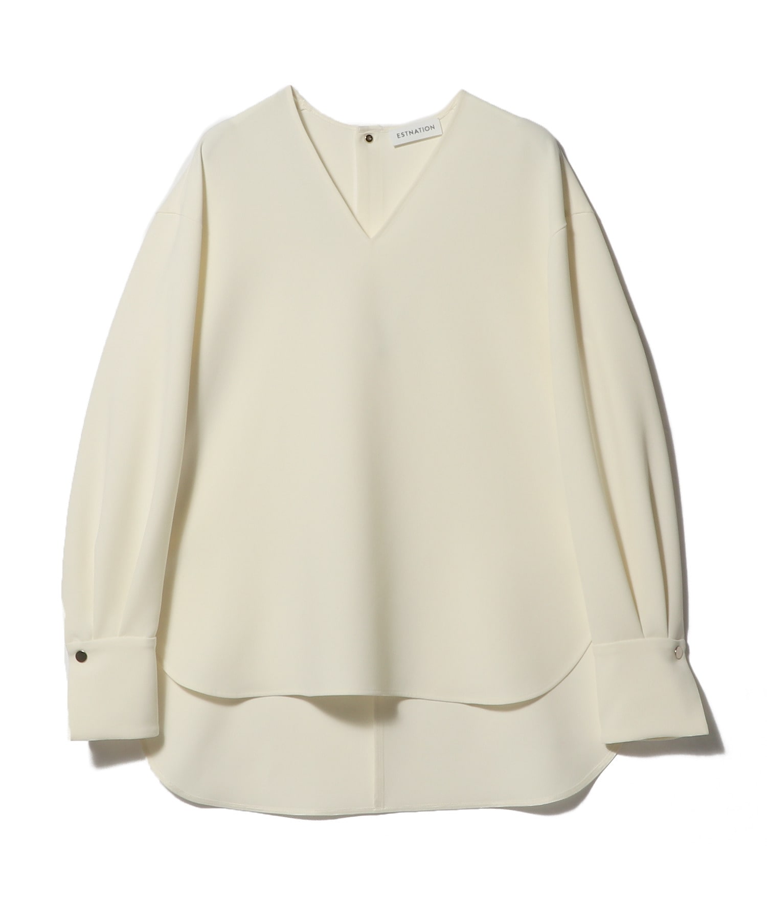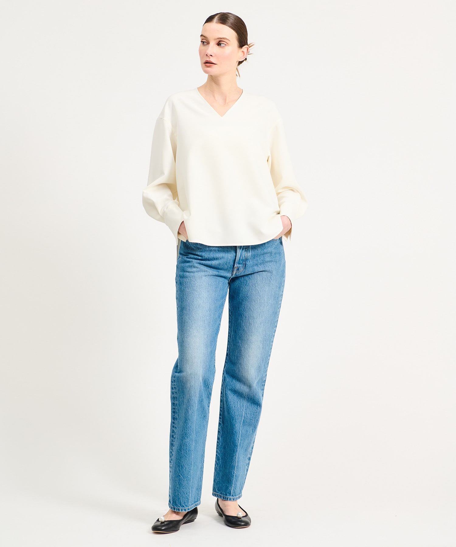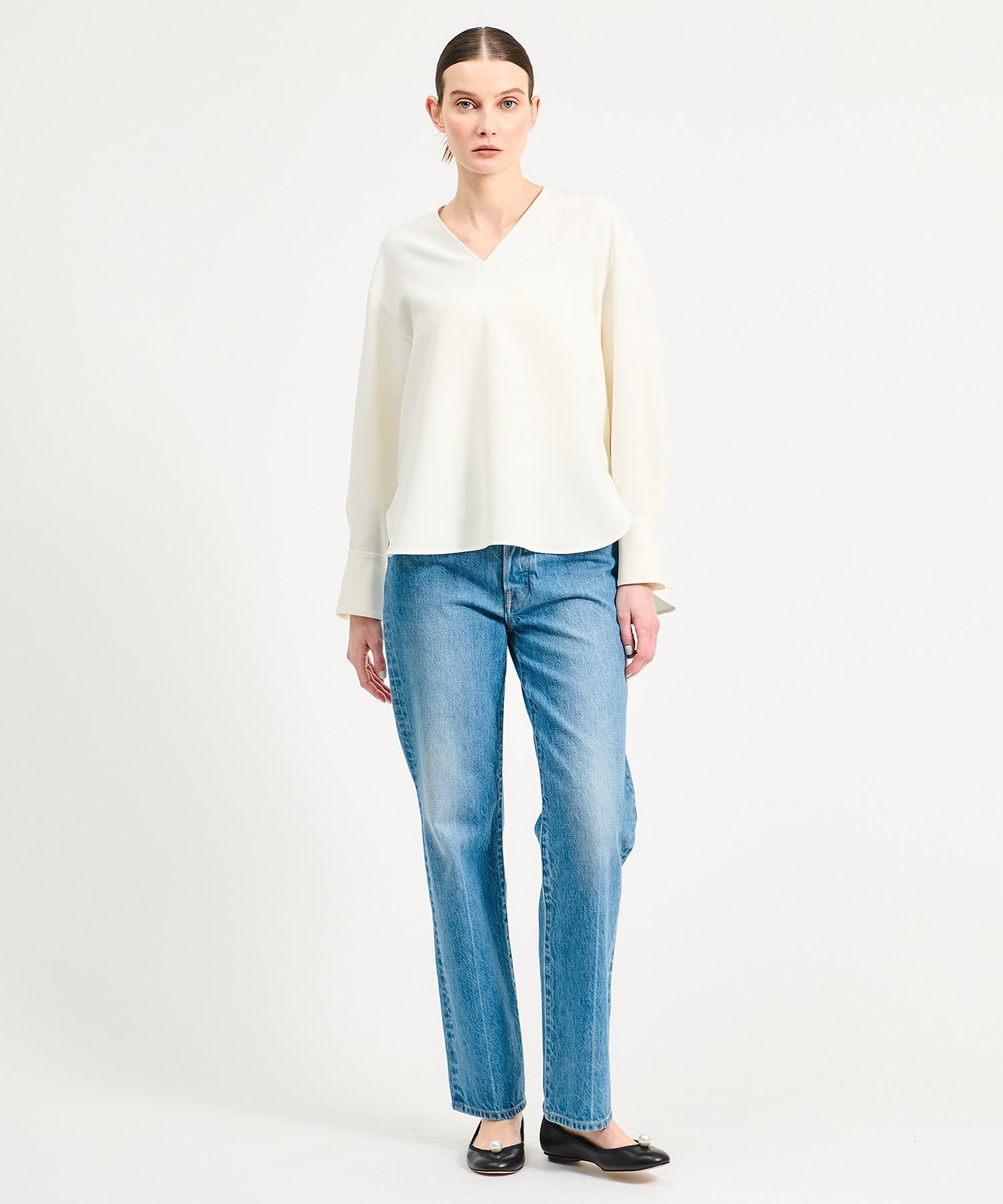 ややゆったりとしたシルエットに、顔周りをすっきりと見せる深めのVネックが印象的なブラウス。