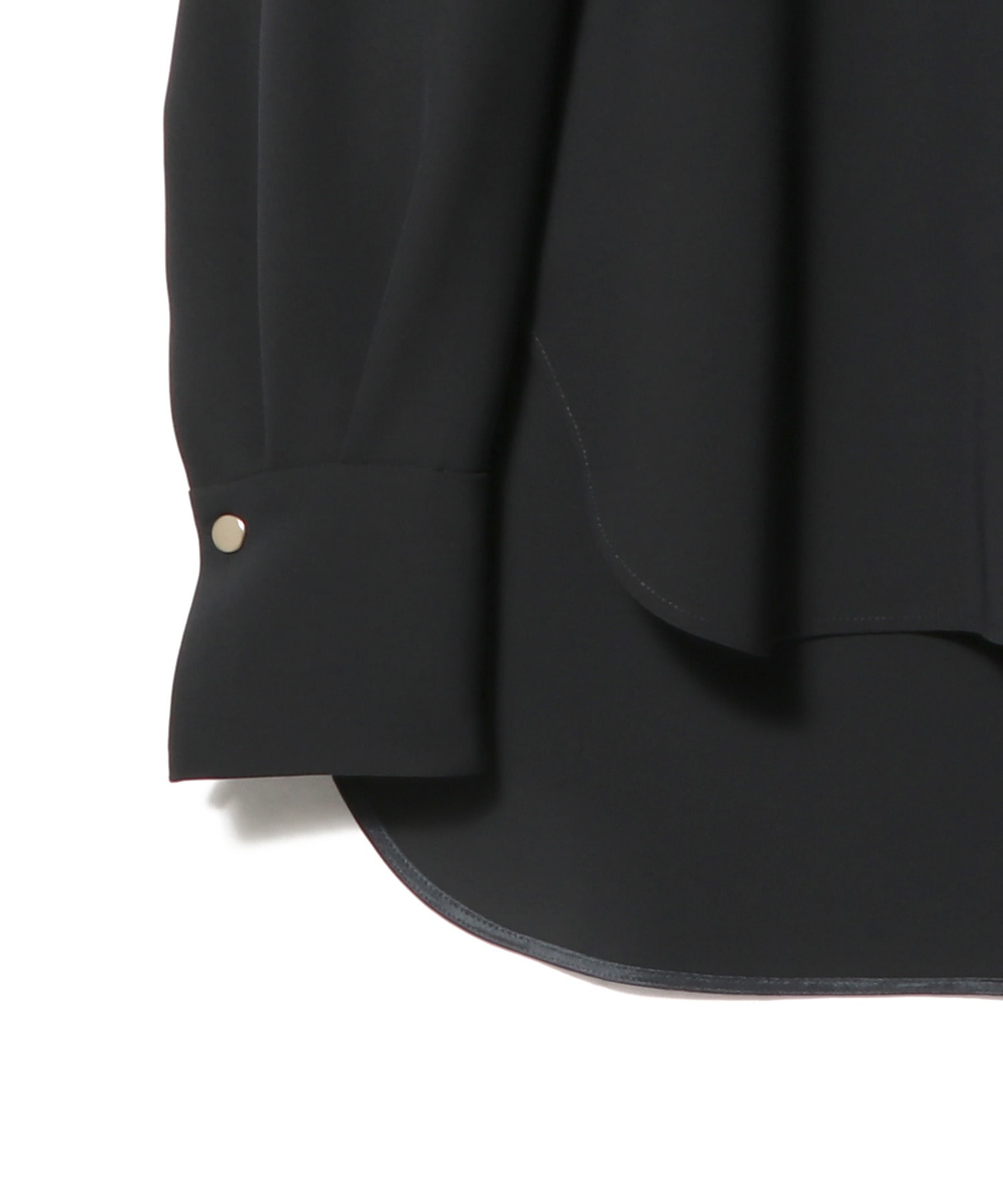 袖口は広めのカフス仕様にすることで、甘くなりすぎずマスキュリンな印象に仕上げています。袖口とセンターバックには、さりげなく光るドットボタンをあしらい、シンプルな中に程よいアクセントをプラス。